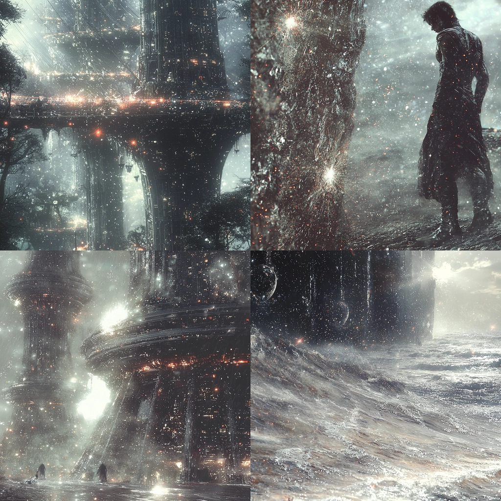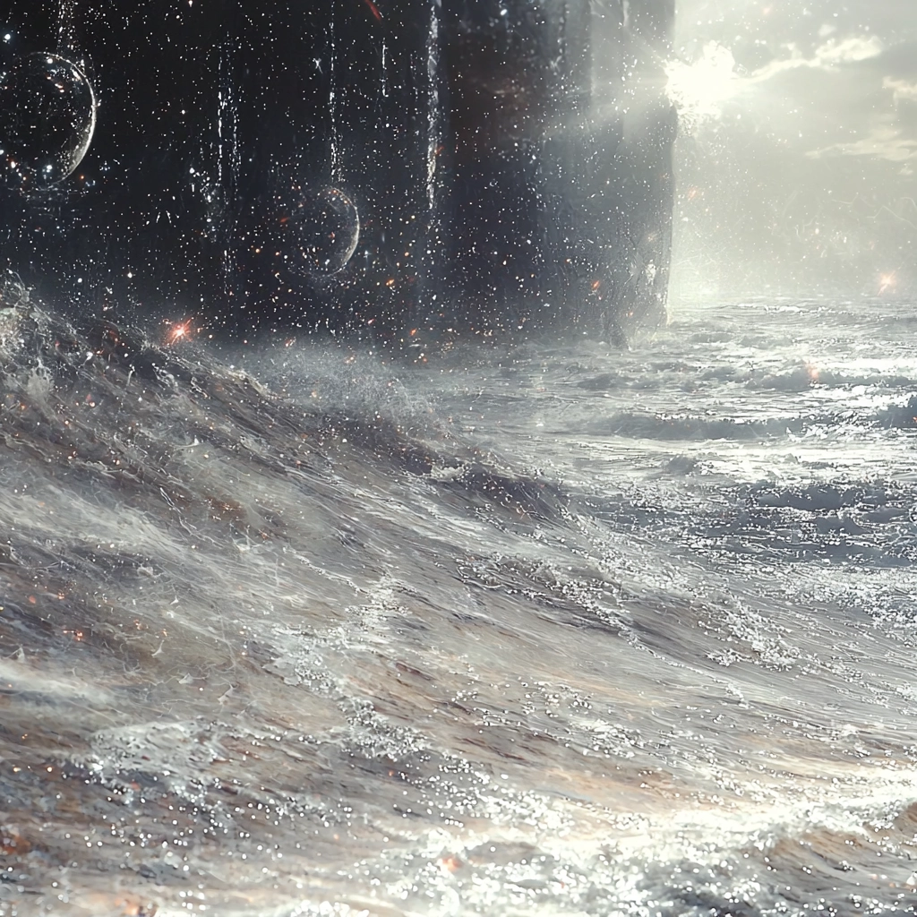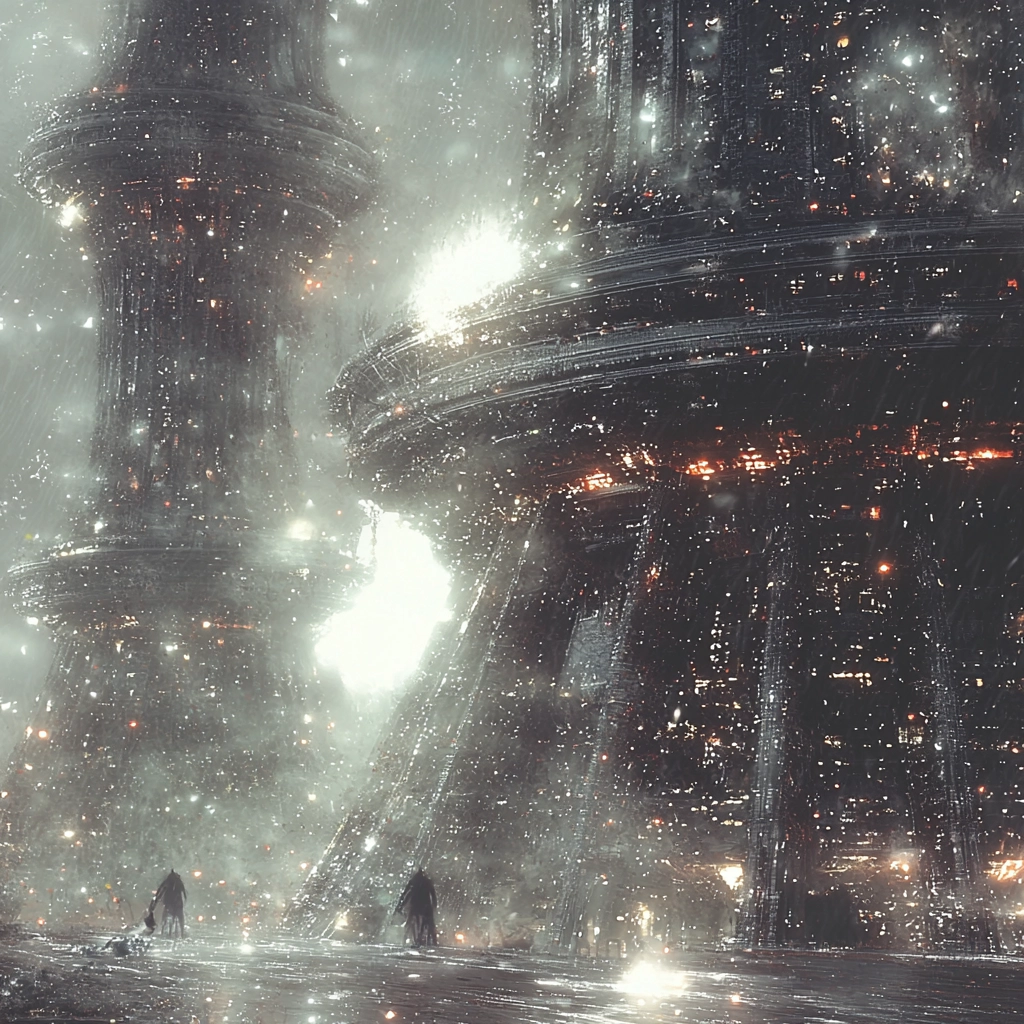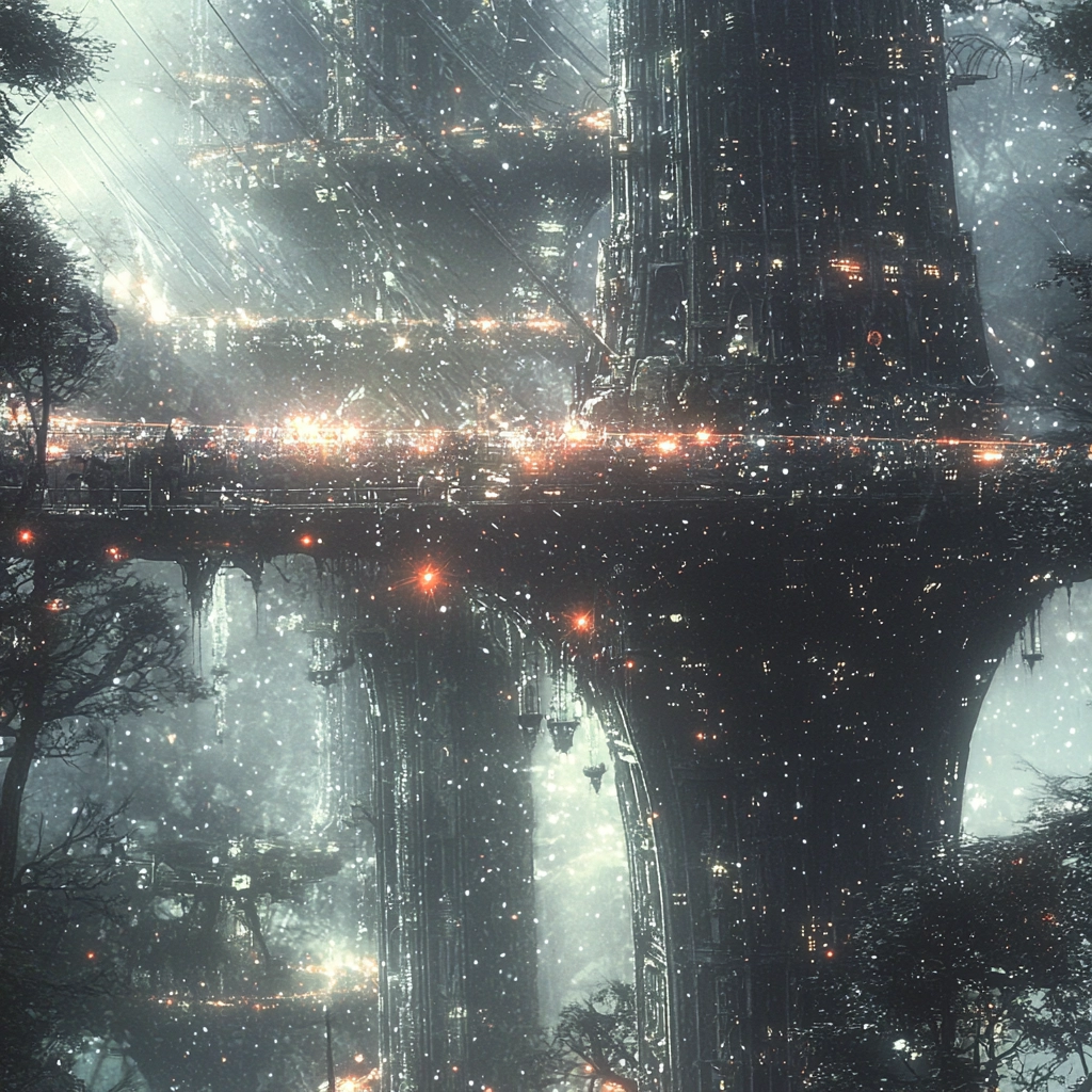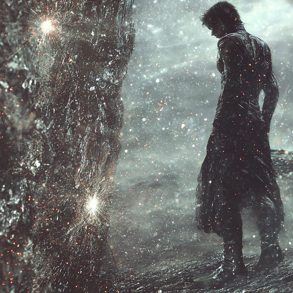 The lighting effects emphasize the contrast between the subdued background and the shimmering points of light, creating a sense of depth and texture. Color gradients and the interplay of dark and bright tones suggest a complex spatial arrangement while textures exhibit a crystalline clarity.