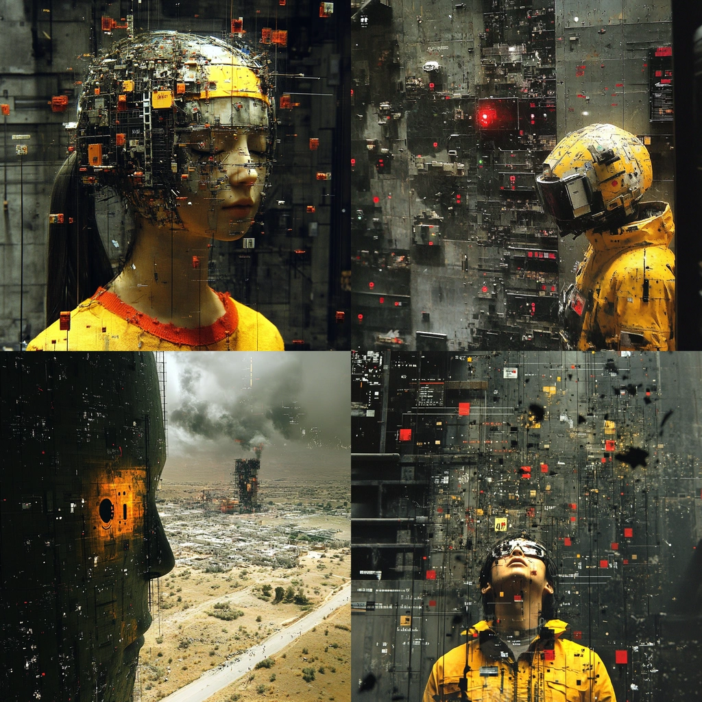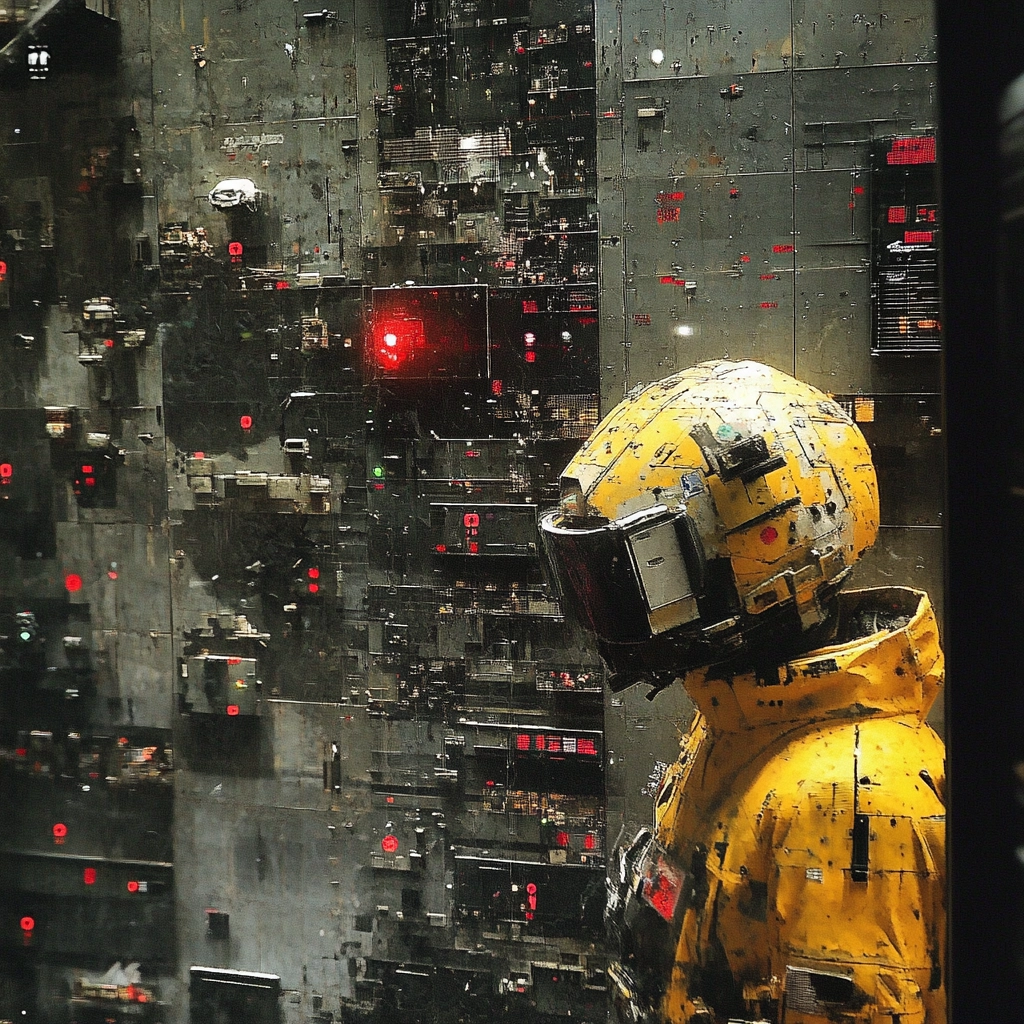 The composition integrates sharp lighting with deep black and yellow highlighting, punctuated by red elements. It conveys a grid-like spatial sense with intricate textural details and layered surfaces.