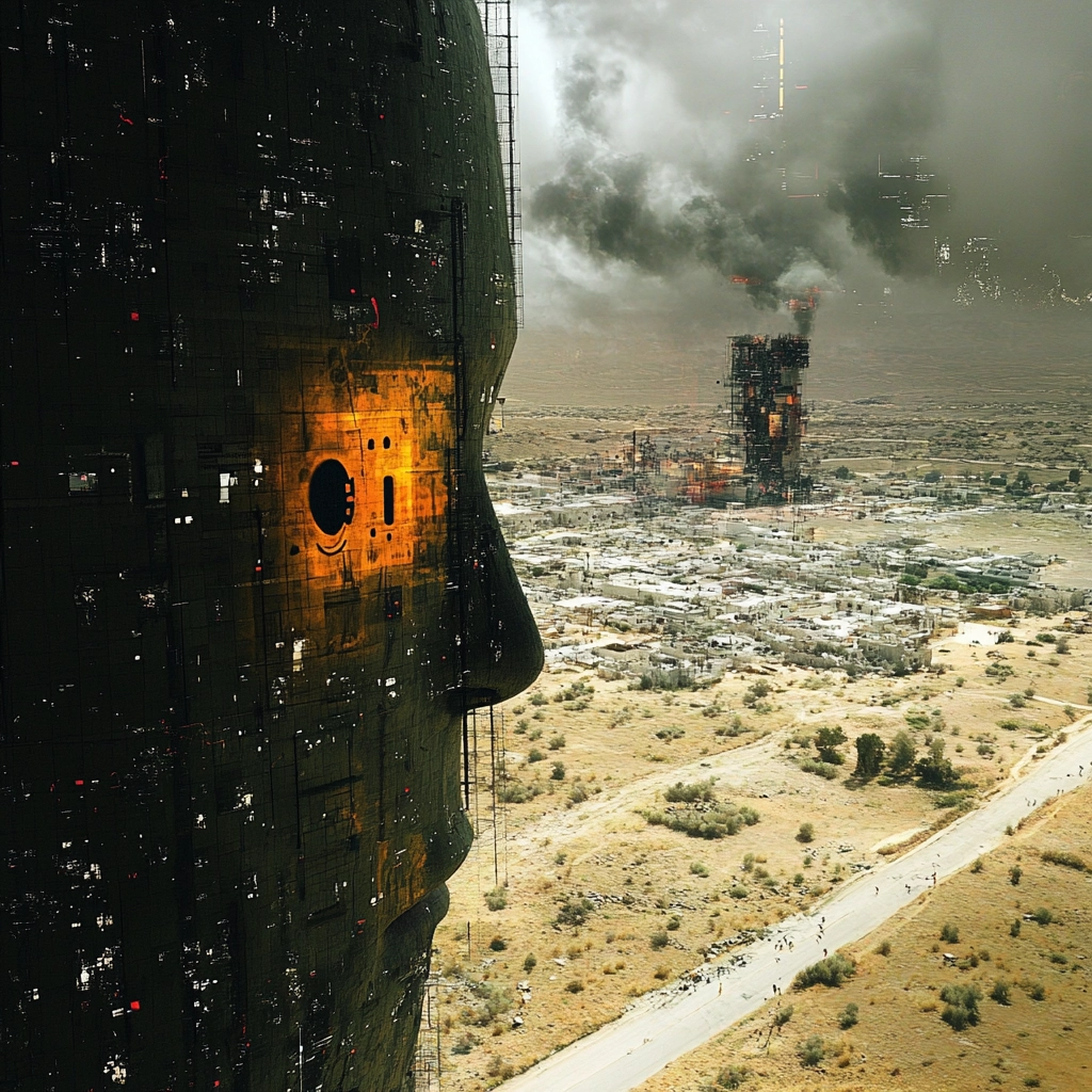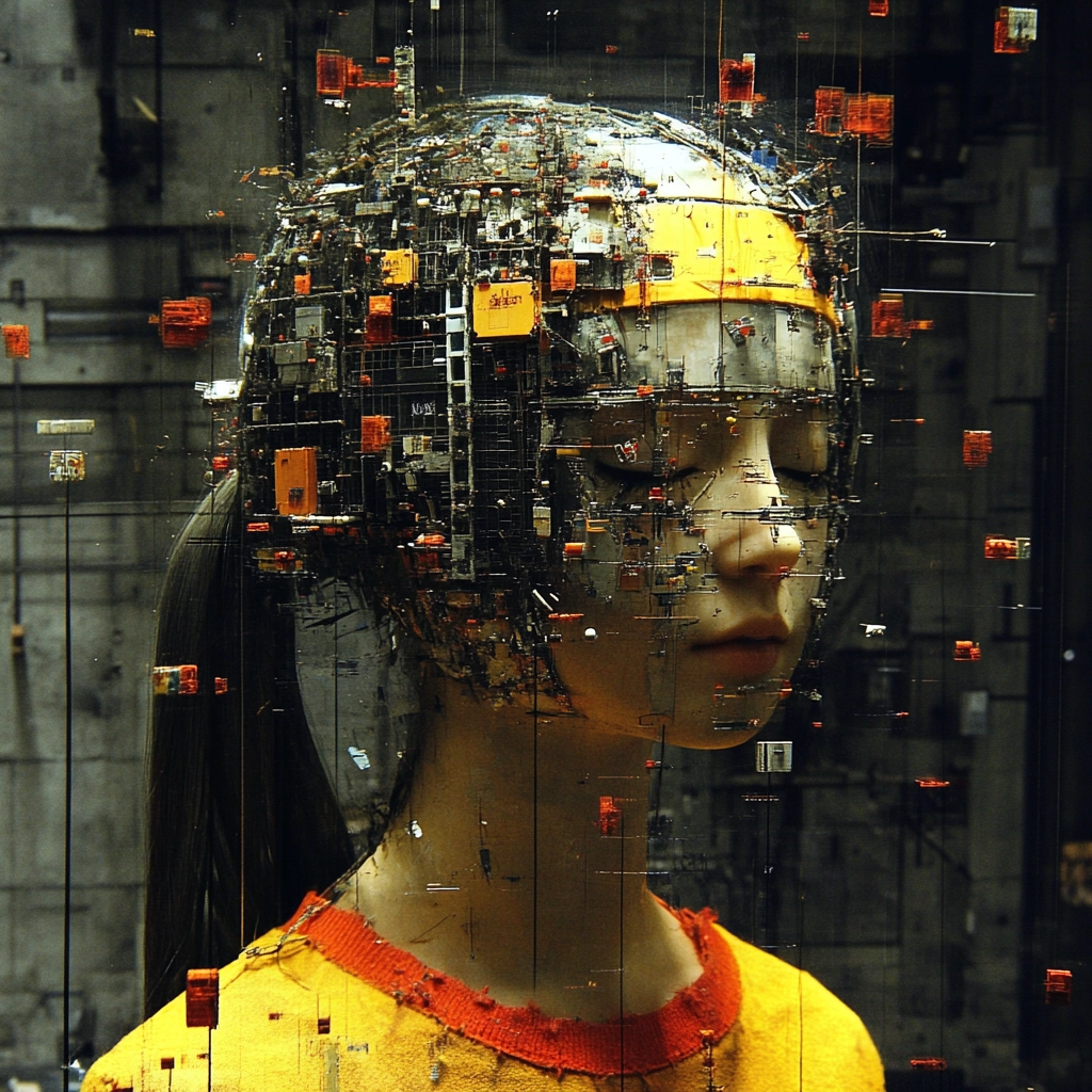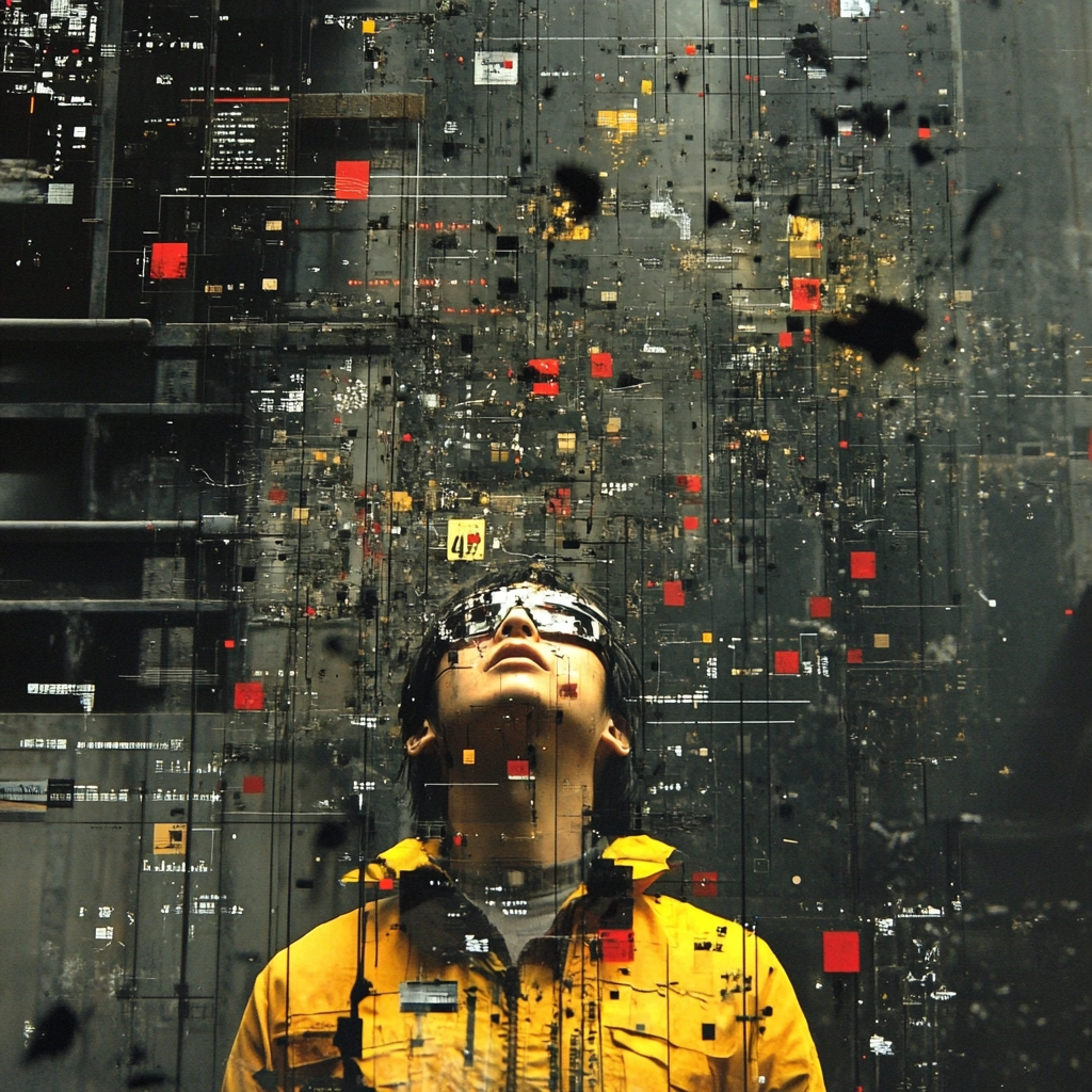 Precise digital elements contrast with bold color blocks over a muted and detailed background.