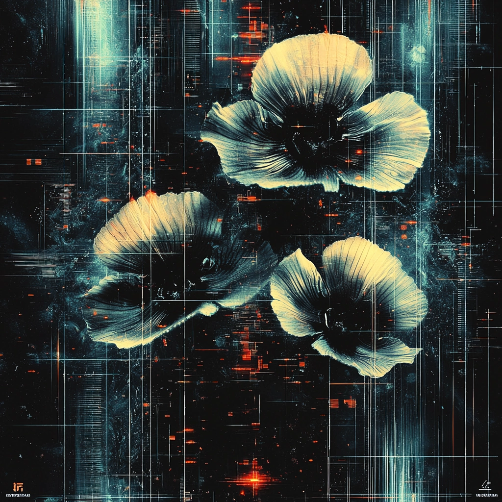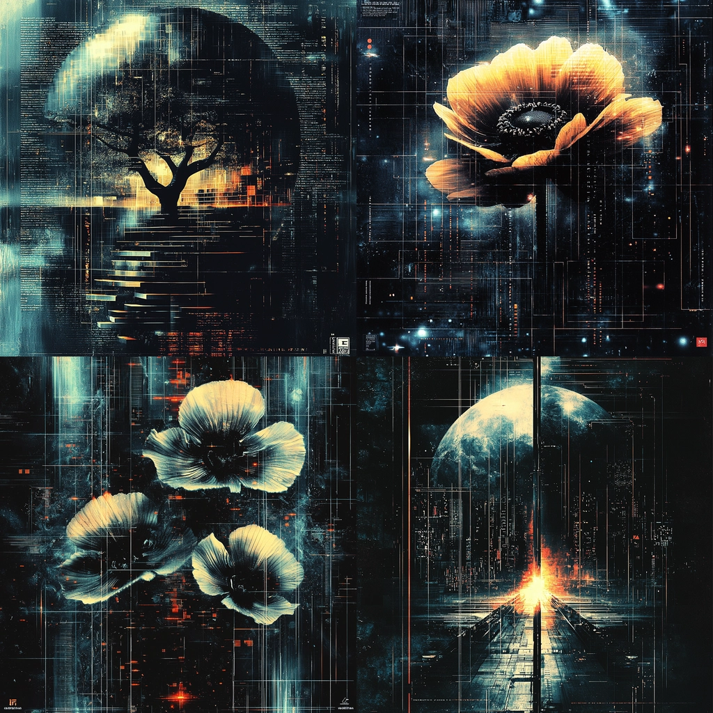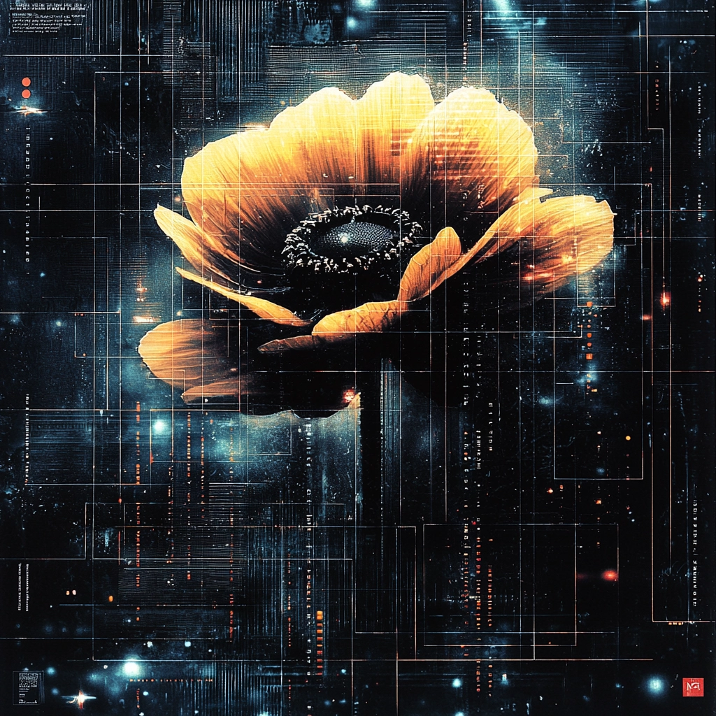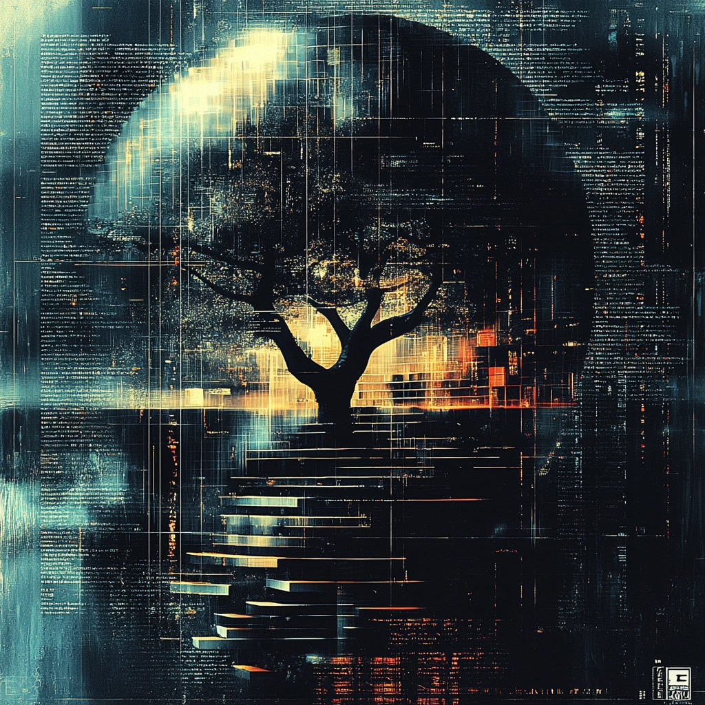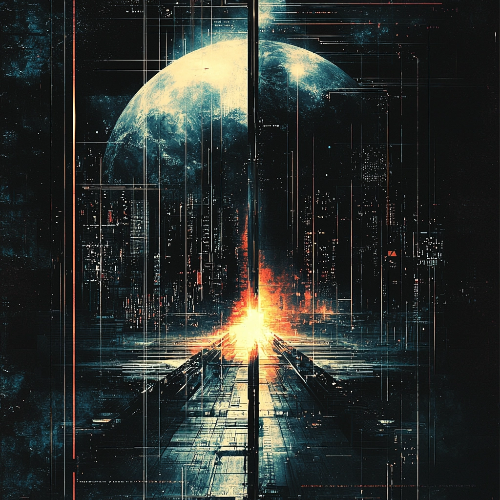 The composition employs strong lighting contrasts, making highlighted areas and dark portions highly vivid against the dominant black background. The use of geometric patterns creates a layered spatial effect, enhanced by a smooth texture. The intricate grid-like structuring adds complexity and depth.