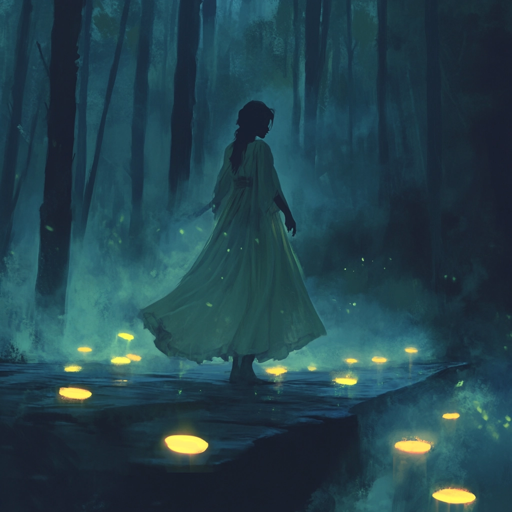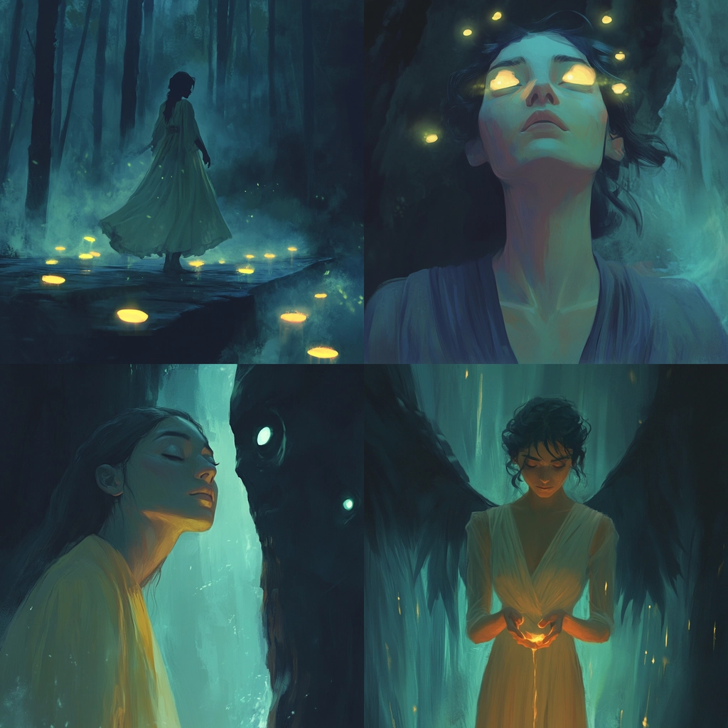 The lighting effects feature a diffused glow that creates a subtle contrast with the surrounding darkness. Colors are predominantly cool tones with interspersed warm hues, enhancing spatial depth. Textures are smooth, with blurred yet defined transitions between light and shadow.