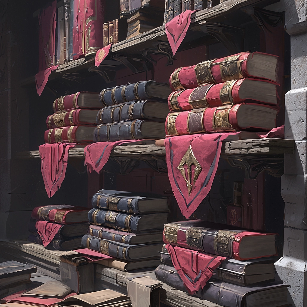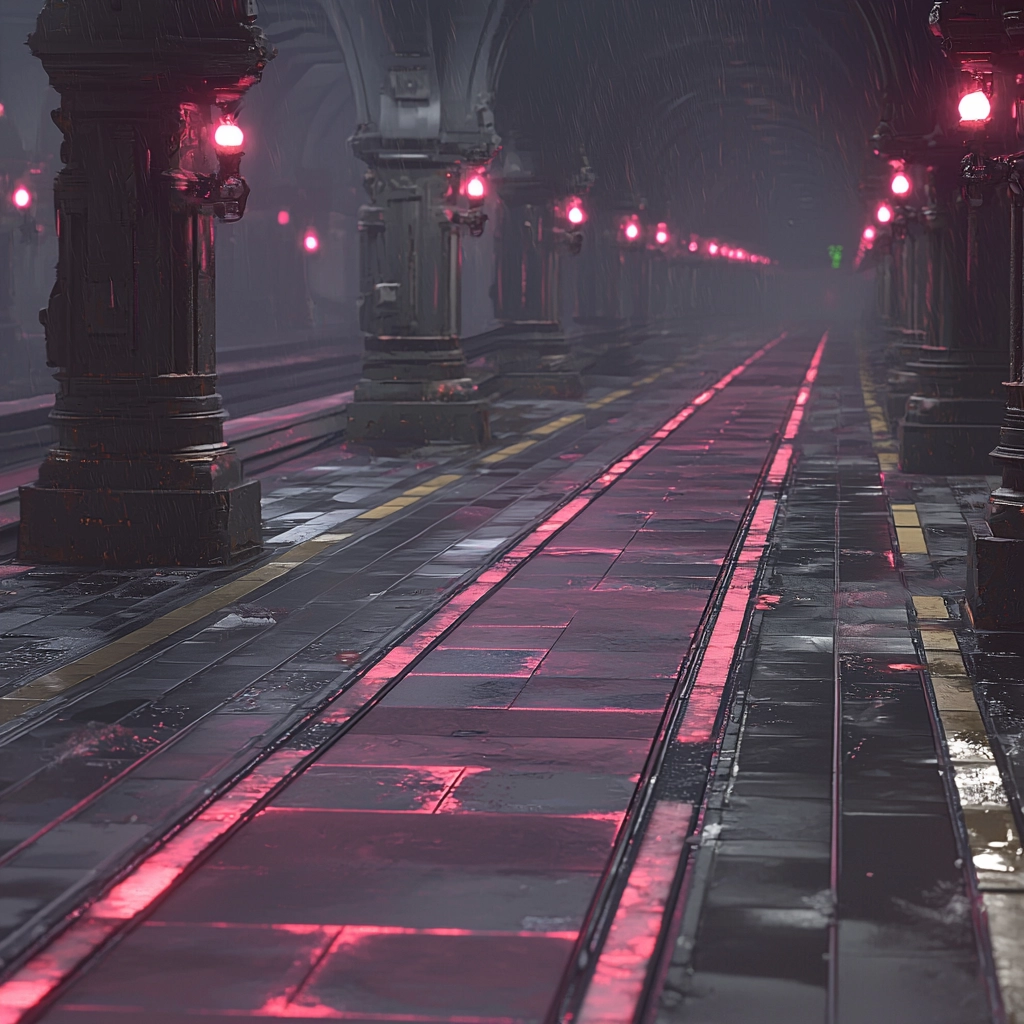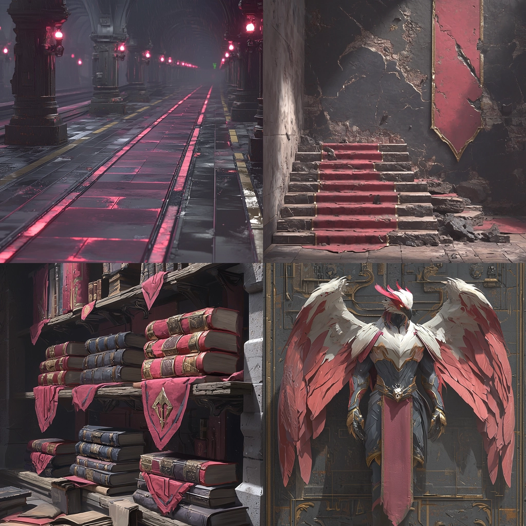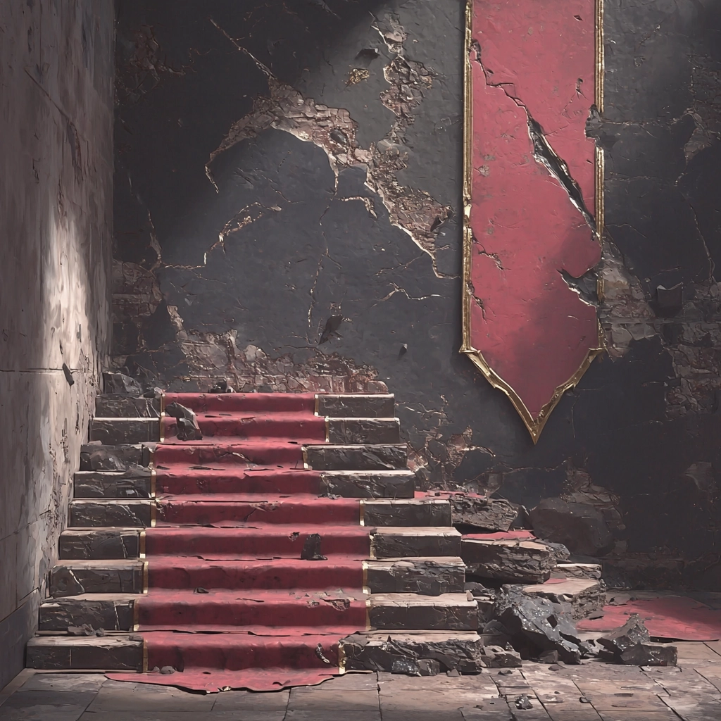 The composition employs muted red and gray hues with hints of pink on deteriorating surfaces and objects.