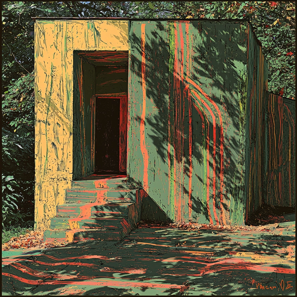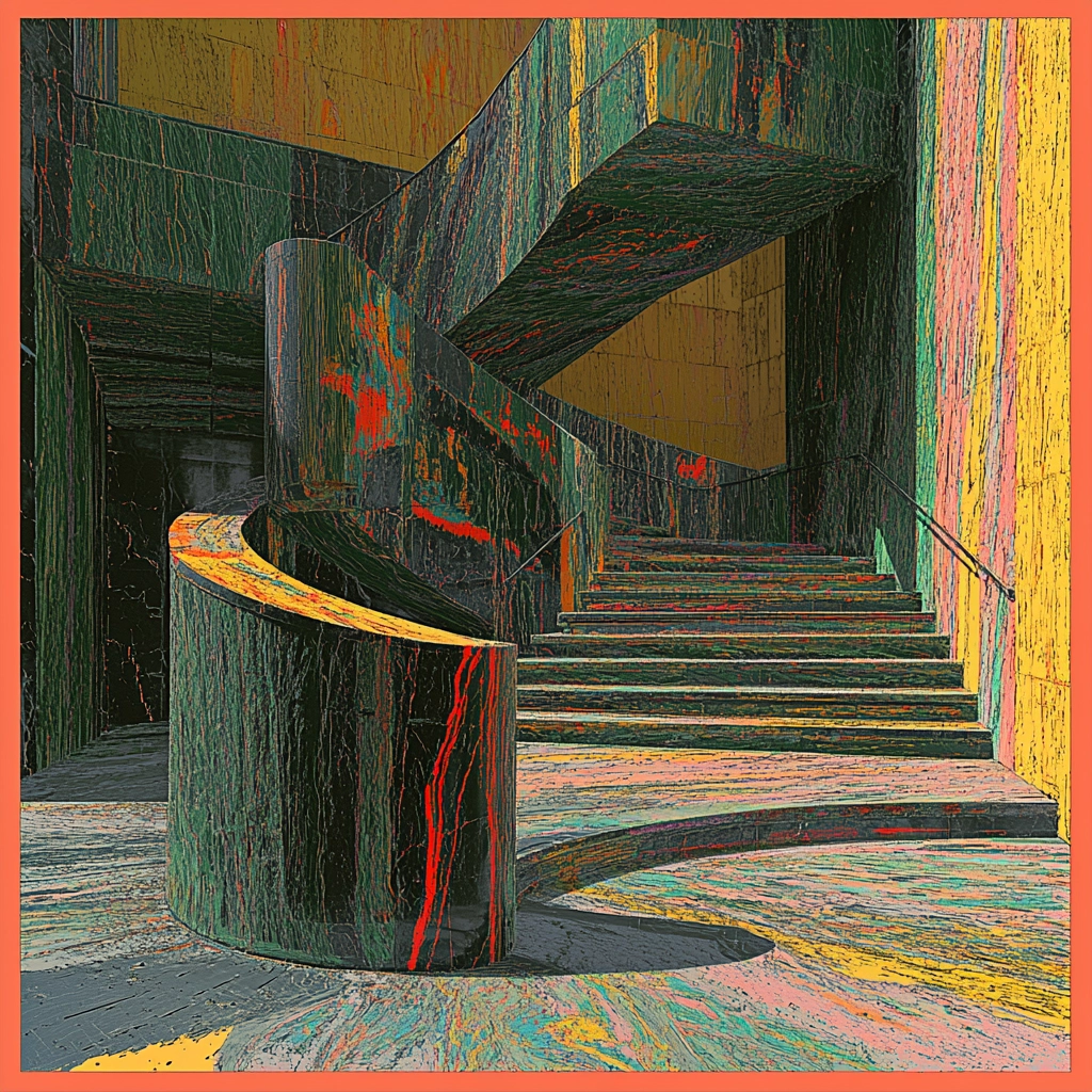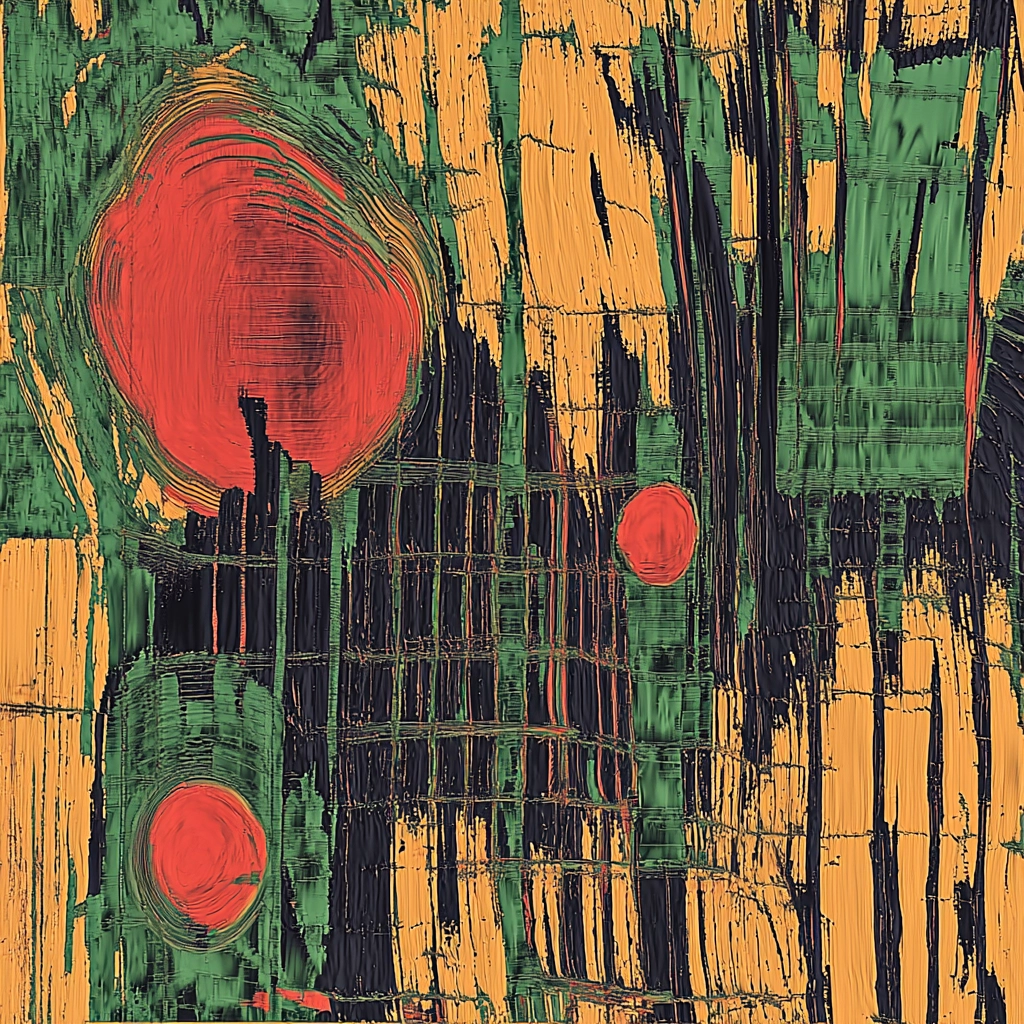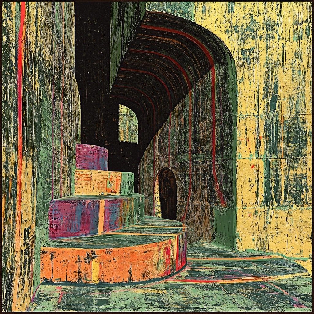 Distinct lighting accentuates the geometric forms, while the contrasting colors create a dynamic interplay. The artwork exhibits a layered spatial sense, enhanced by textures simulating erratic brushwork. The interplay of color and texture results in a visual tension and rhythm.