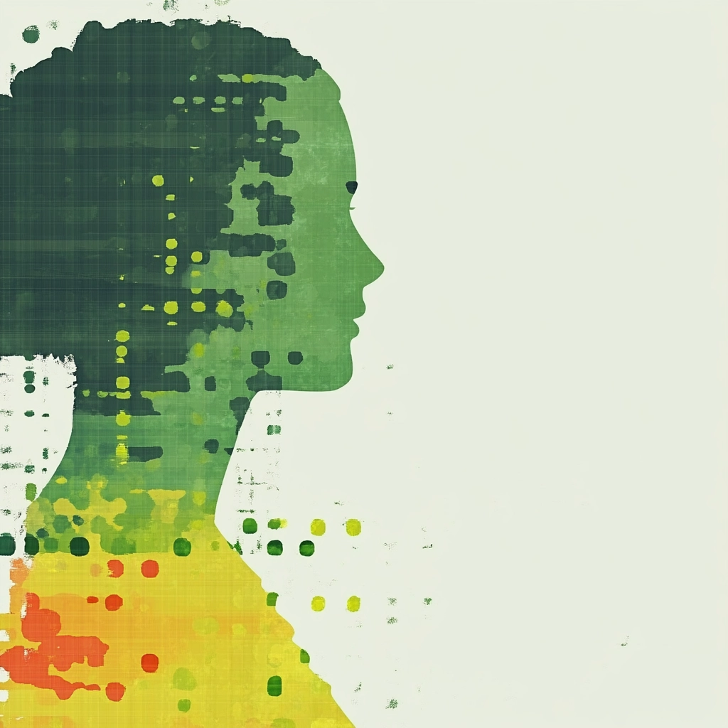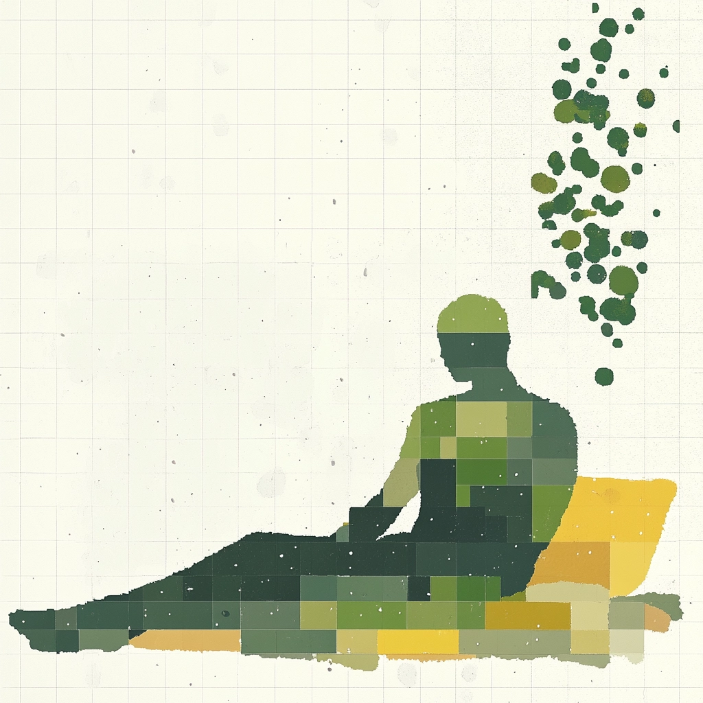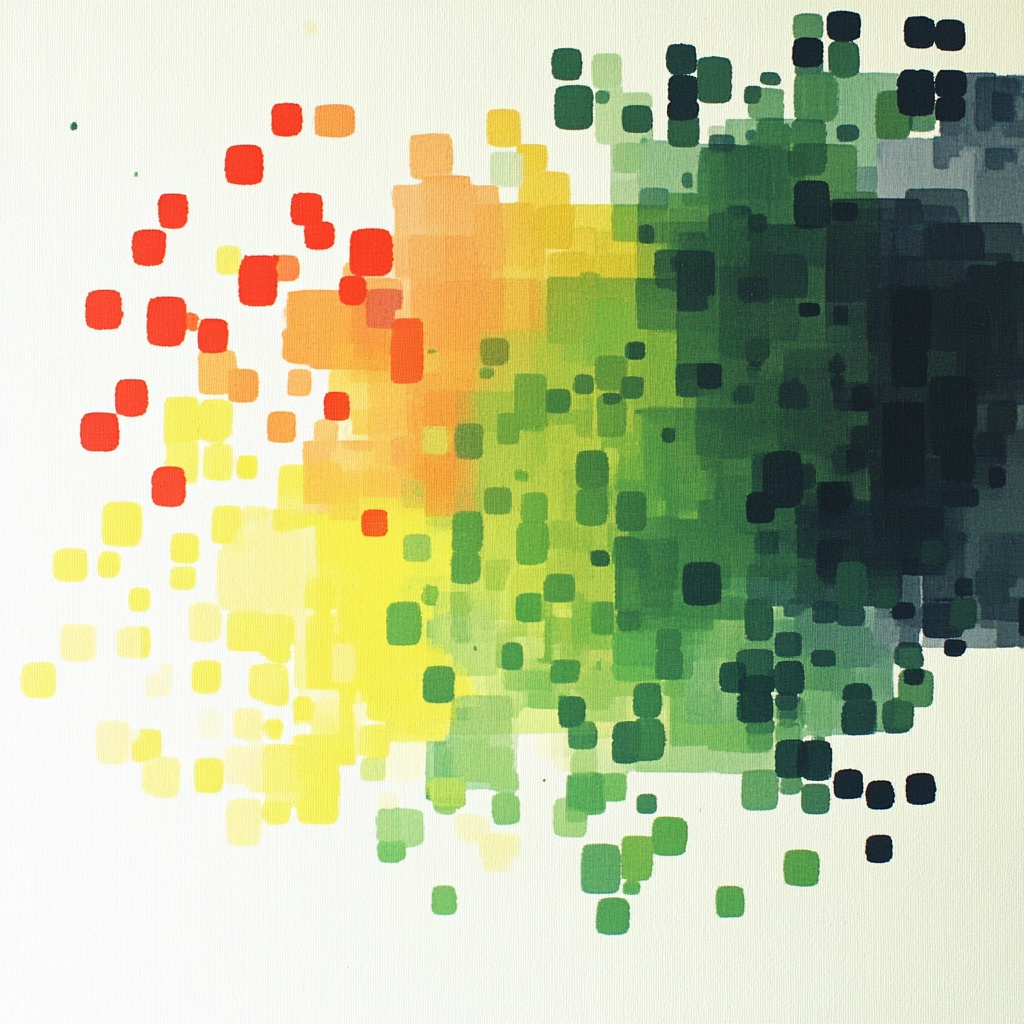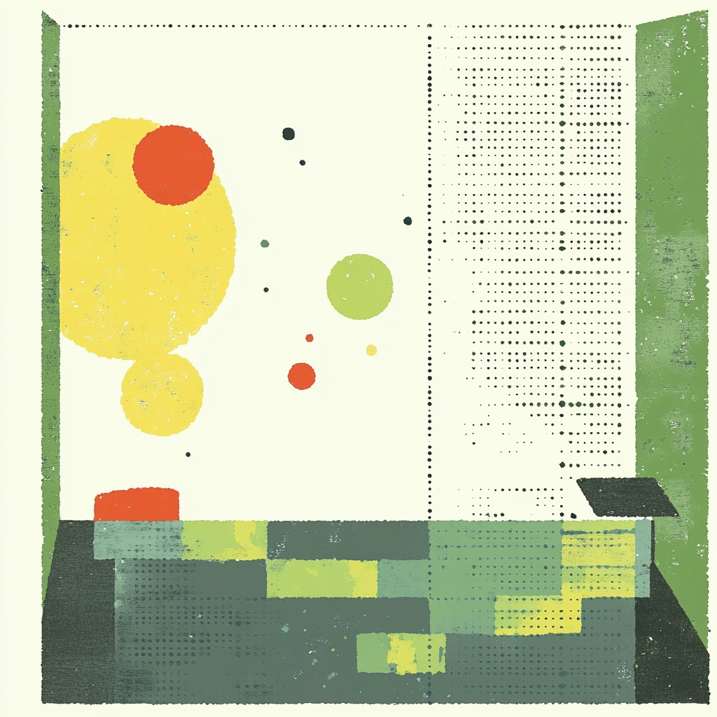 The artwork employs dotted textures and smooth gradients to suggest depth and form, using bold colors such as green, yellow, and red. The spatial sense is enhanced through varied dot density and strategic positioning, providing a dynamic visual experience.