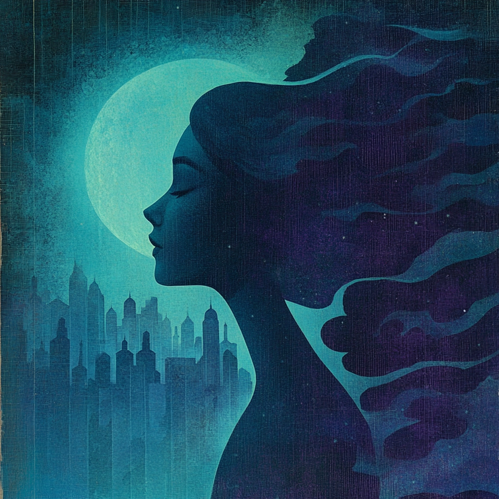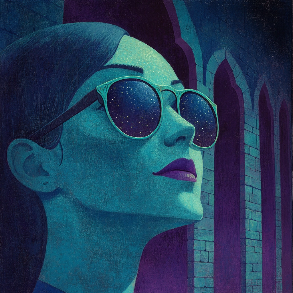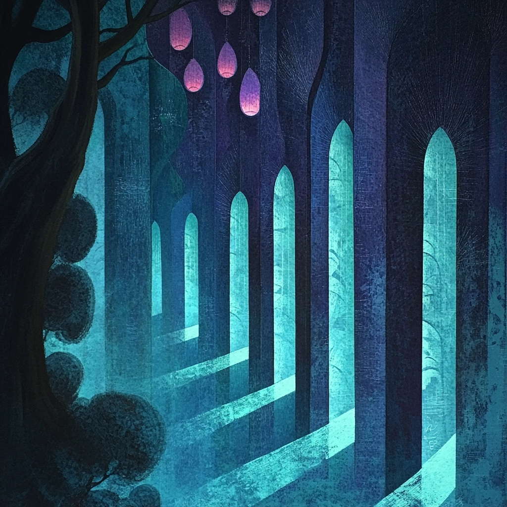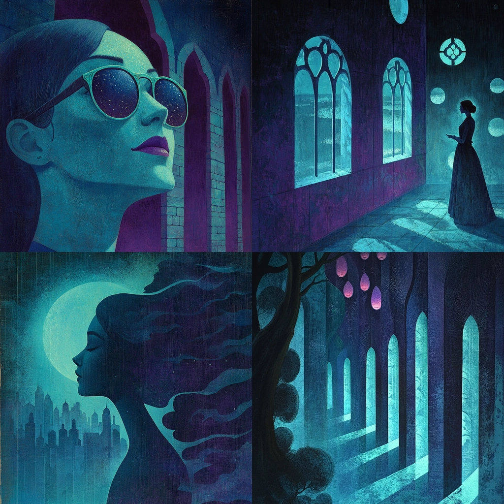The use of indigo and purple tones combined with cyan accents creates a mysterious and atmospheric lighting effect. Elongated shadows suggest deep space, while the rich texture enhances the dramatic quality.