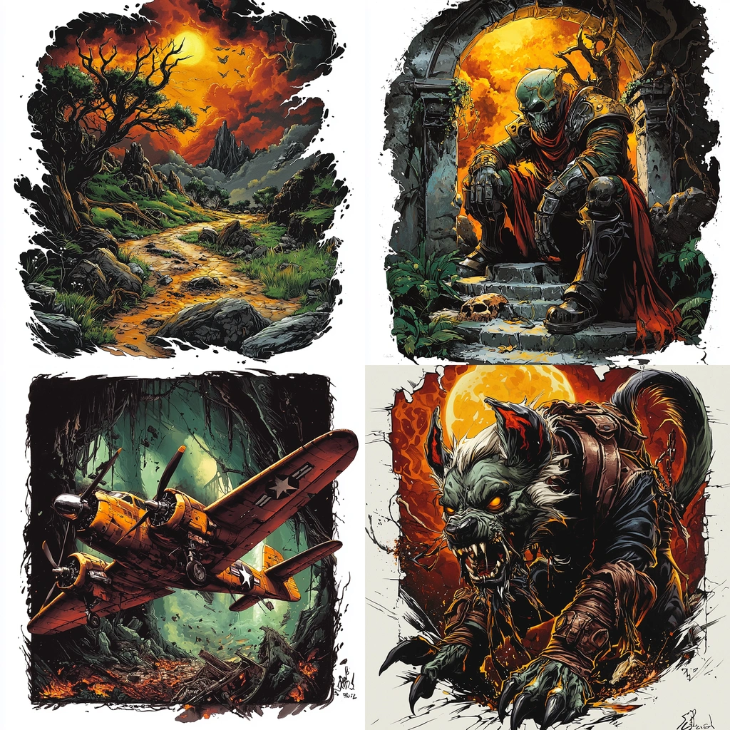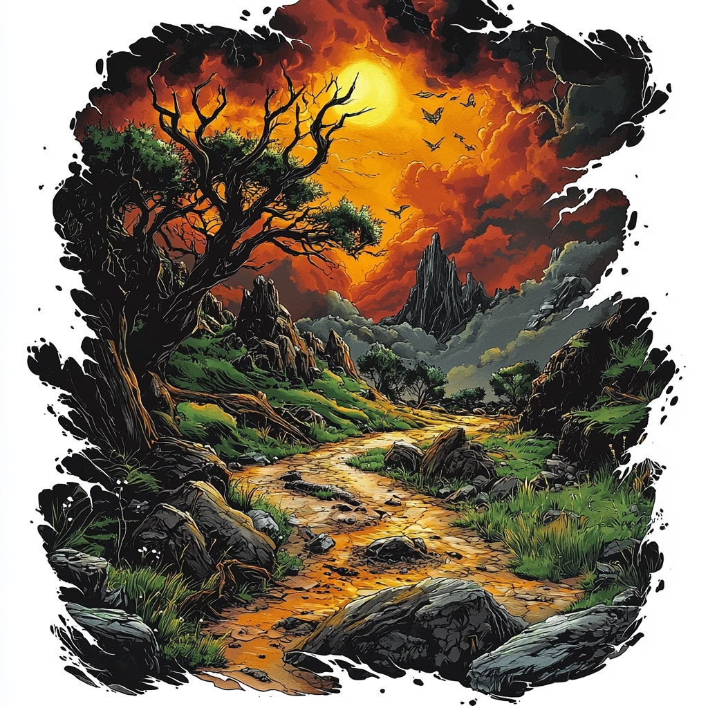 The use of vibrant orange against deep black highlights dramatic shadows, while subtler green tones add depth. Bright lights create a sense of immediacy and energy, emphasizing textures and forms.