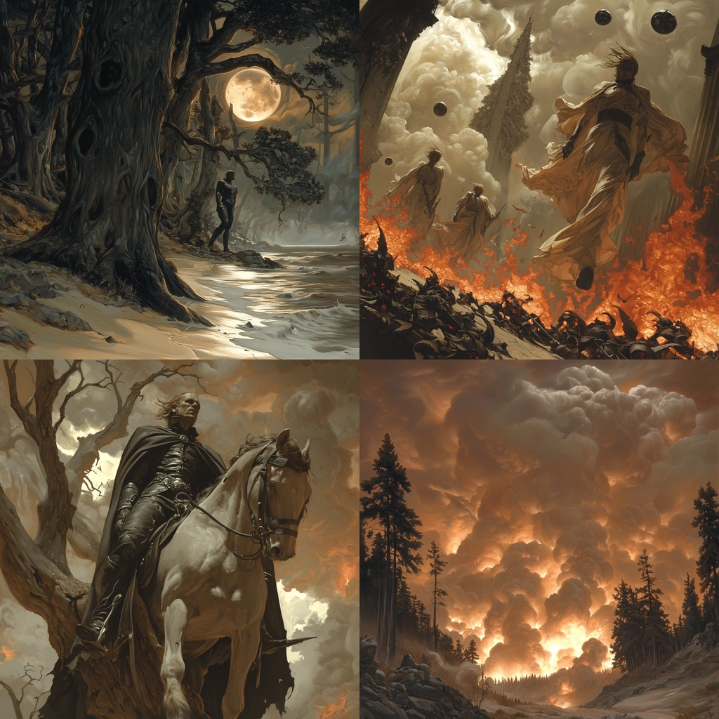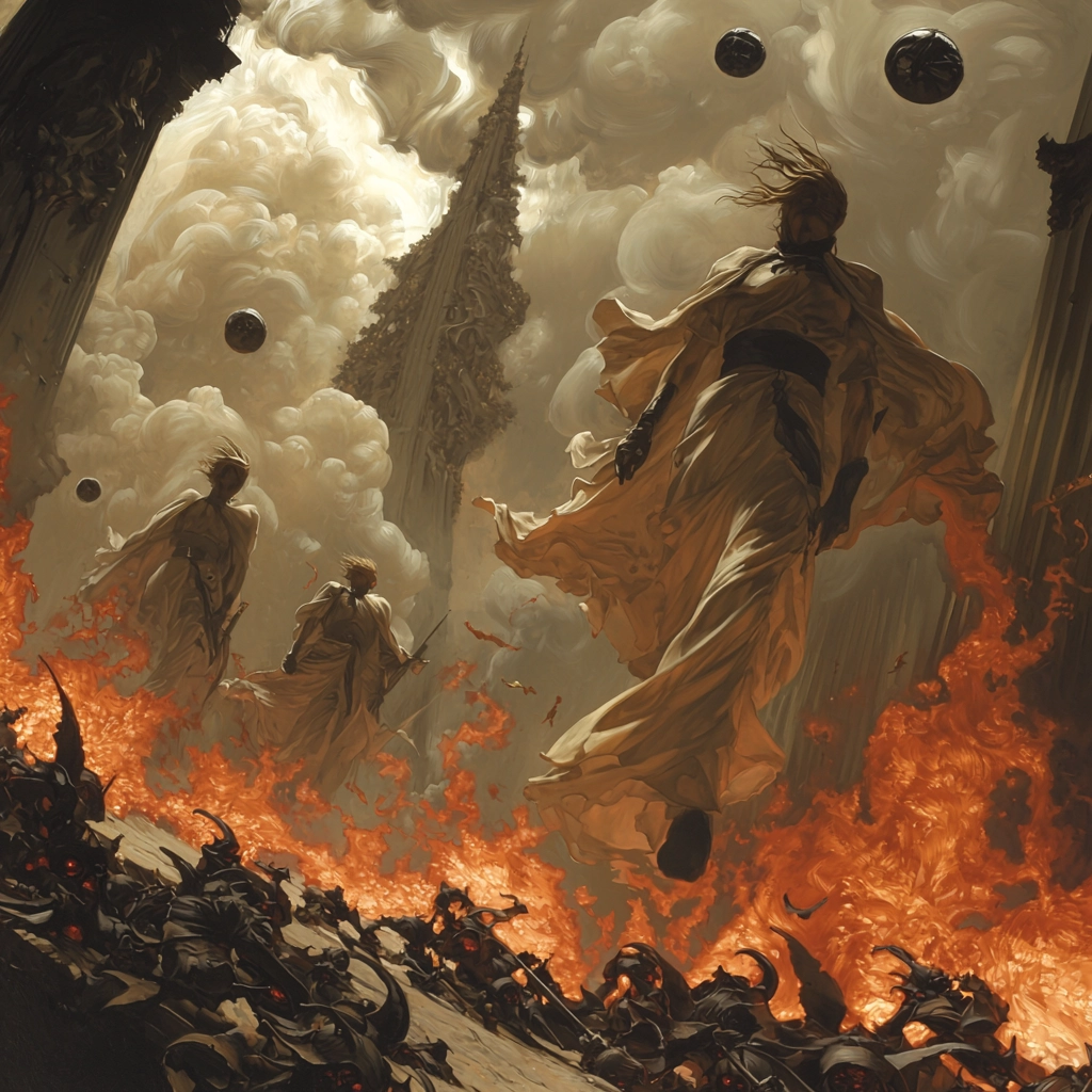 Golden hues and dark tones emphasize dynamic scenes and dramatic lighting.