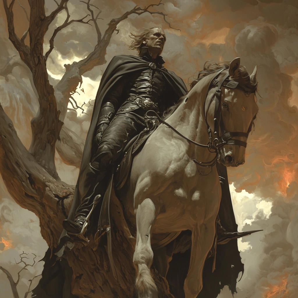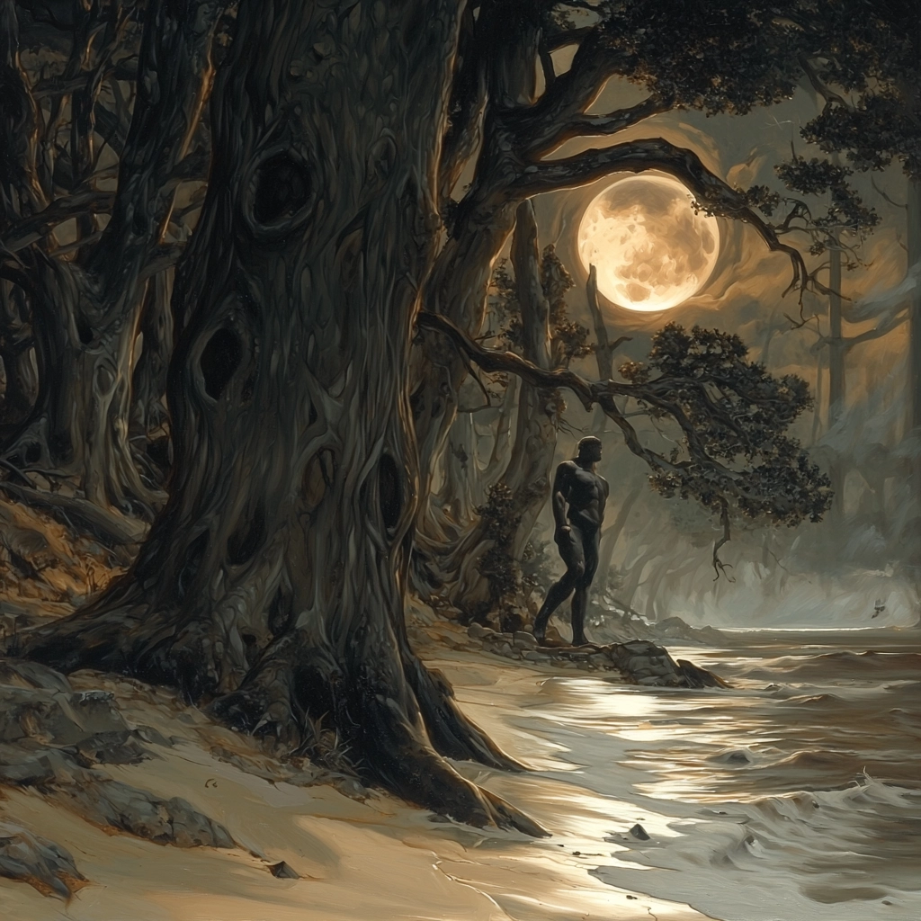 The lighting creates intense contrast, casting deep shadows and highlighting textures. Dark blue and gold dominate the palette, providing a rich and warm contrast. Depth is achieved through layering and precise chiaroscuro techniques.