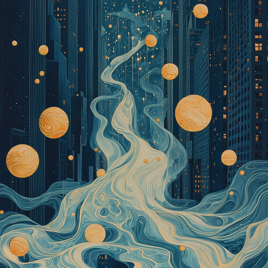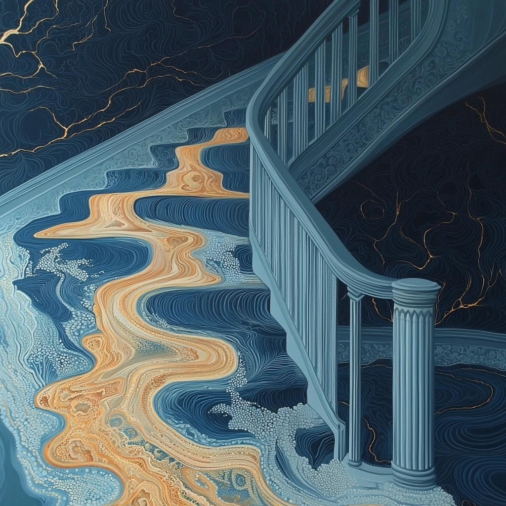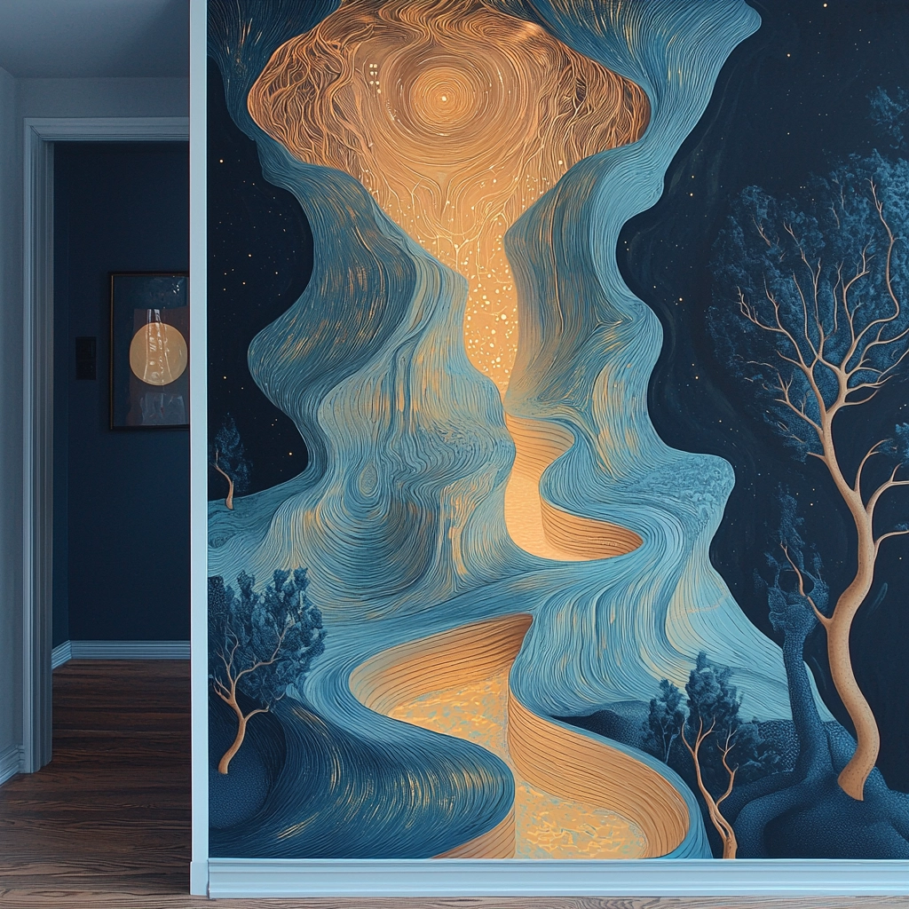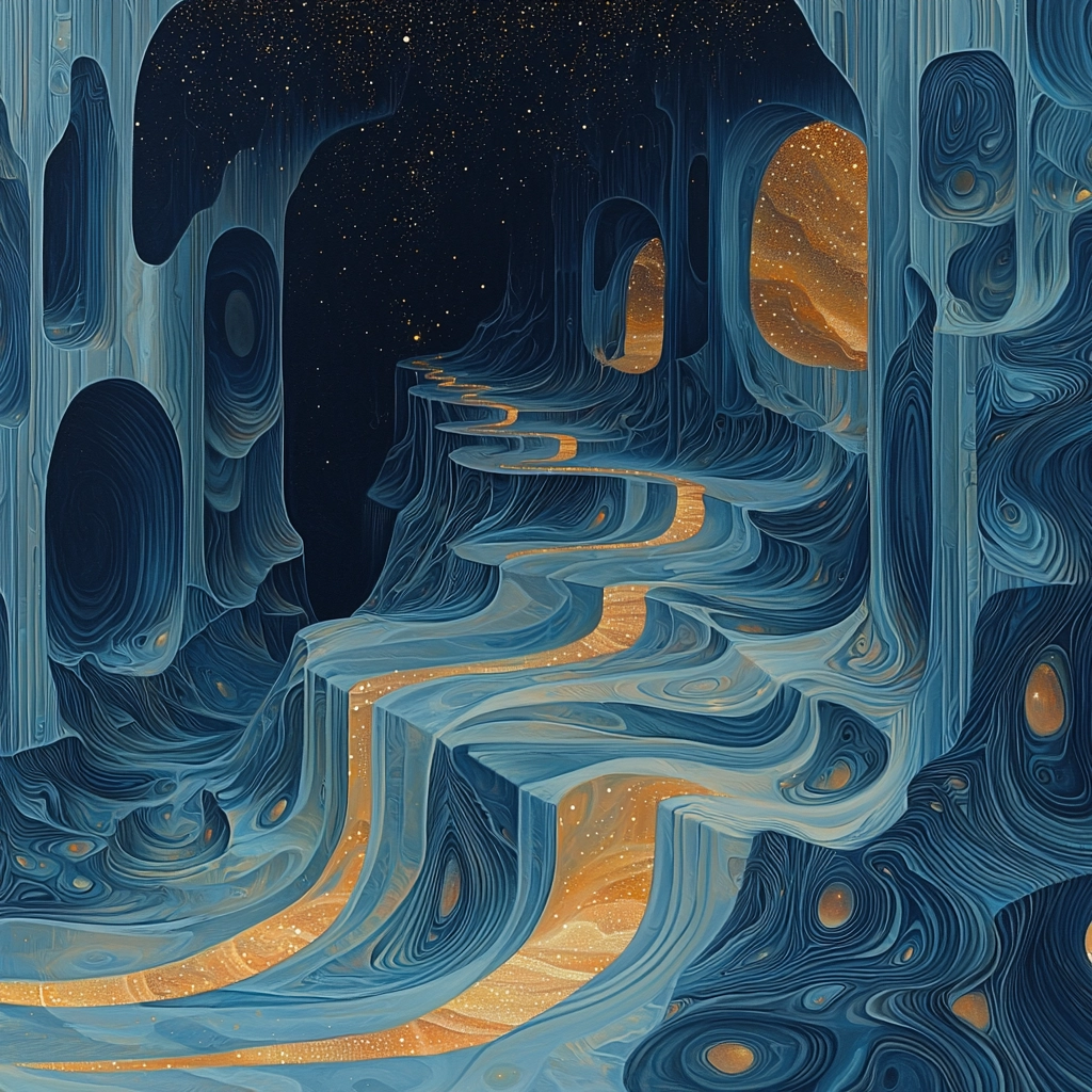 The artwork features dynamic lighting that enhances the swirling patterns of dark blue and gold, creating a sense of depth and flow. The use of smooth textures gives a fluid, continuous impression, while the interplay of light highlights intricate details and enhances spatial dimension.