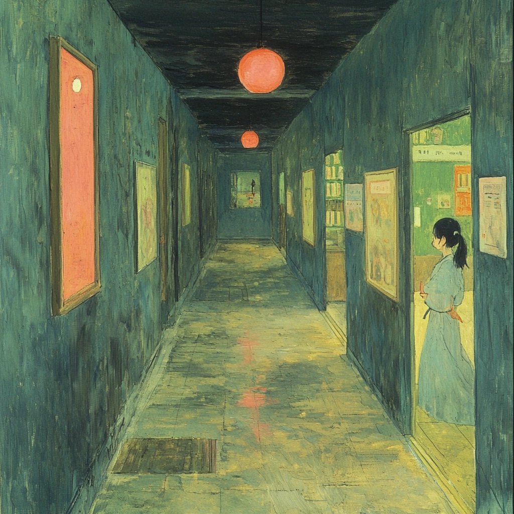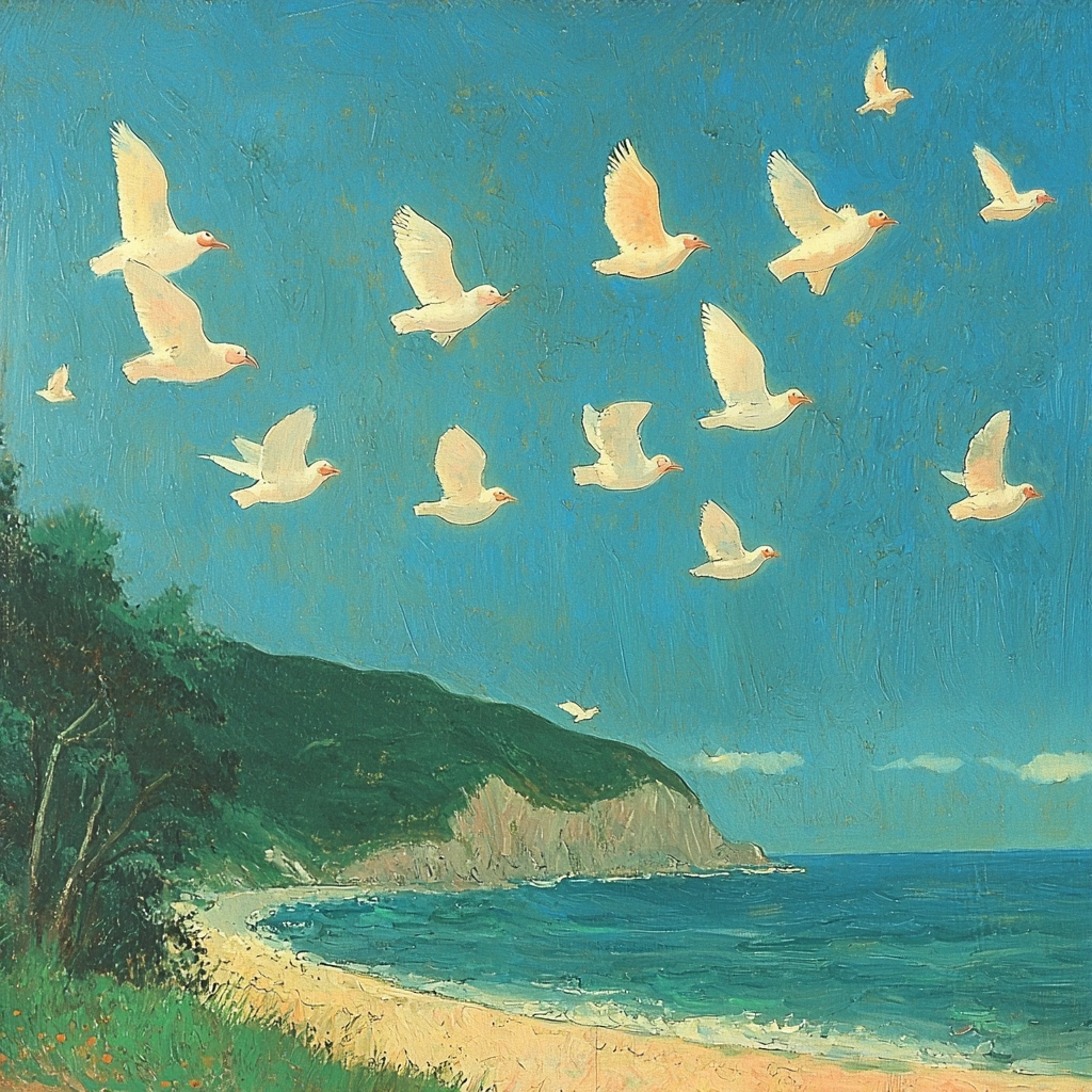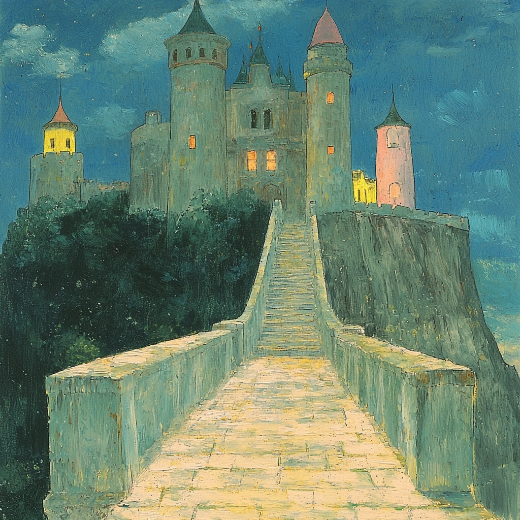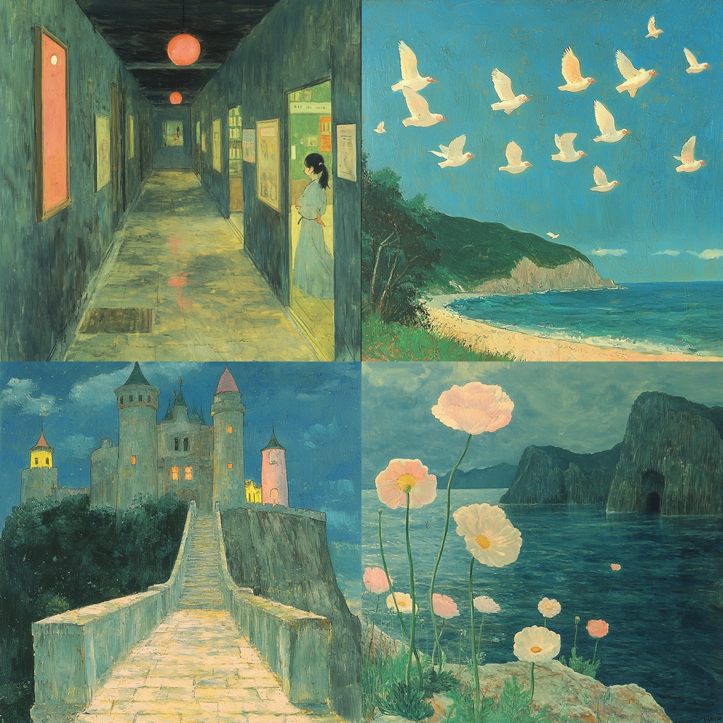A rich blue and green palette with contrasting pink accents in a harmonious scene combining detailed structures with natural landscapes.
