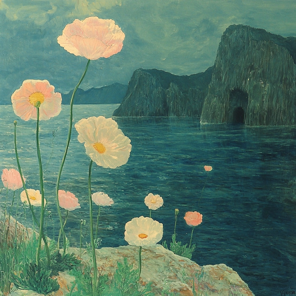 The lighting casts soft glows and gentle shadows, enhancing the perception of depth within the scene. The colors are cool and softly blended, with pink highlights that add dynamic contrast to the overall green and blue tones. The texture is smooth yet varied, providing a tactile sense of surfaces from rugged stone to delicate petals.