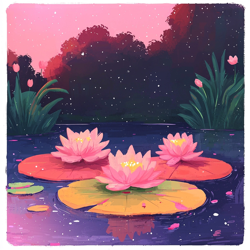 Balanced compositions using warm pinks and dark blues create a harmonious impression.