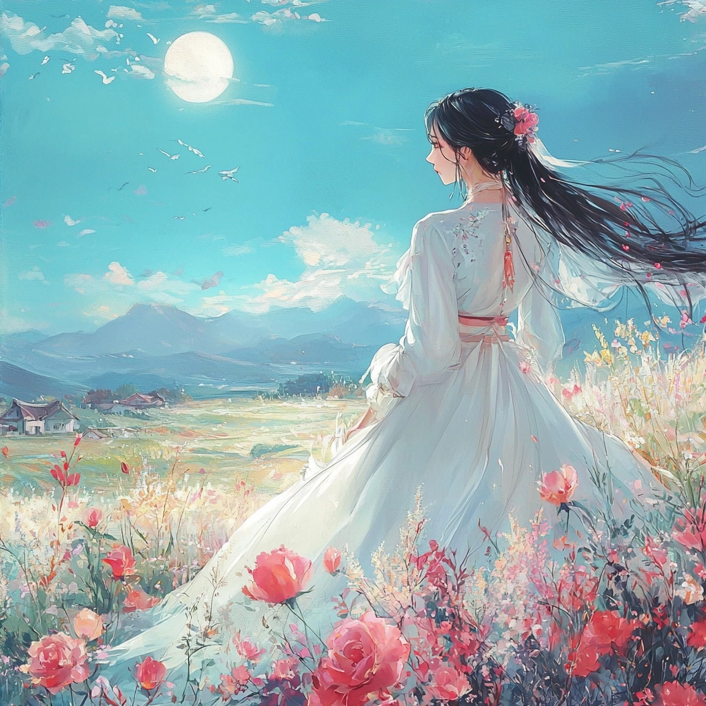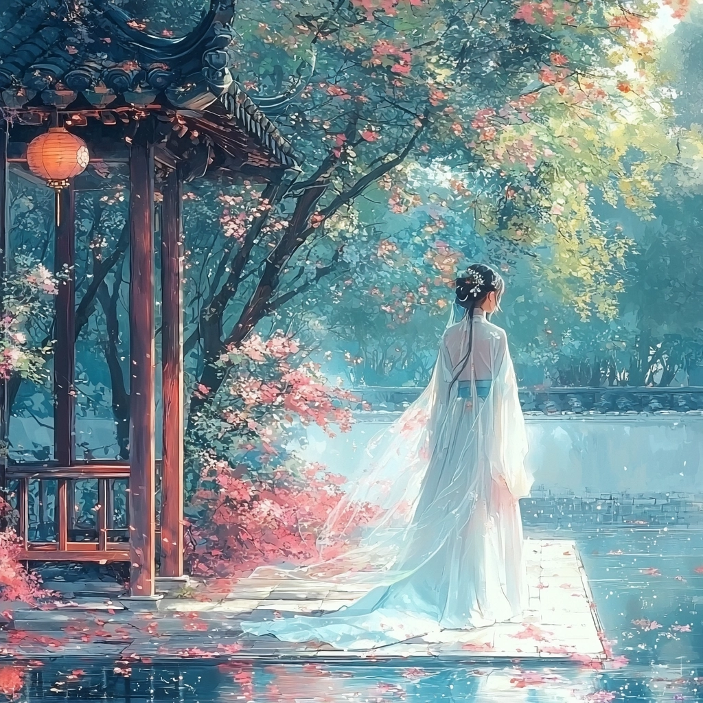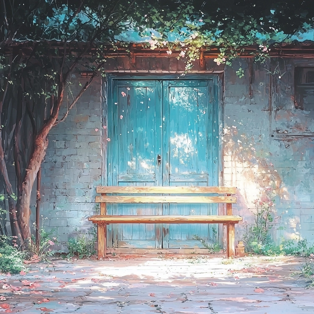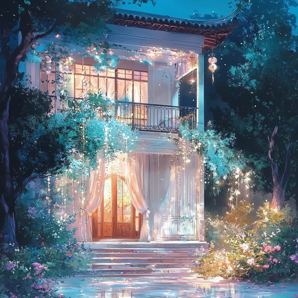 The piece combines soft lighting with gentle blues and greens, creating a harmonious and dreamlike effect.