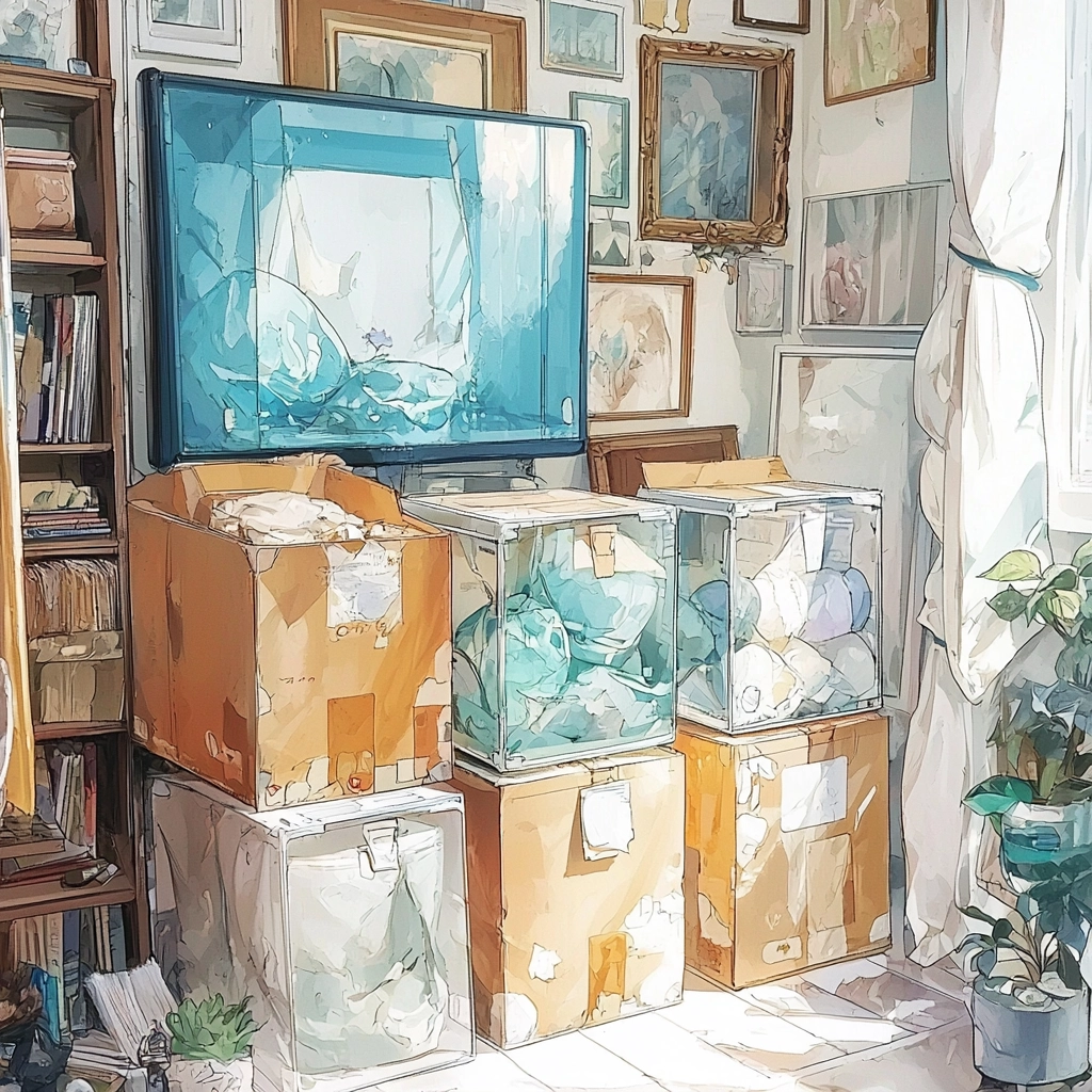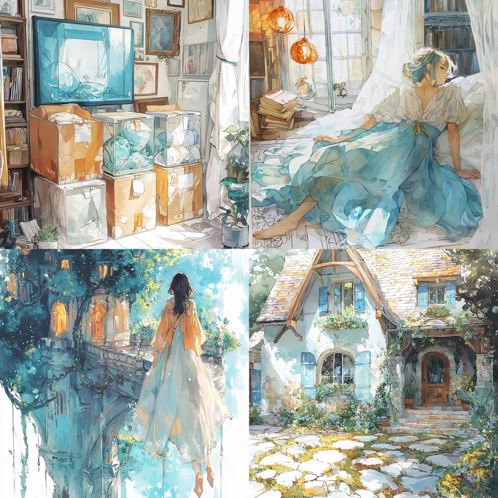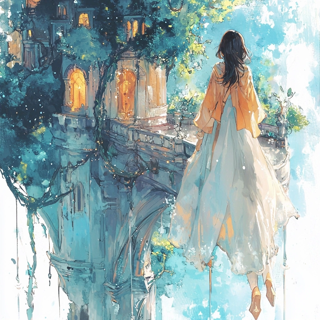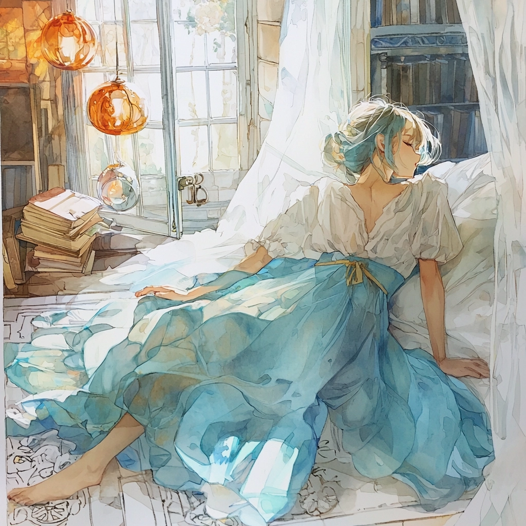 The artwork showcases delicate lighting creating an airy ambiance, with translucent textures and fluid color gradients. Spatially, it presents depth through layered elements and diffused edges.