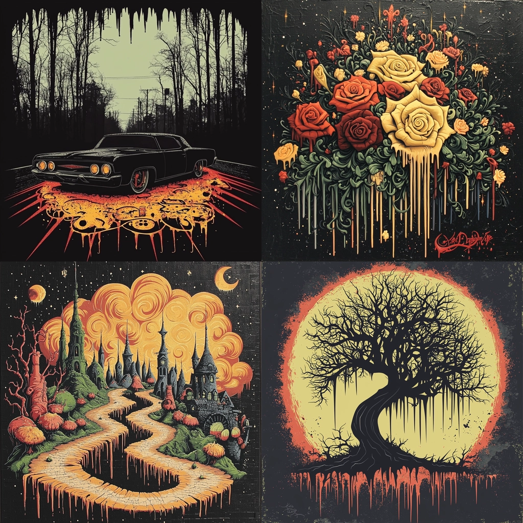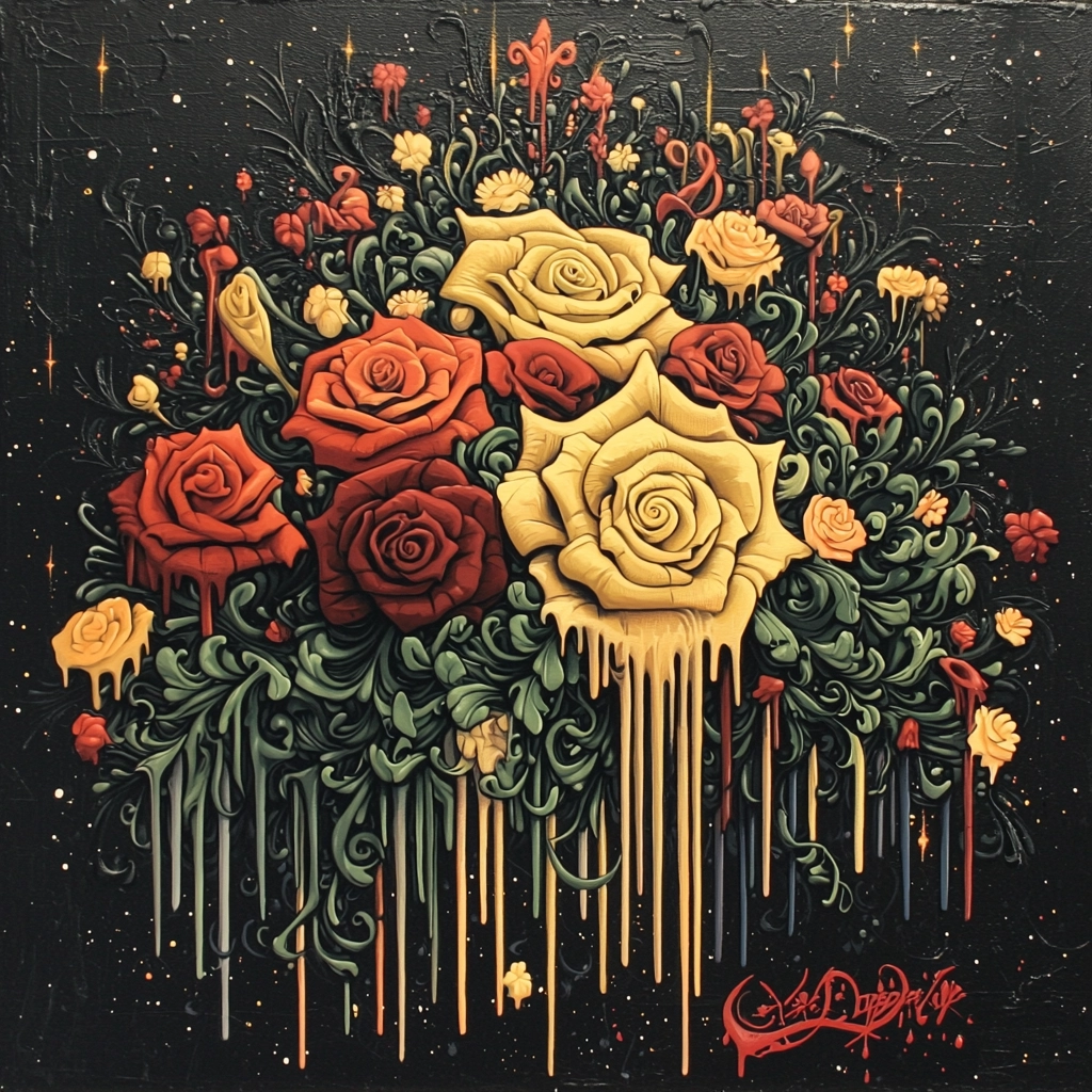 The use of drips emphasizes movement and adds a dynamic quality. The colors are bold and saturated, set against deep black backgrounds. Layering enhances depth, while the texture appears tactile, almost inviting touch.