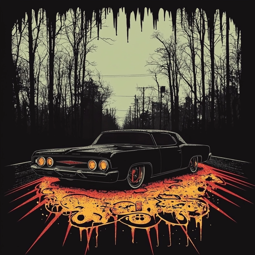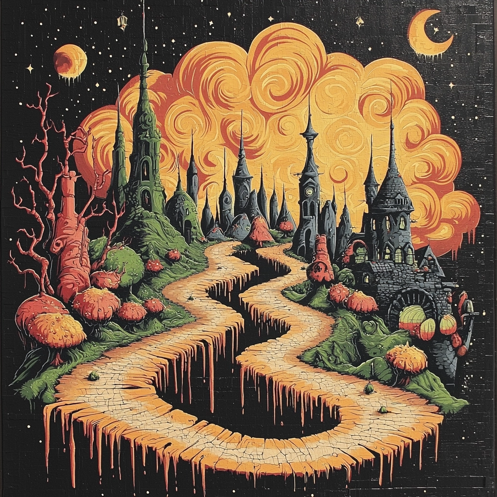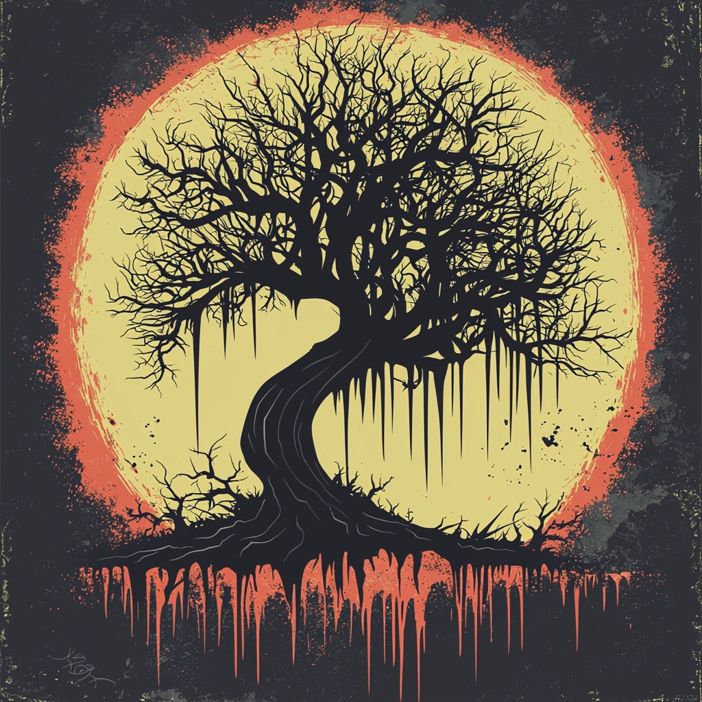 An interplay of dark tones and vivid colors creates a striking and intense composition.