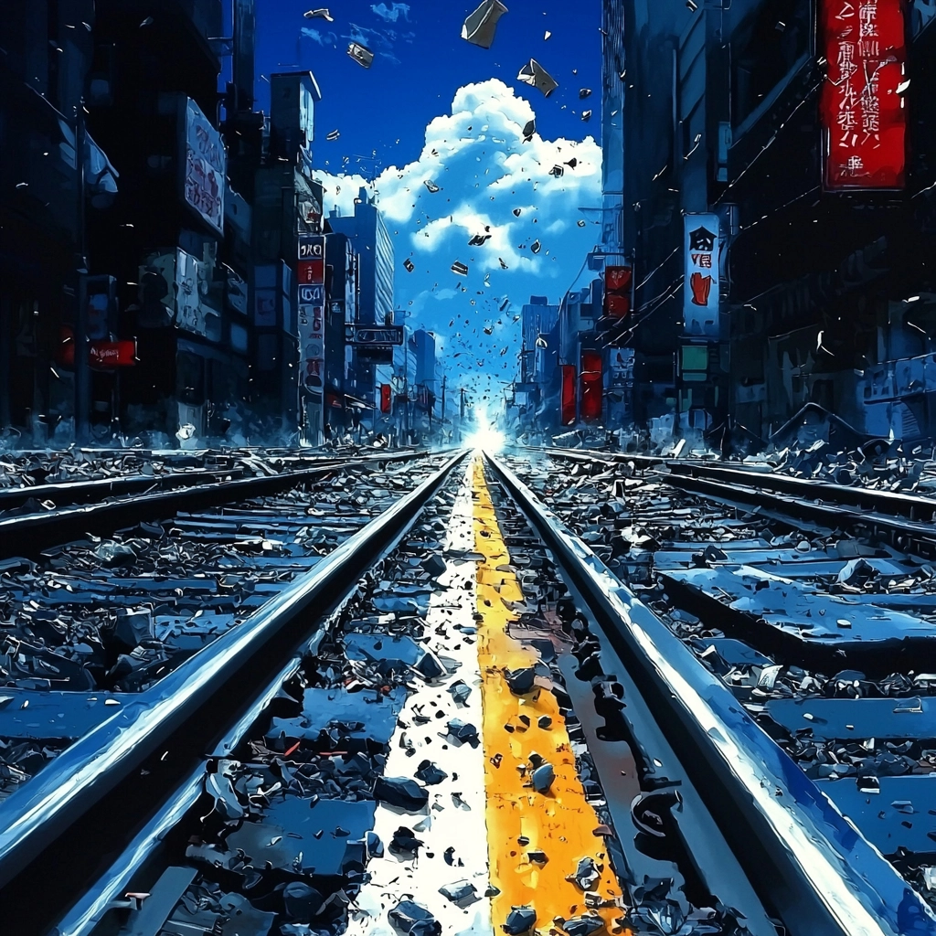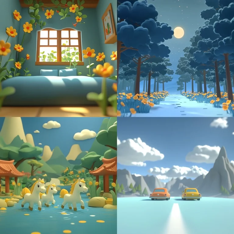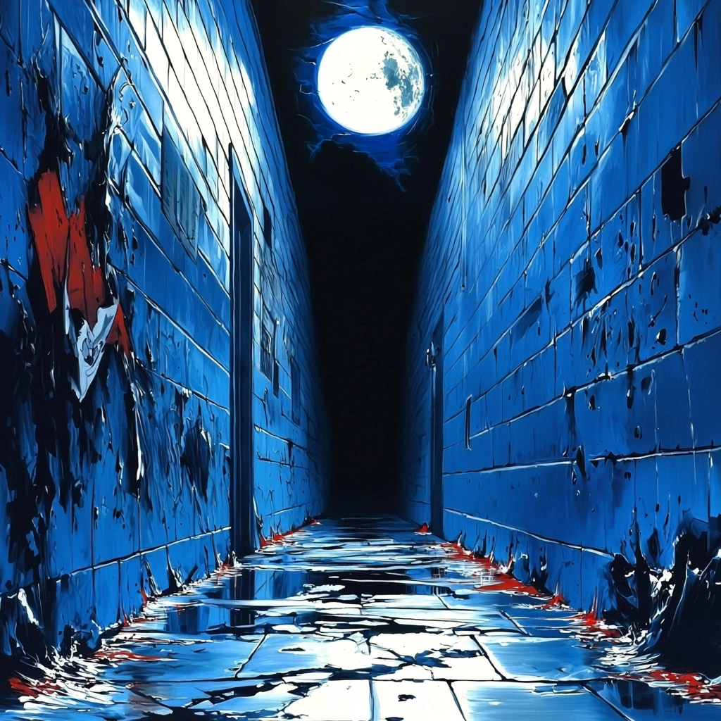 The lighting reveals sharp contrasts, highlighting both texture and depth. Blue dominates, creating a cool, dense atmosphere with hints of sparkle. Space is expansive yet contained by architectural forms.