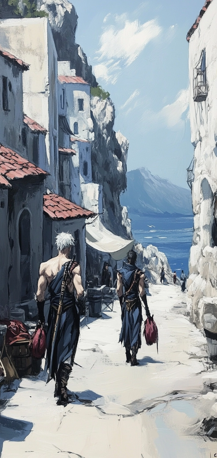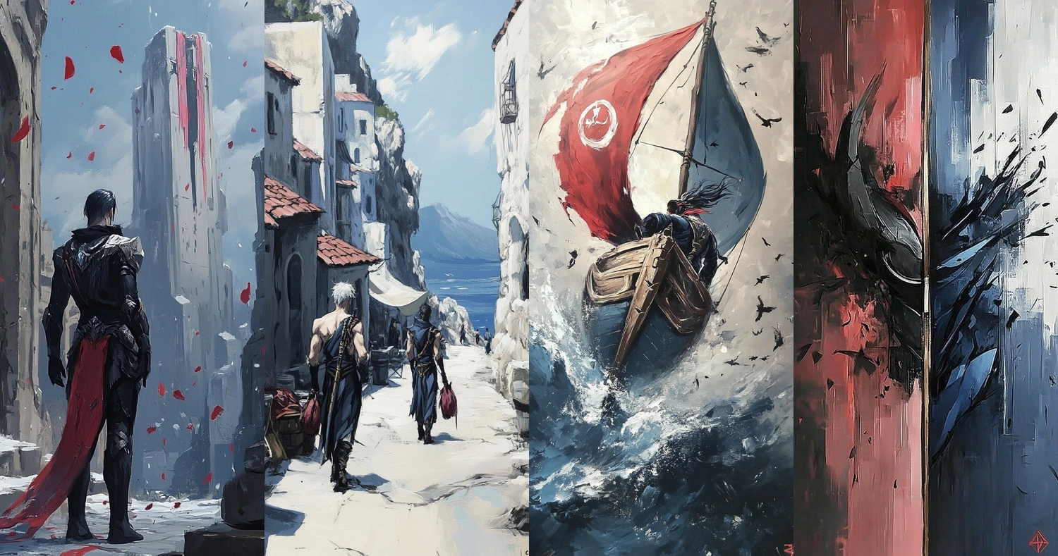 The artwork employs dynamic brushwork, offering a sense of motion with vivid blue and red hues against a muted backdrop. Focused lighting emphasizes form, while texture highlights depth.