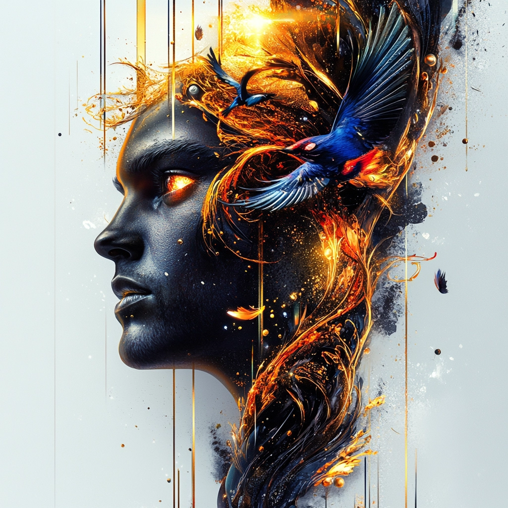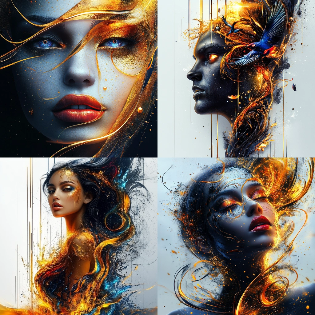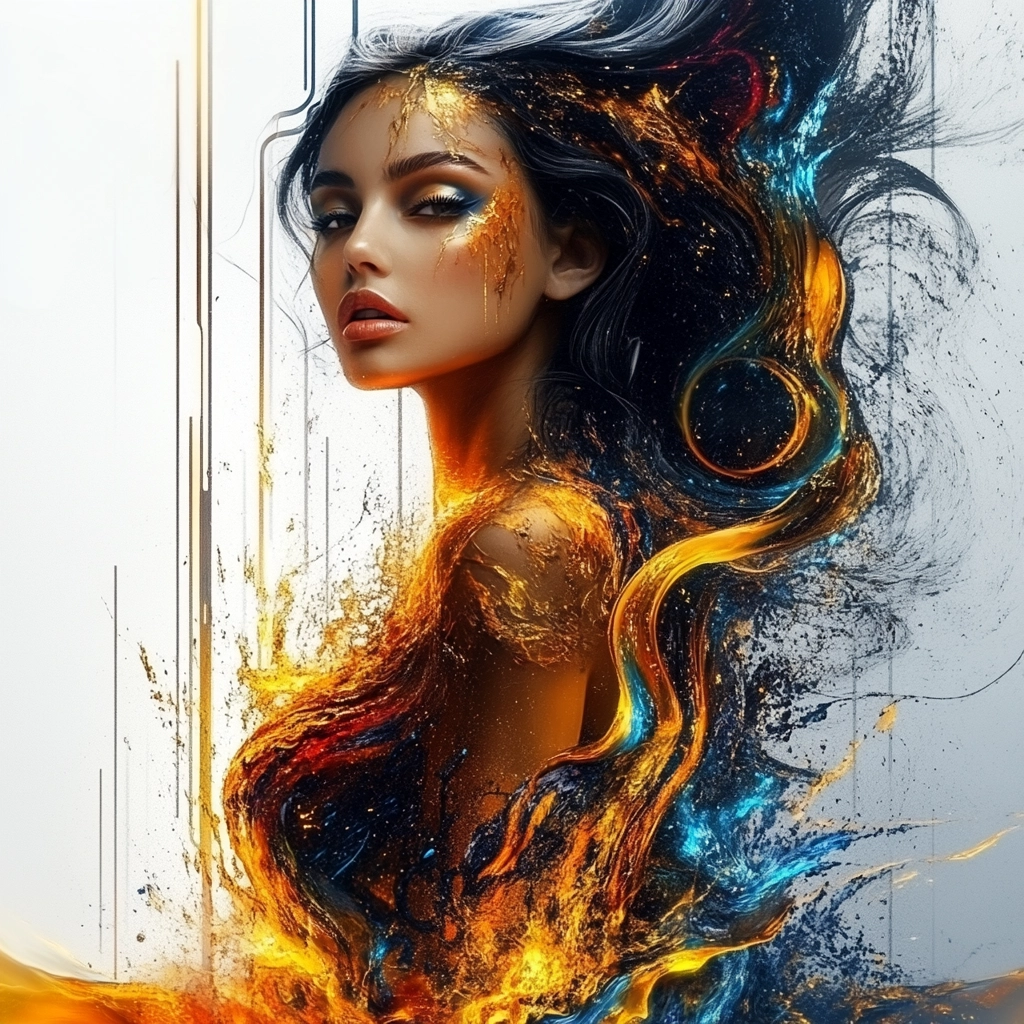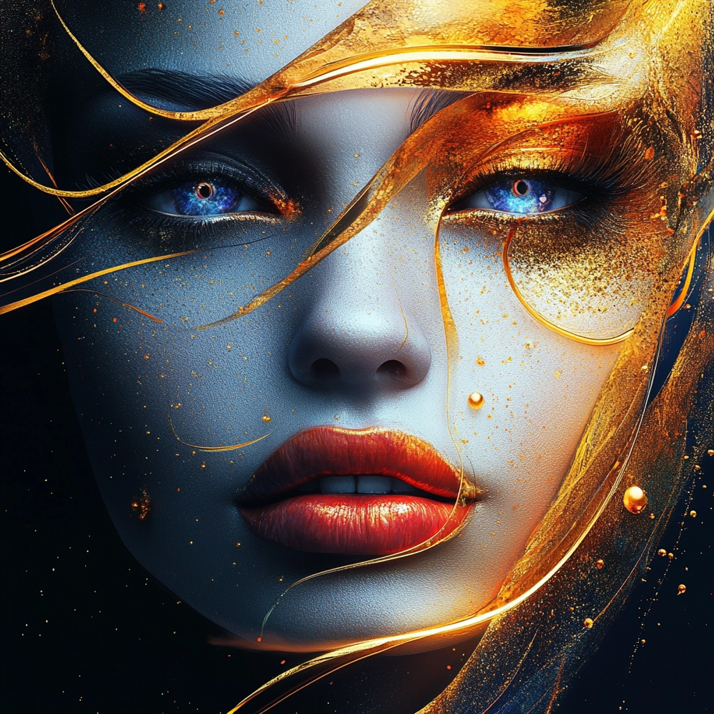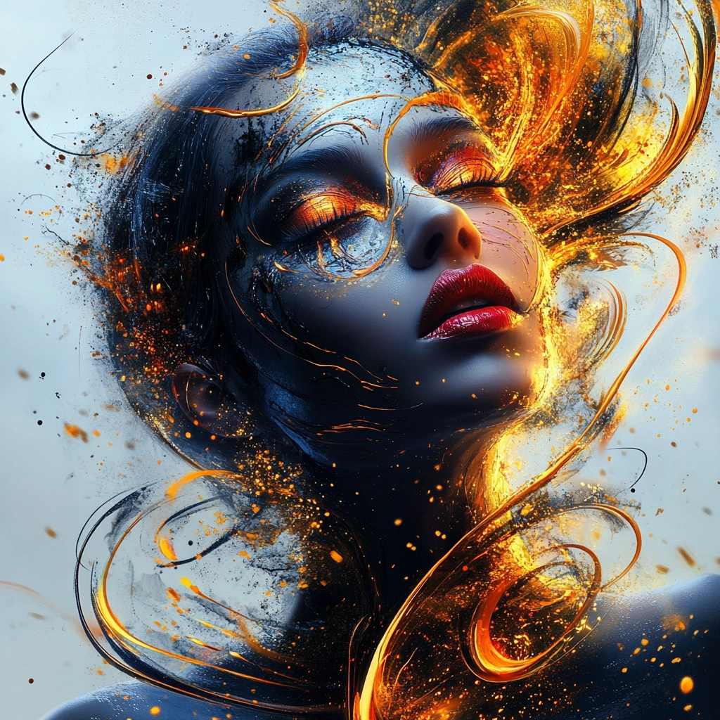 Bright lighting enhances vivid orange and blue swirls against deep black, creating dynamic motion. The use of vibrant colors combined with fluid lines suggests a sense of movement and energy, while intricate textures add depth.