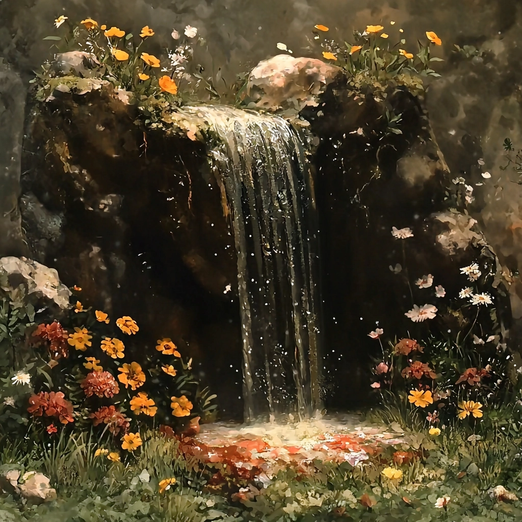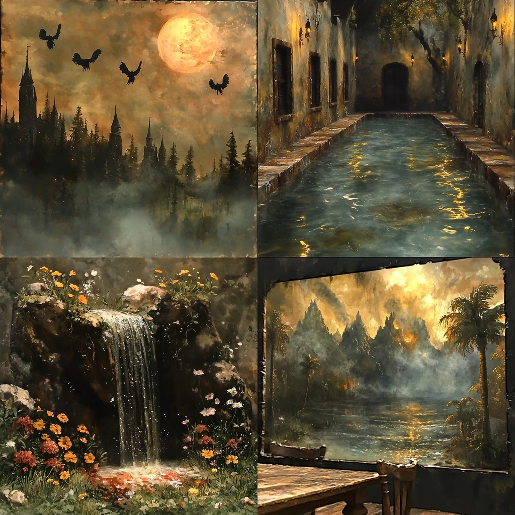 Light sources accentuate textures, casting dramatic reflections across irregular surfaces, creating depth. Shadows deepen the color palette, blending hues into each other, enhancing spatial perception with soft, blurred boundaries.