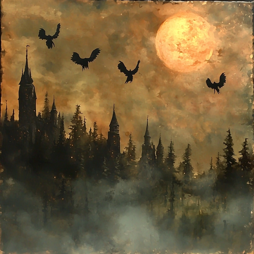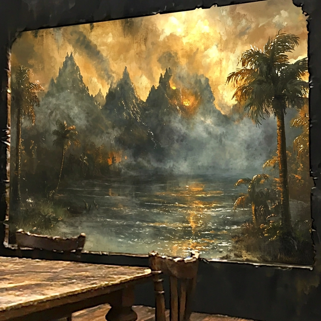 Rich contrasts between illumination and shadows create an intense atmosphere with subdued tones, emphasizing the dramatic effects of light and texture.