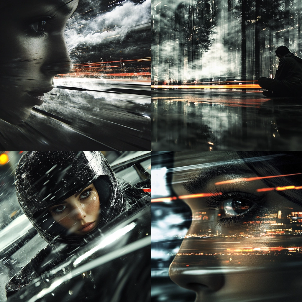 Bold contrasts and reflective surfaces intertwine in strong urban settings with motion effects.