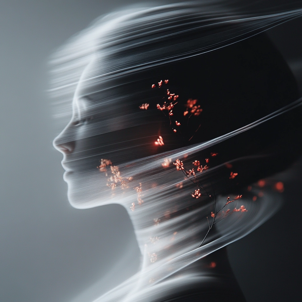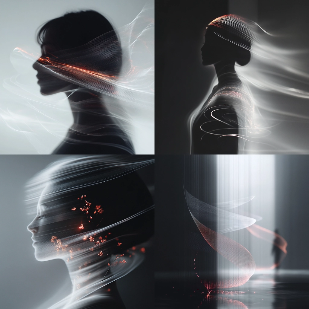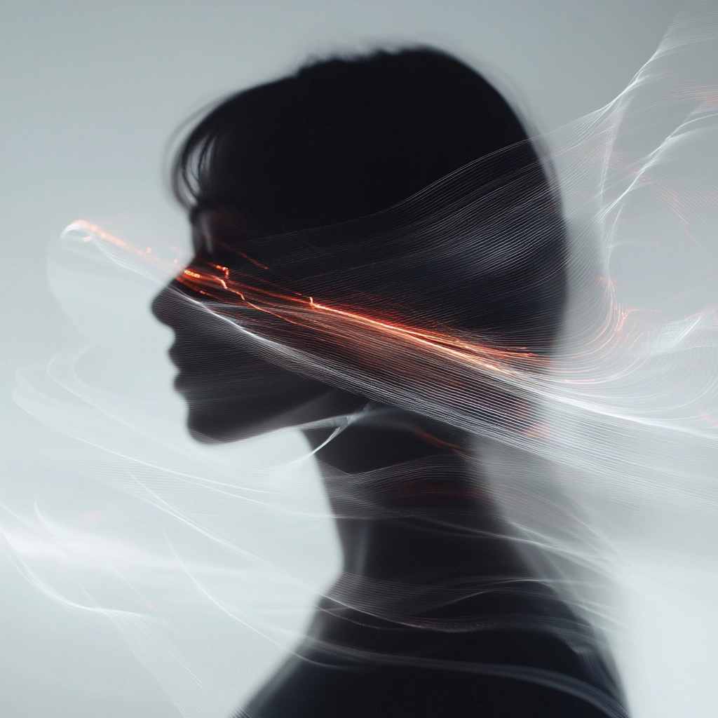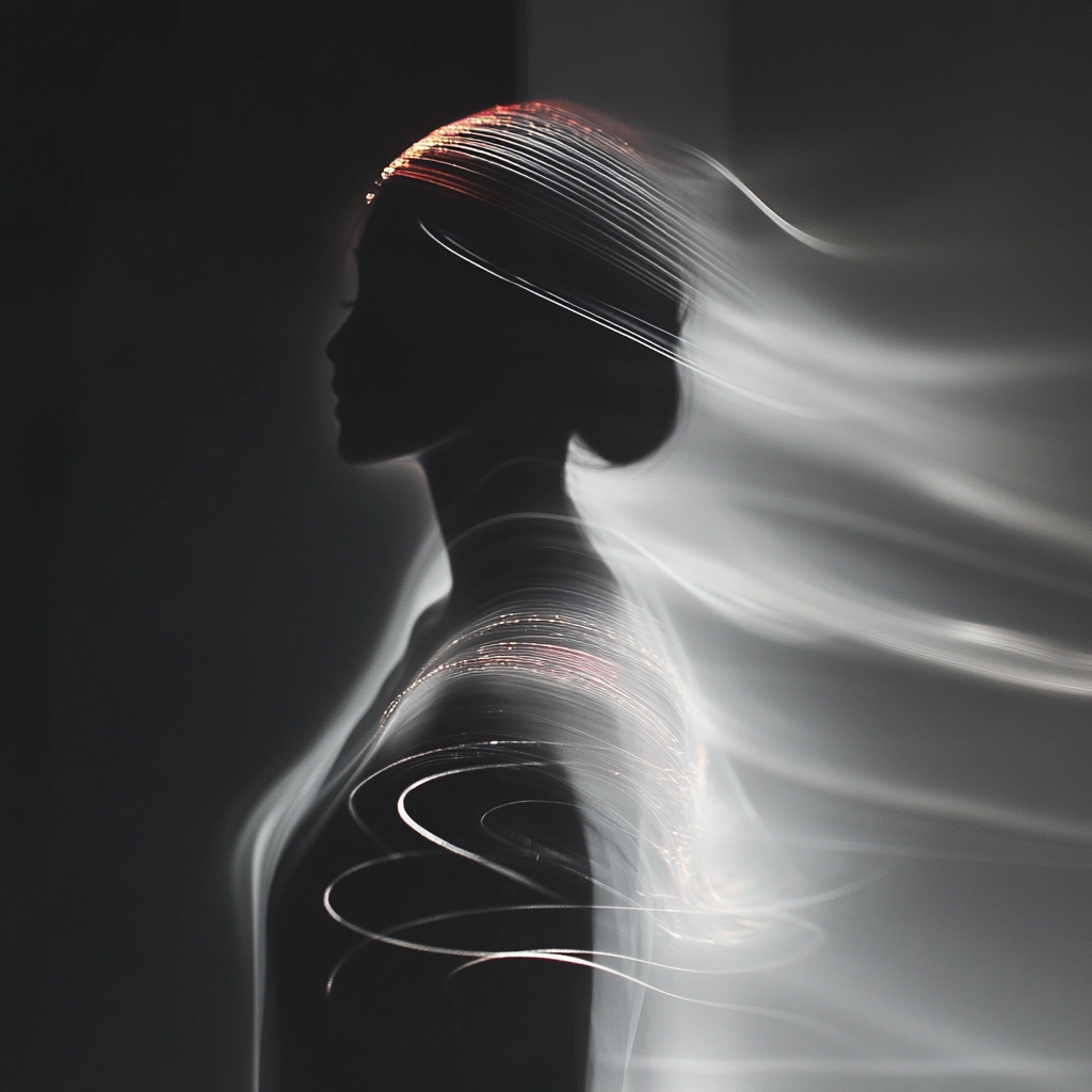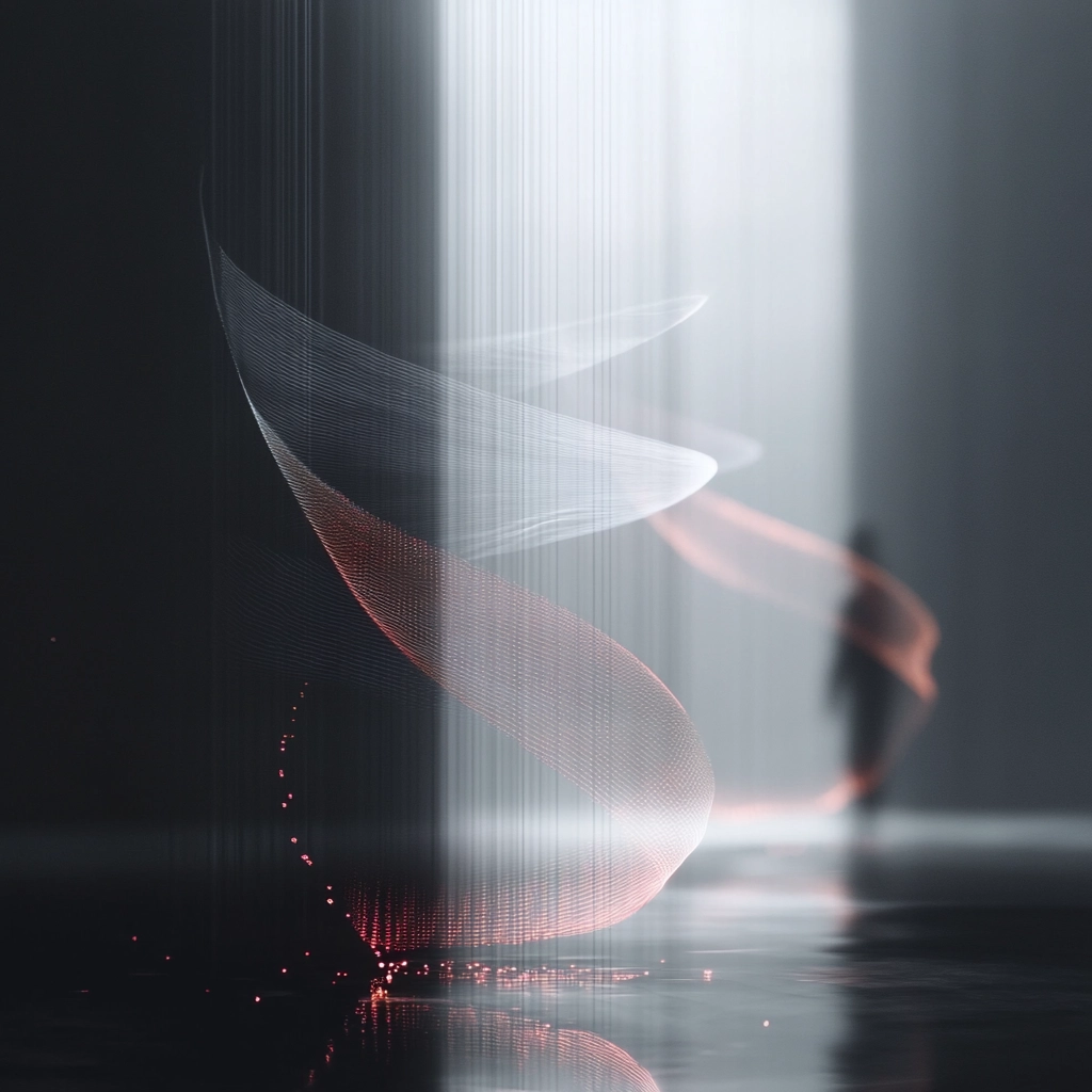 Prominent use of dark tones blended with sharp, luminous light streams creating a sense of motion. Smooth gradients are contrasted by punctuated bursts of red, adding texture and depth. The spatial sense feels fluid, with lines subtly shifting across the composition.