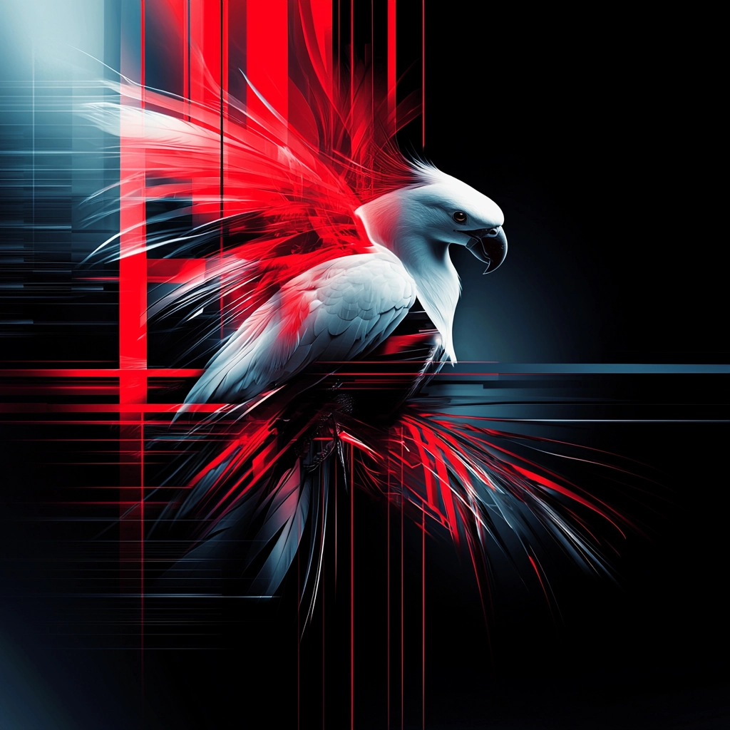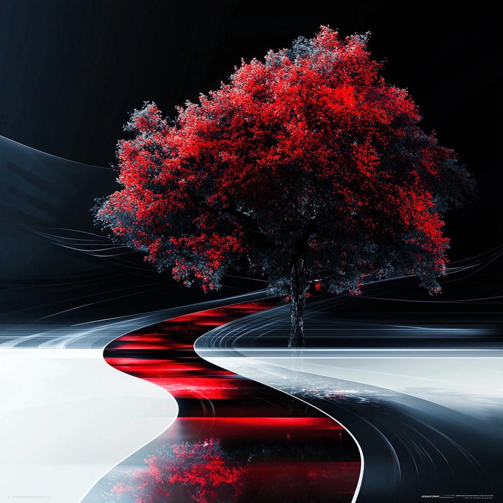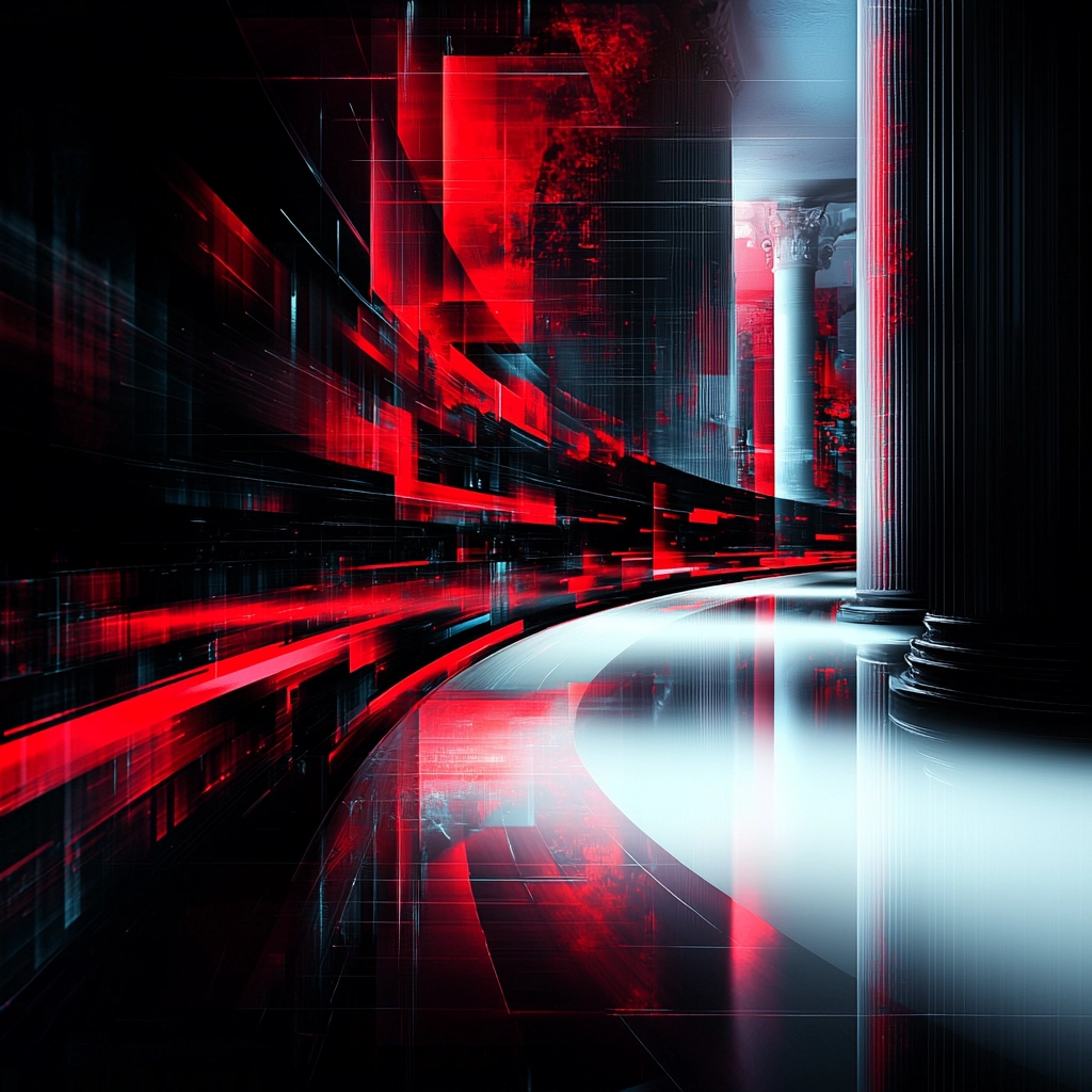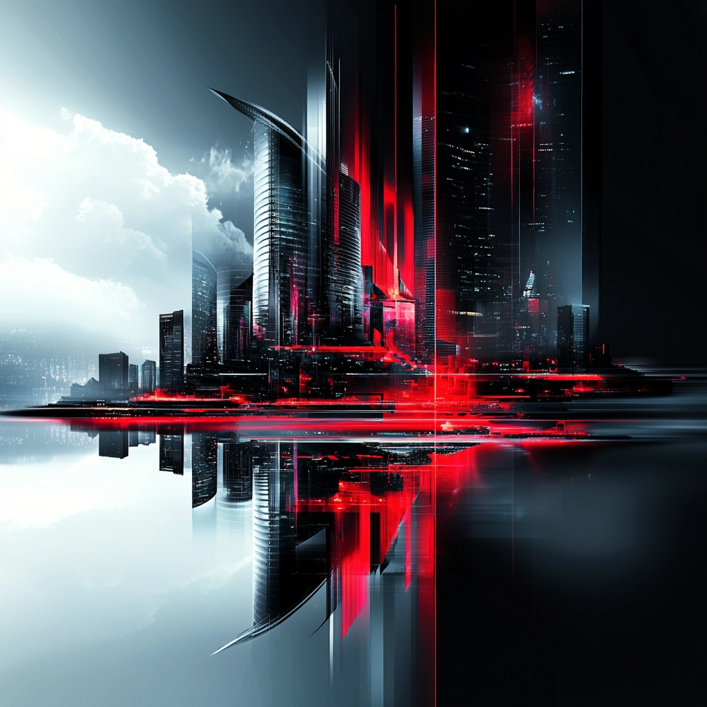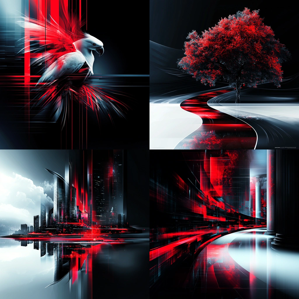 Bold red is sharply contrasted against deep black, creating dynamic forms. The spatial arrangement makes use of sweeping curves and angles. Glossy textures enhance the sharp lighting, resulting in a sleek and contemporary aesthetic.