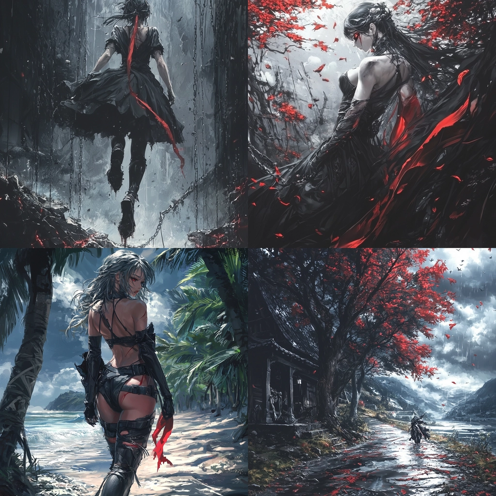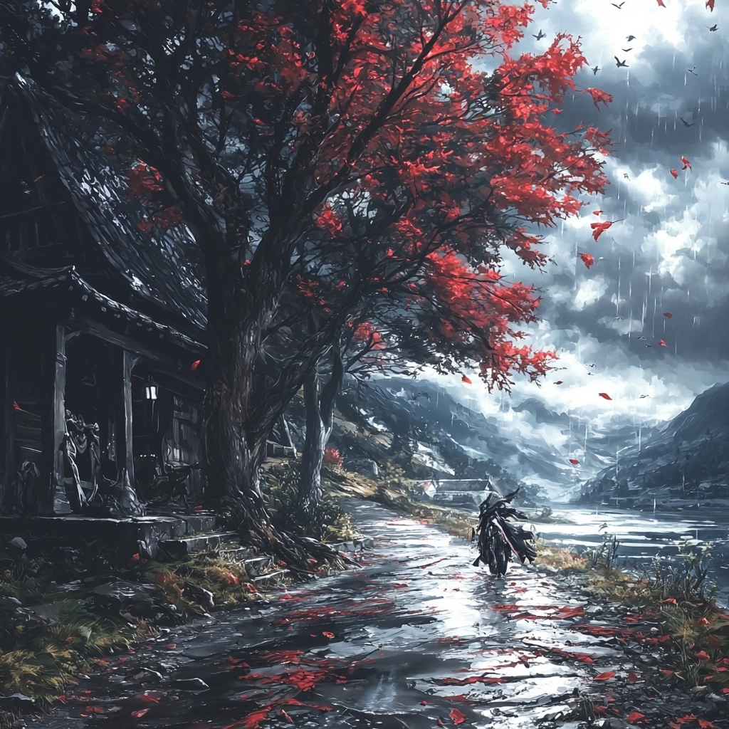 A bold interplay of dark tones and striking red accents creates a dramatic and vivid visual composition.