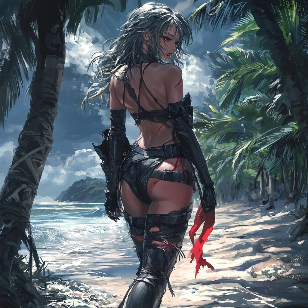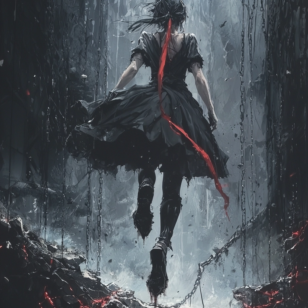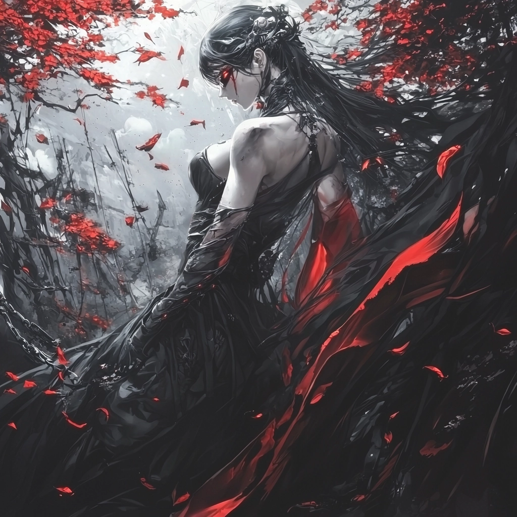 The lighting effectively highlights the contrast between deep shadows and vivid crimson elements, creating a stark visual impact. The texture combines smooth surfaces with intricate detail, establishing a dynamic spatial depth that emphasizes movement and intensity.