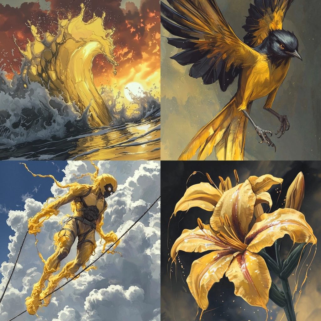 A striking use of luminous yellow dominates, juxtaposed with darker hues and dynamic compositions.