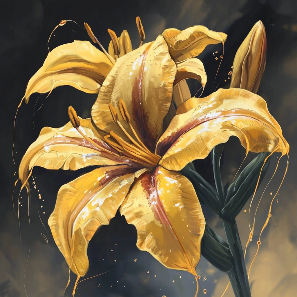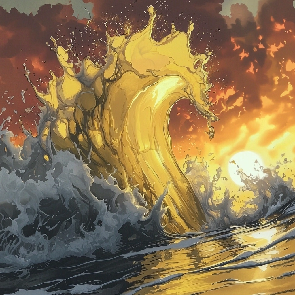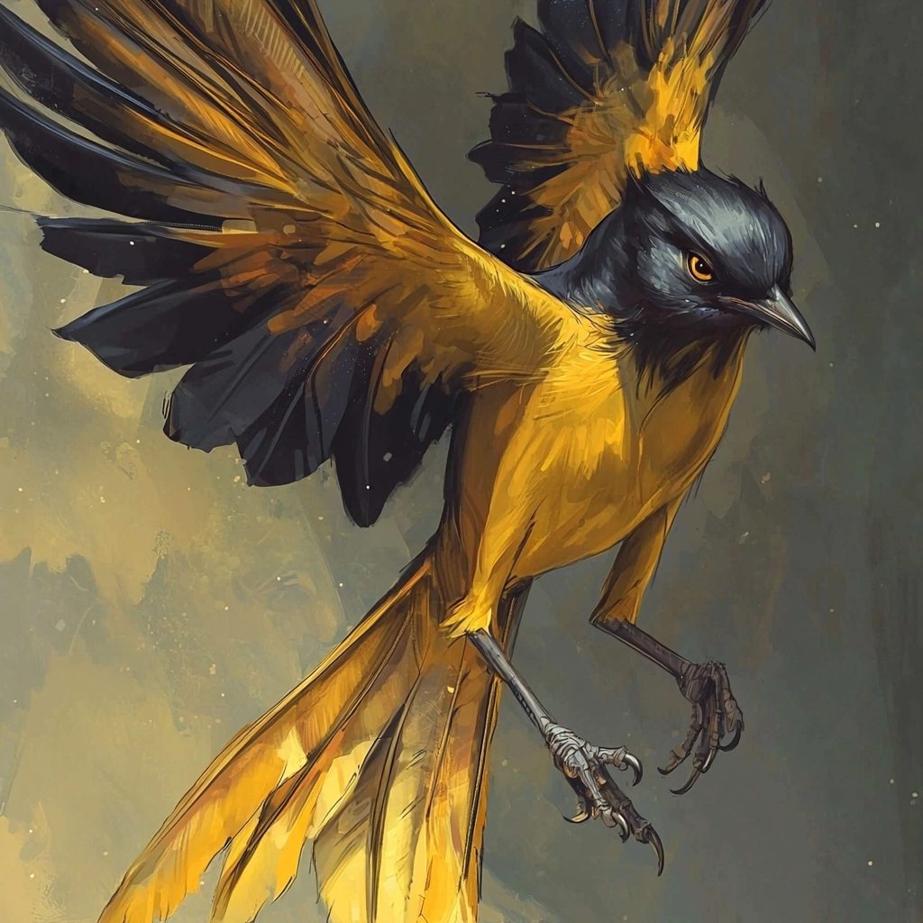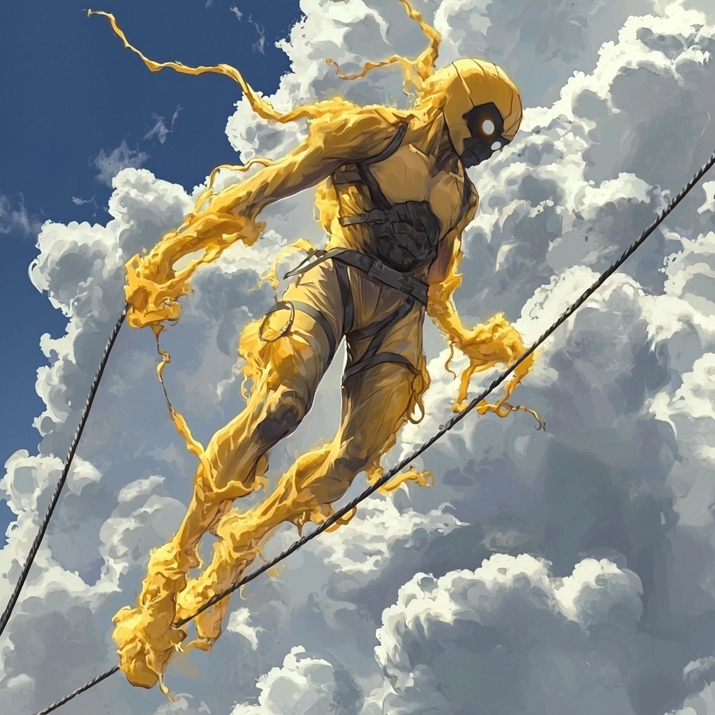 The lighting highlights the vibrant yellow creating a sense of motion against dramatic shadows. Textures range from smooth to sharp, enhancing depth and perspective. The spatial organization propels elements forward, ensuring emphasis on motion and vitality.