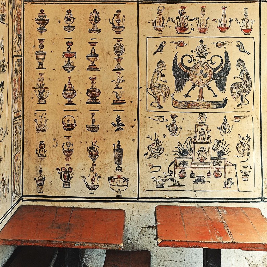 The lighting is uniformly distributed, highlighting the intricate symbolic designs on beige backgrounds. Colors like red and green are used in vivid strokes and patterns, providing flat but richly textured decorative expressions. The spatial arrangement is compact, focusing on the detailed symbol coherence.