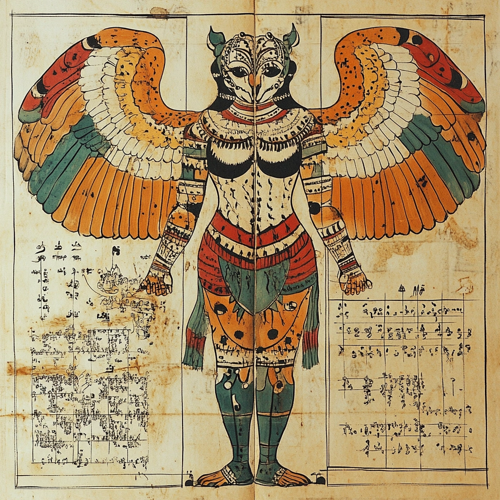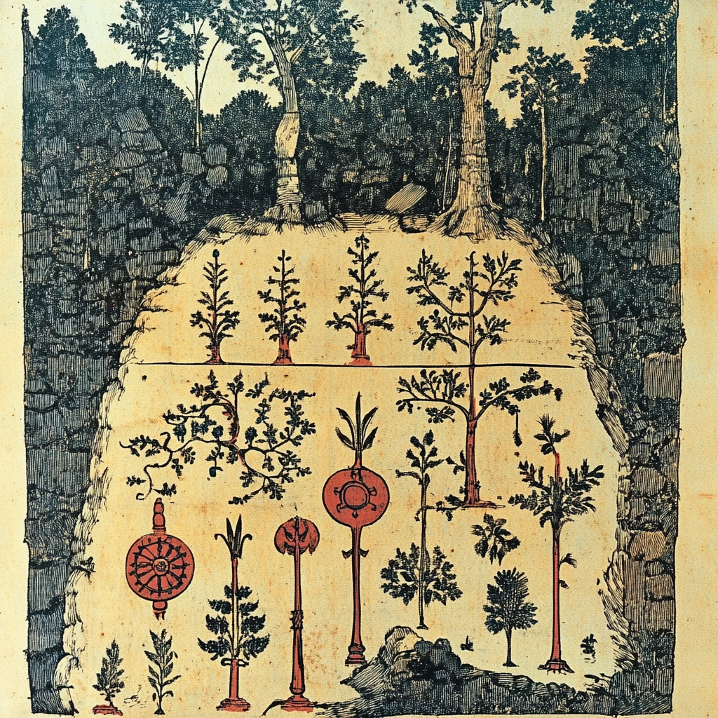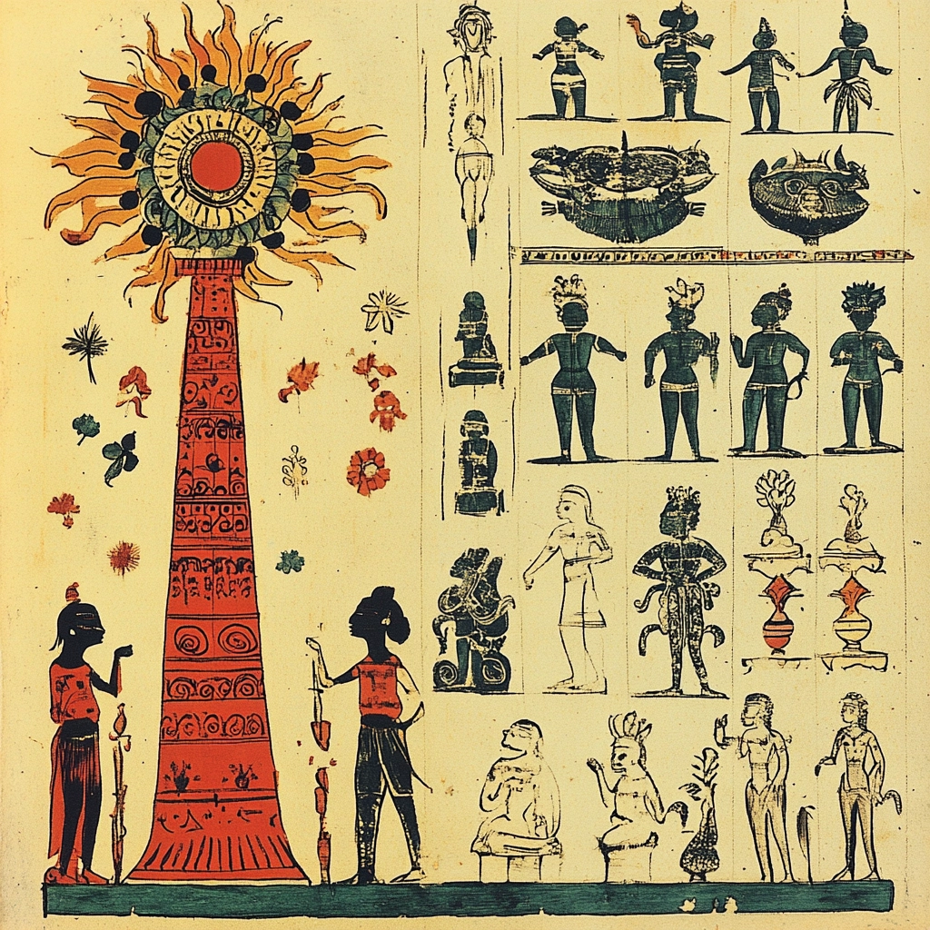 Earthy tones depict intricate symbolic designs with flat, decorative elements.