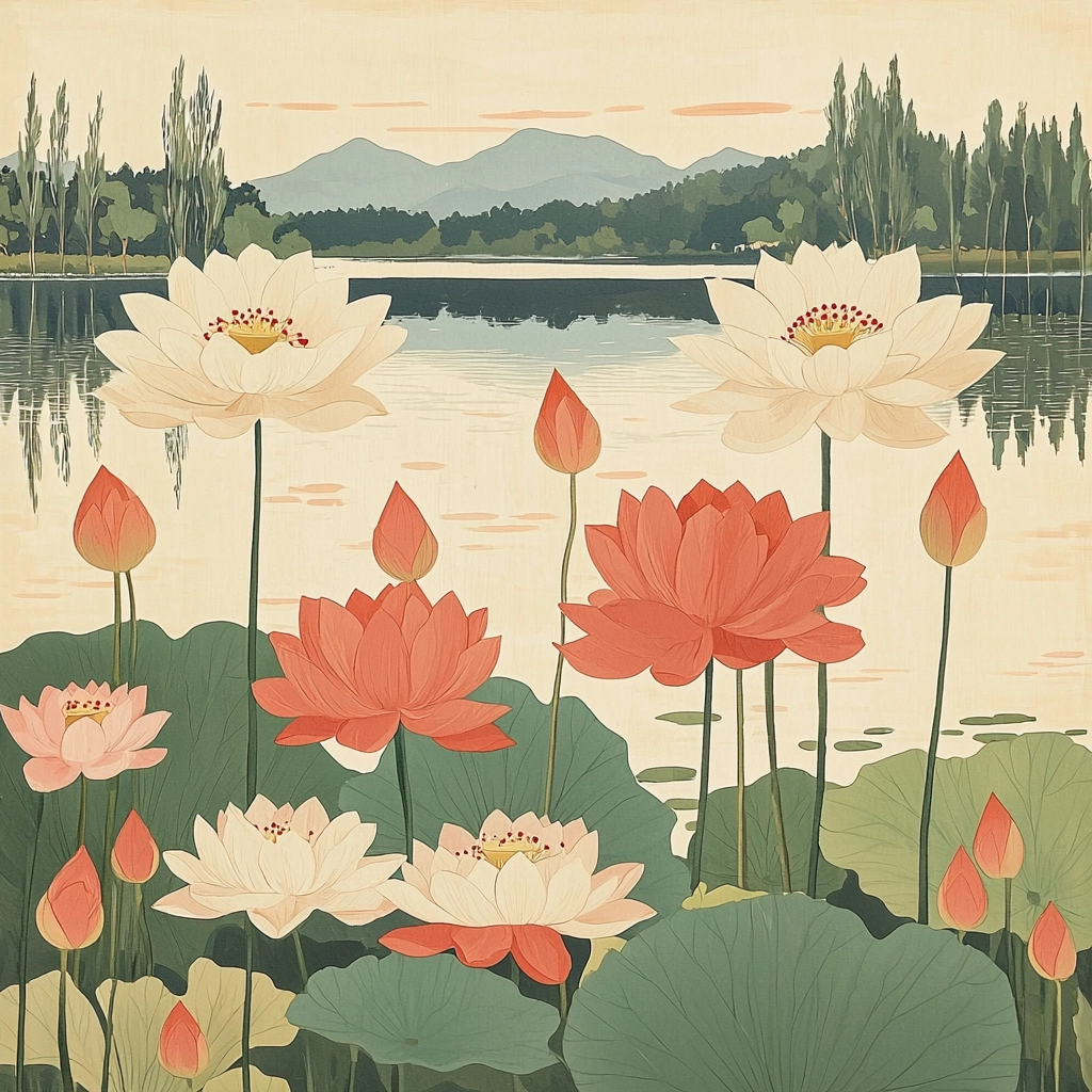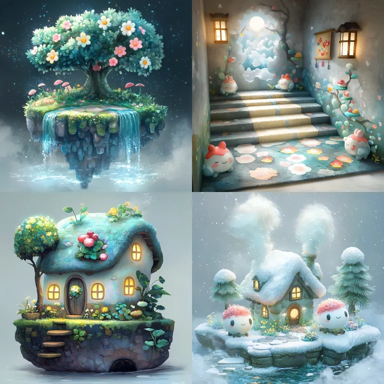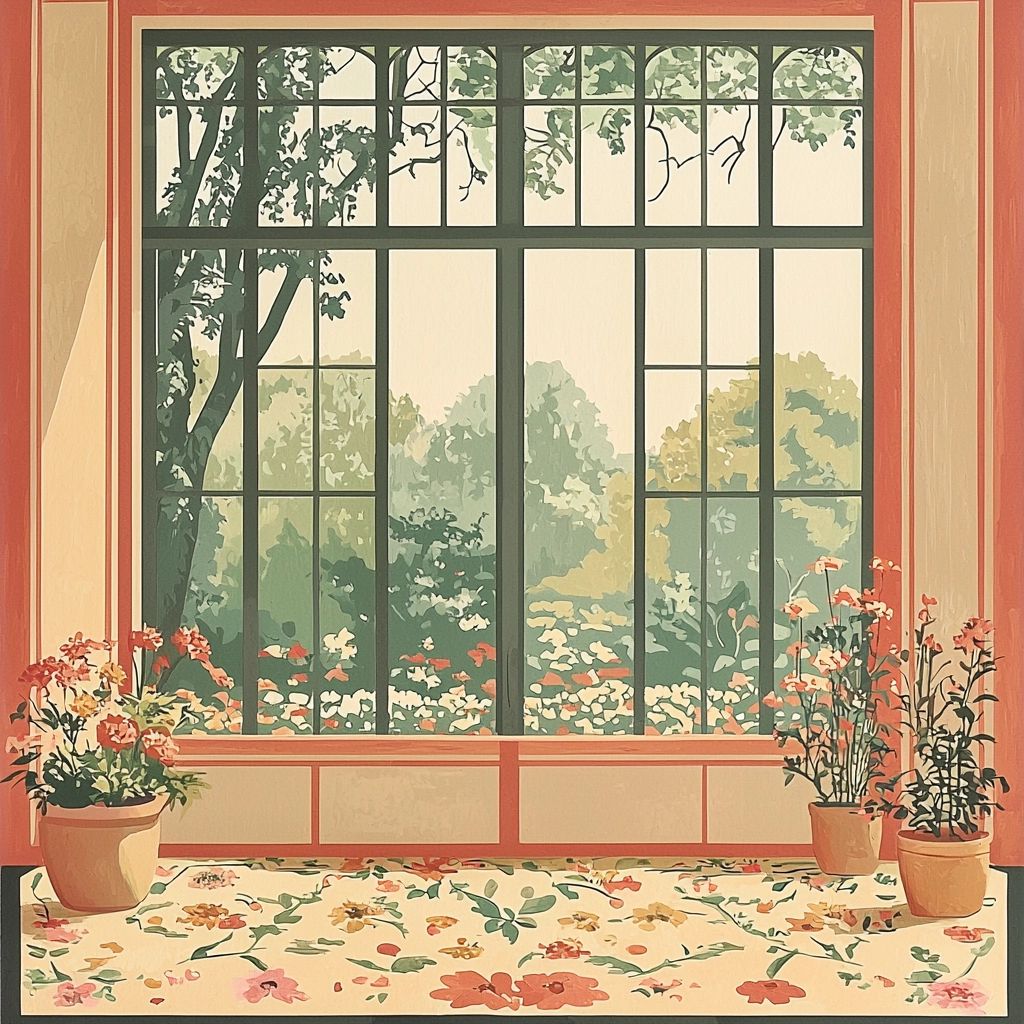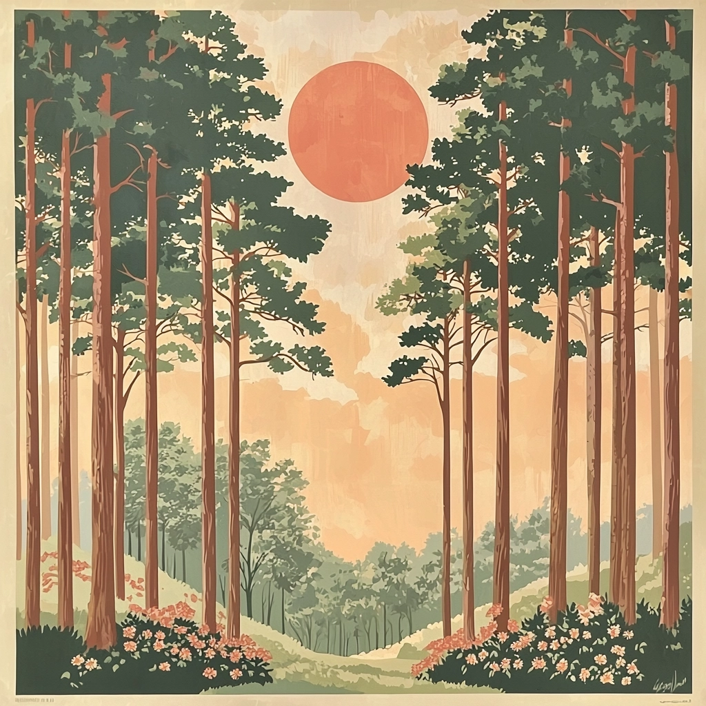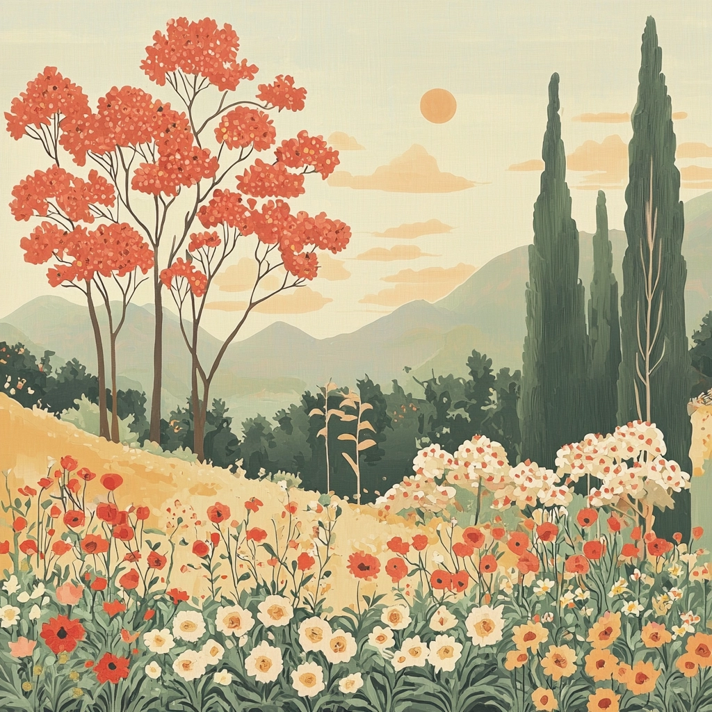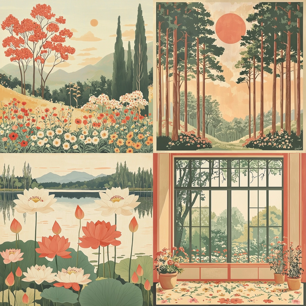 The lighting highlights natural hues, creating a warm glow. Cool greens contrast gently with soft oranges, enriched by subtle beige gradients. The texture is smooth, with a rich depth elevating the simple geometry into an immersive space perception.