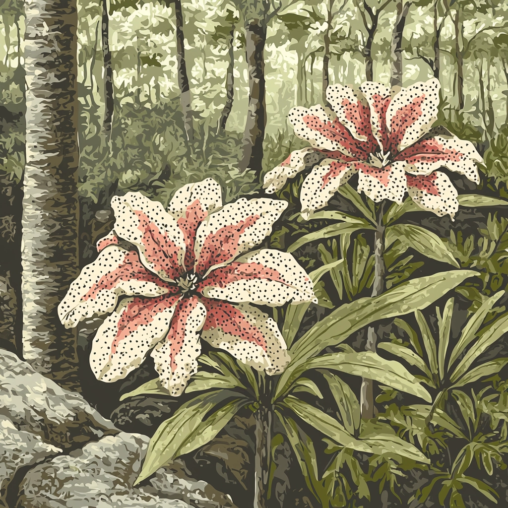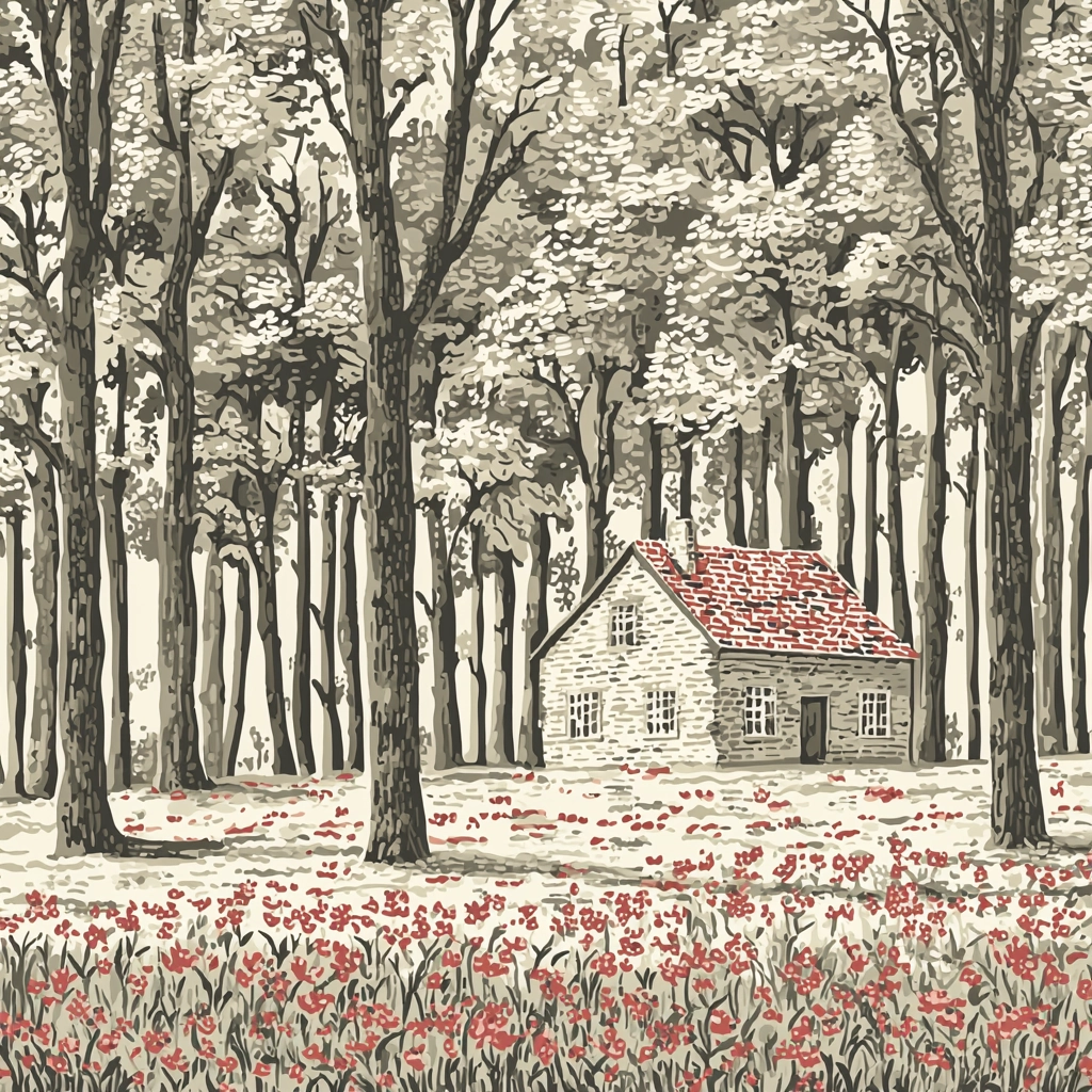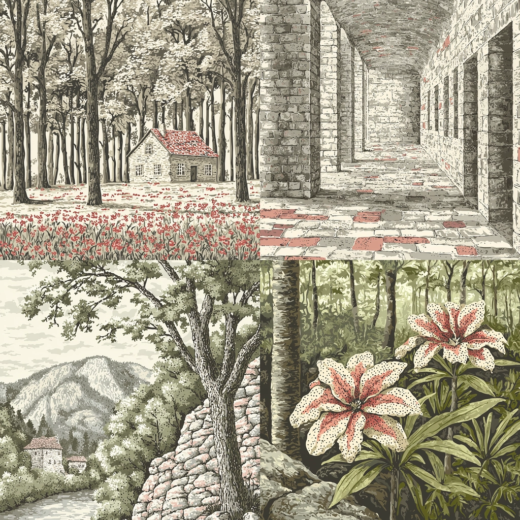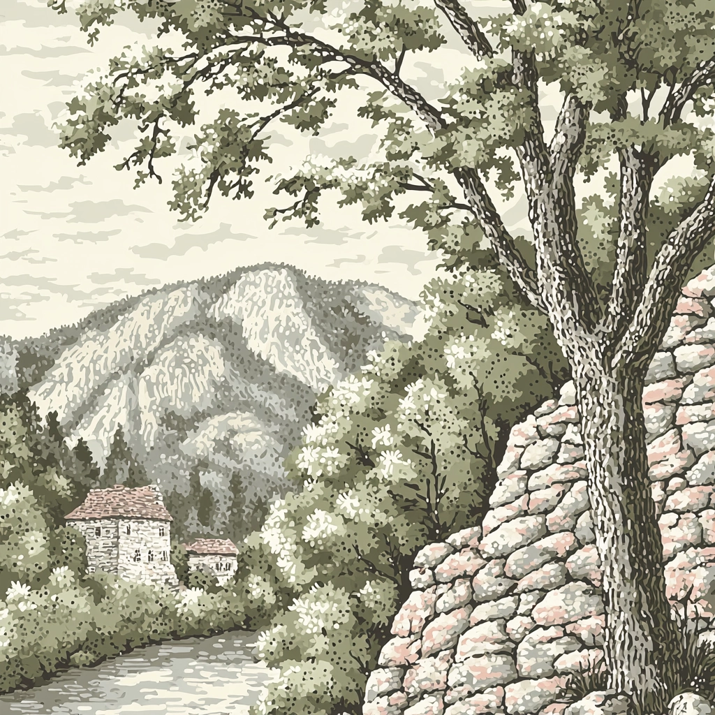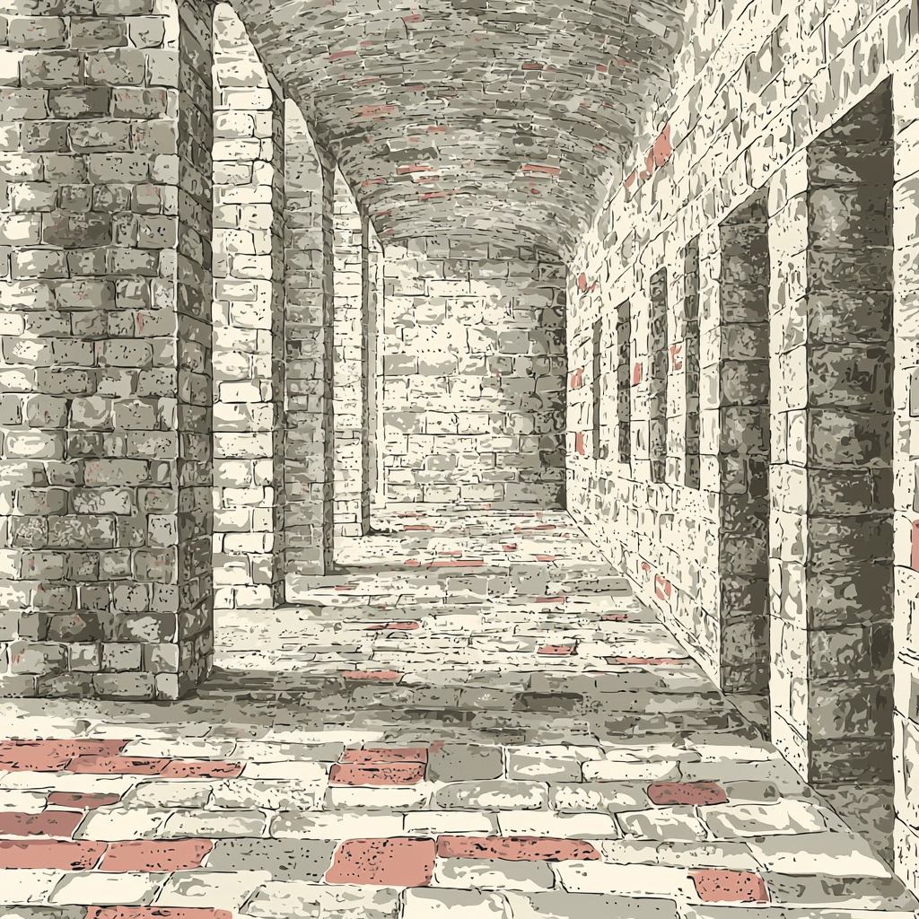 The lighting highlights the intricate textures of natural elements and stone structures, illuminating the balance between open spaces and enclosed areas with a controlled use of light. Earthy hues provide a muted palette, grounding elements with subtle depth and a tactile quality.