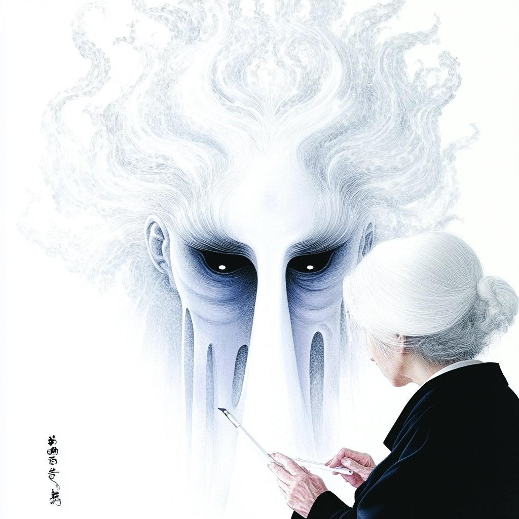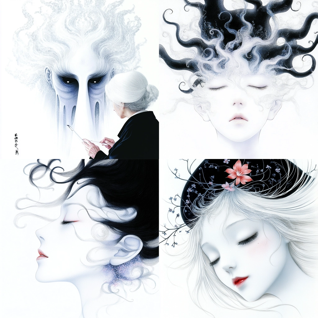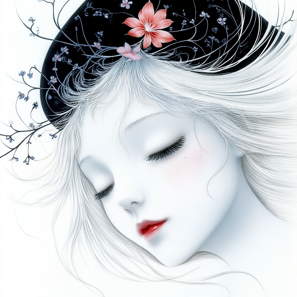 Intricate lines and a predominance of white punctuated by black and accents of pink form a balanced and flowing composition.