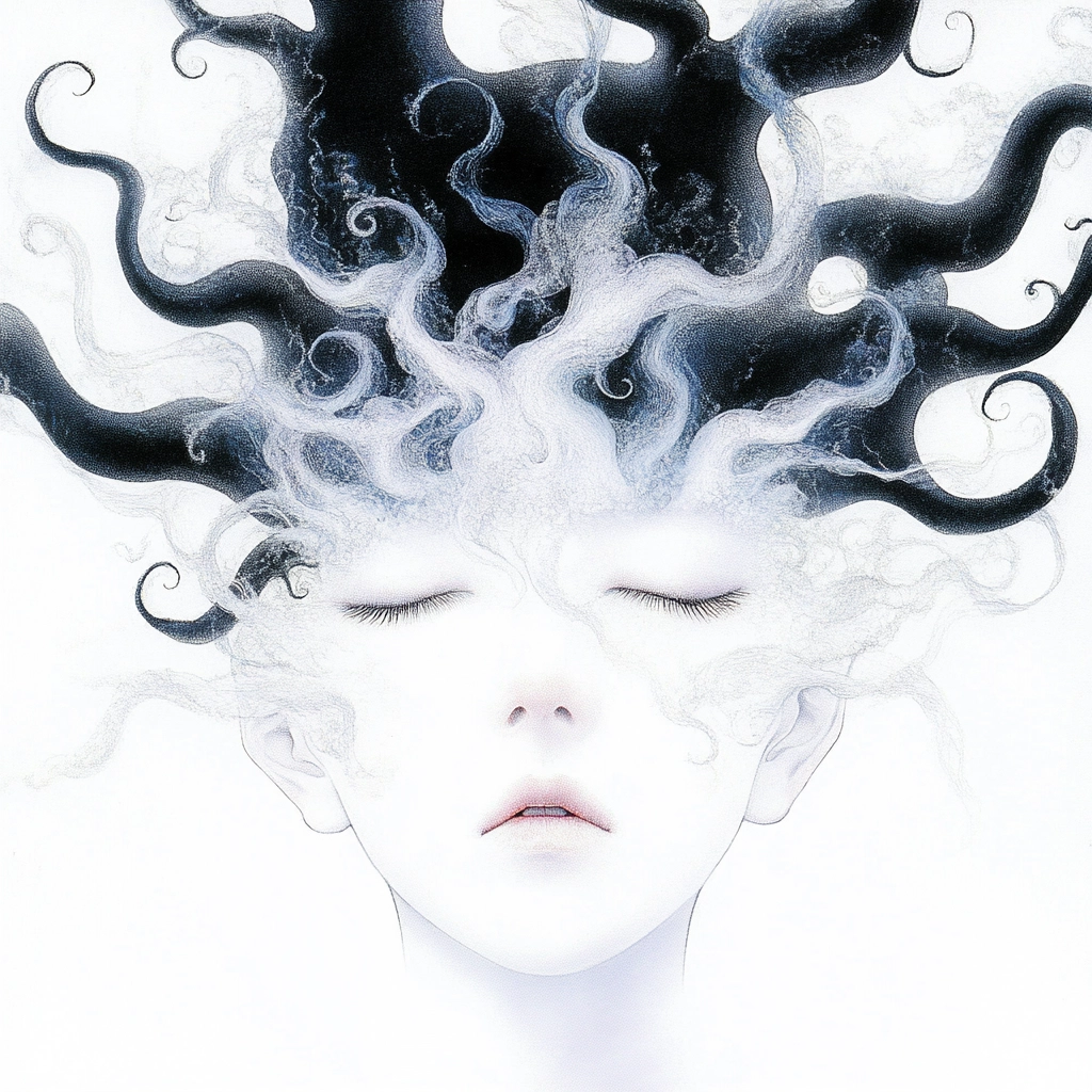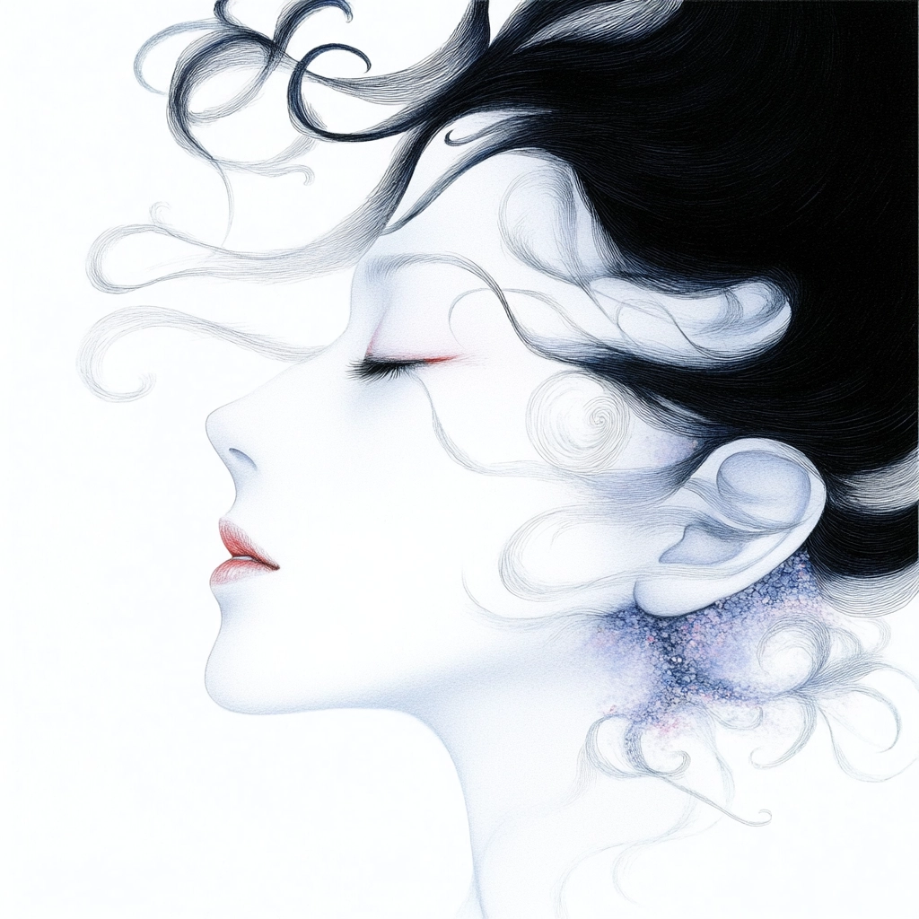 The lighting emphasizes the contrast between the light and dark areas, highlighting details with subtle gradients. White dominates the space, giving it an airy feel, while the smooth texture of lines and minimally used pink add delicate touches. The spatial arrangement creates a sense of fluid motion and continuity.