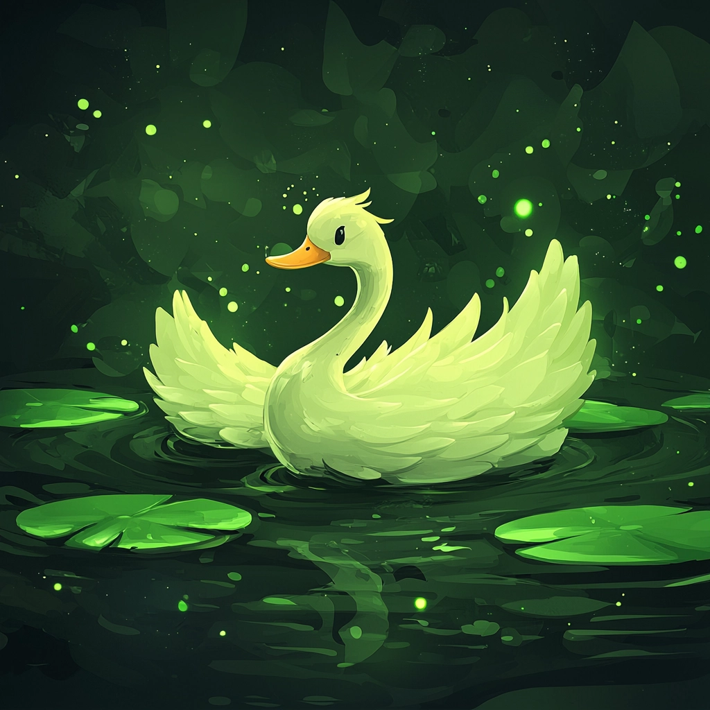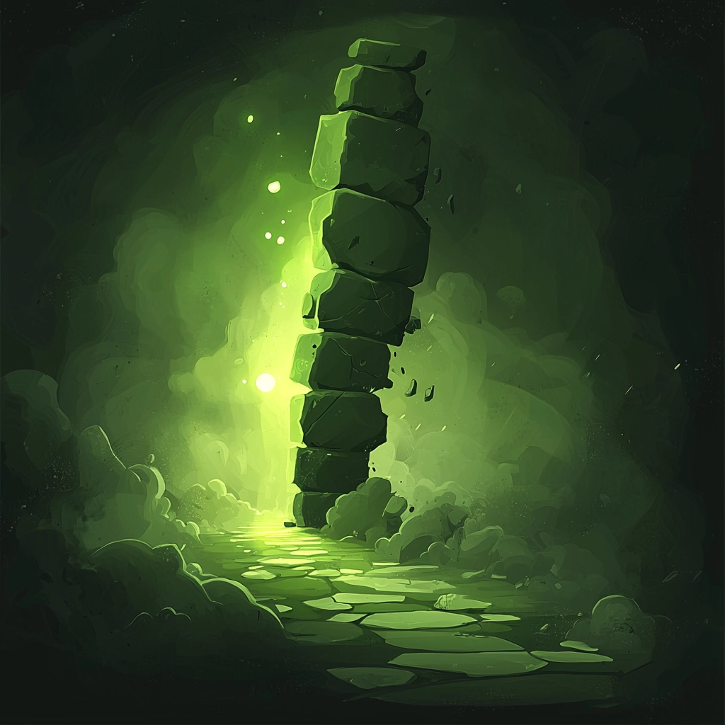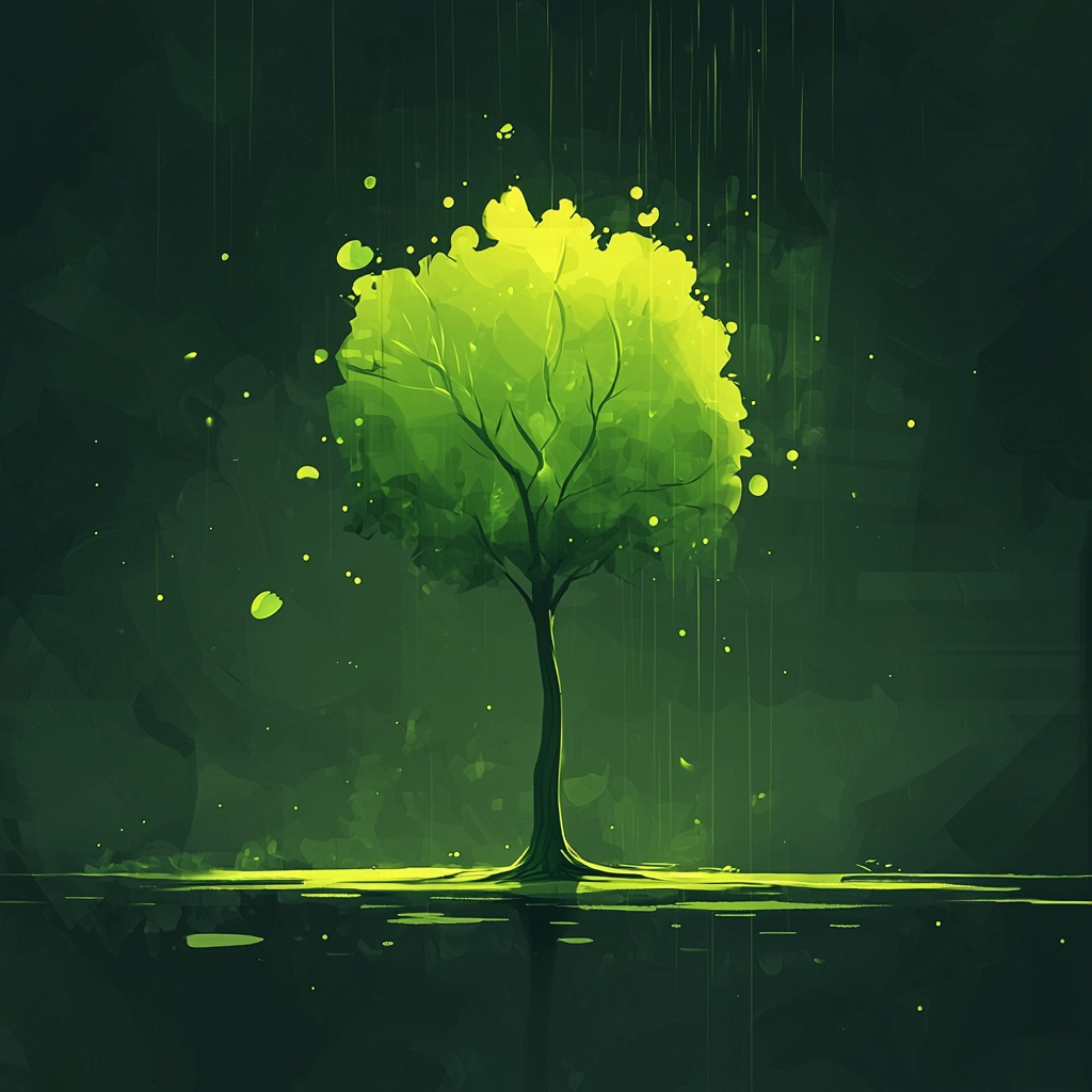 The lighting creates dynamic interplay between illumination and shadow, enhancing the vivid green tones. Textures appear smooth and fluid, while spatial depth is accentuated through layered color gradients, leading to vibrant contrast.