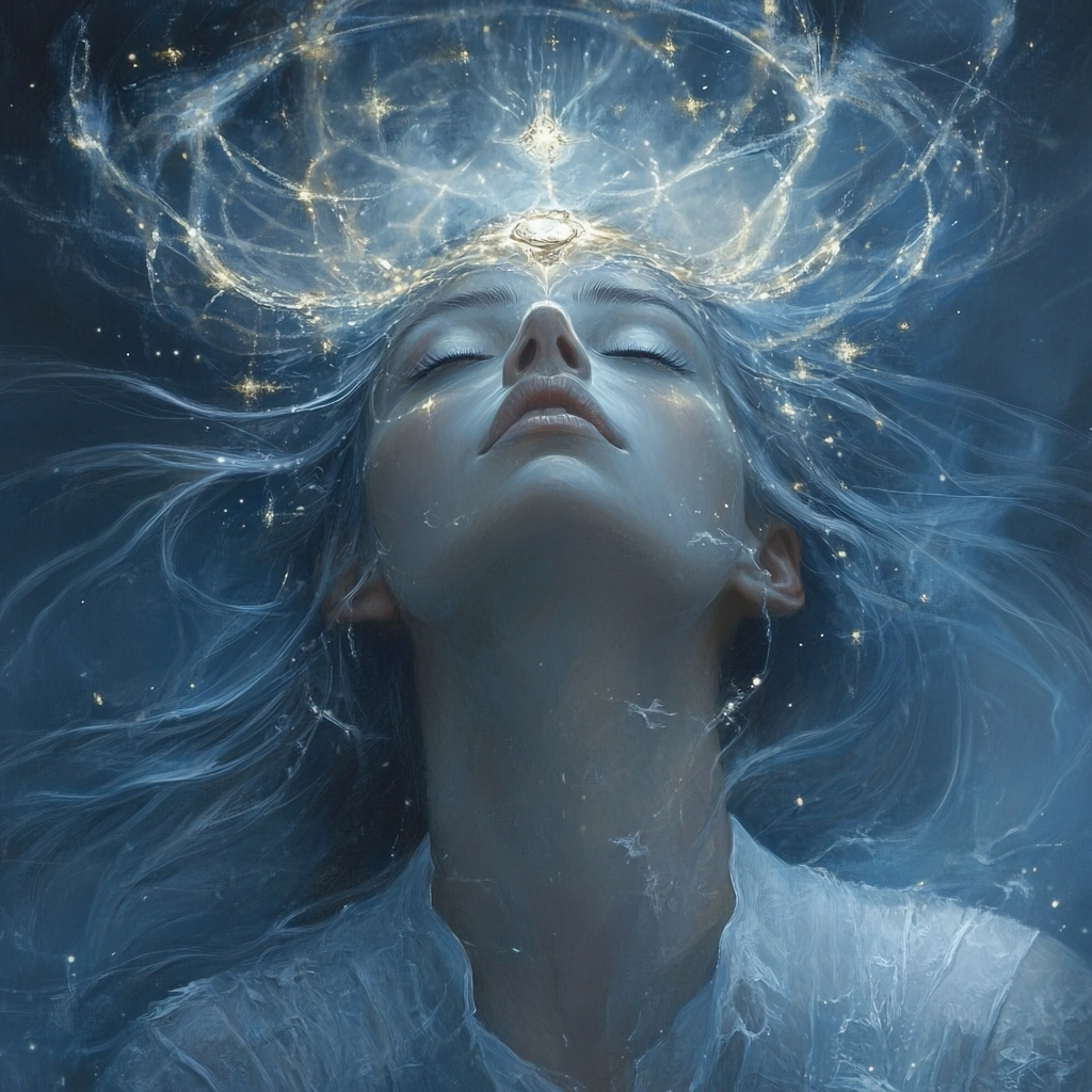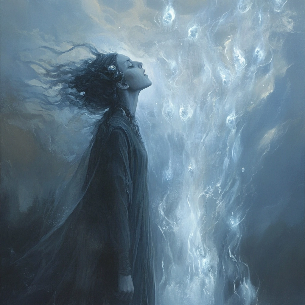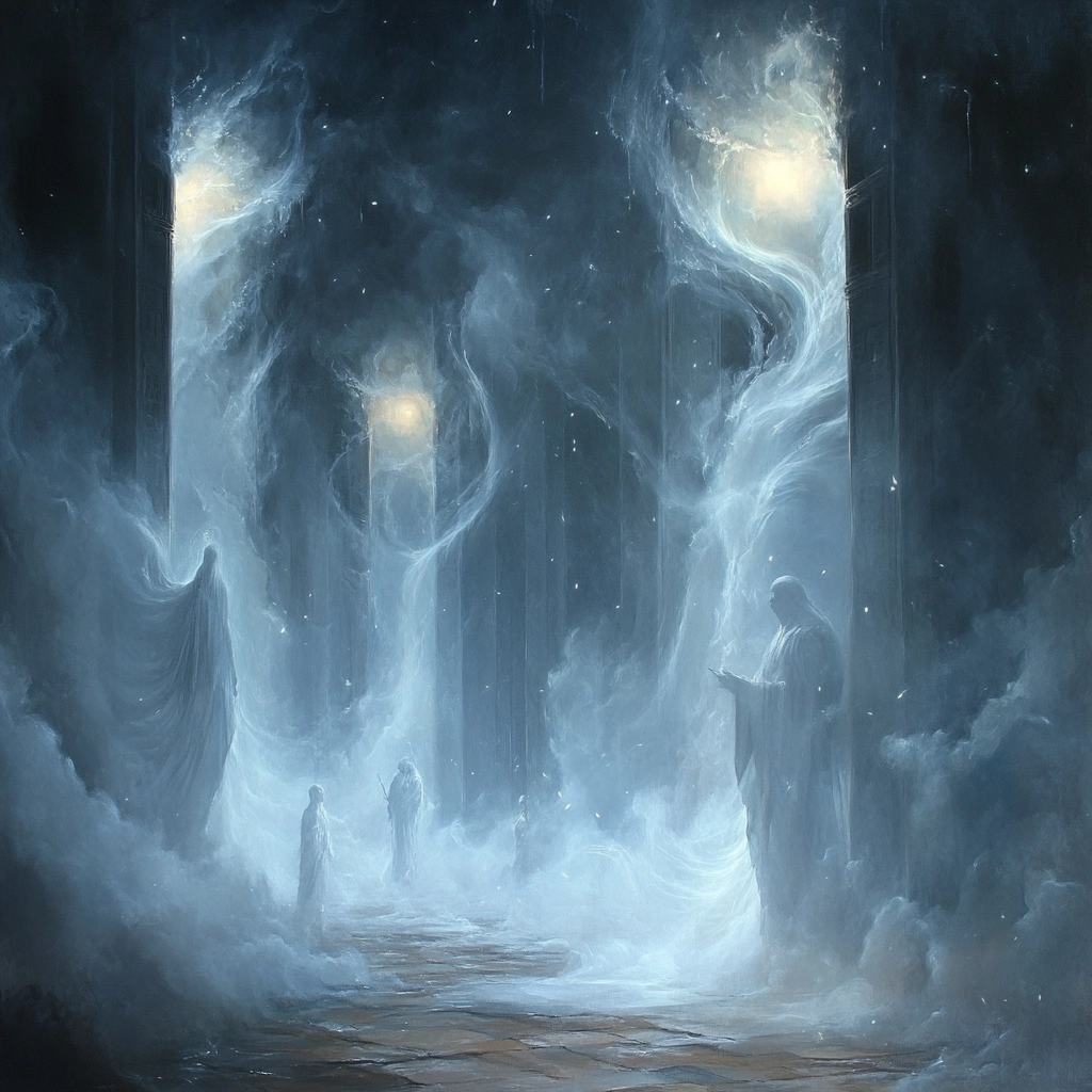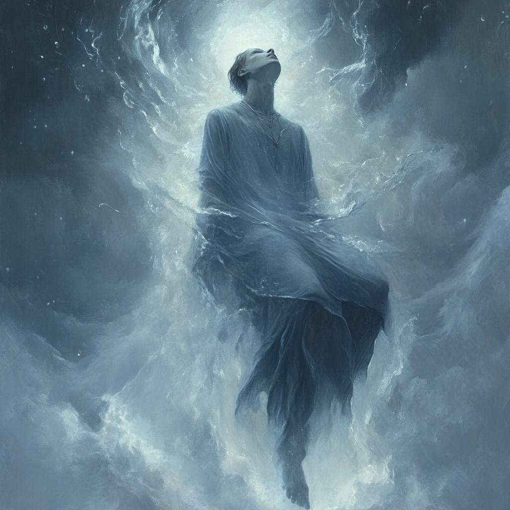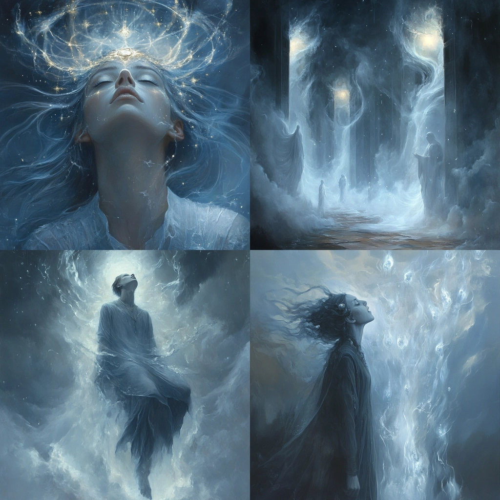 Soft lighting accentuates delicate forms, casting an ethereal glow. The palette blends blue, white, and gray hues, conveying a sense of spatial openness and gentle movement. Textures are smooth, enhancing the scene's fluidity.