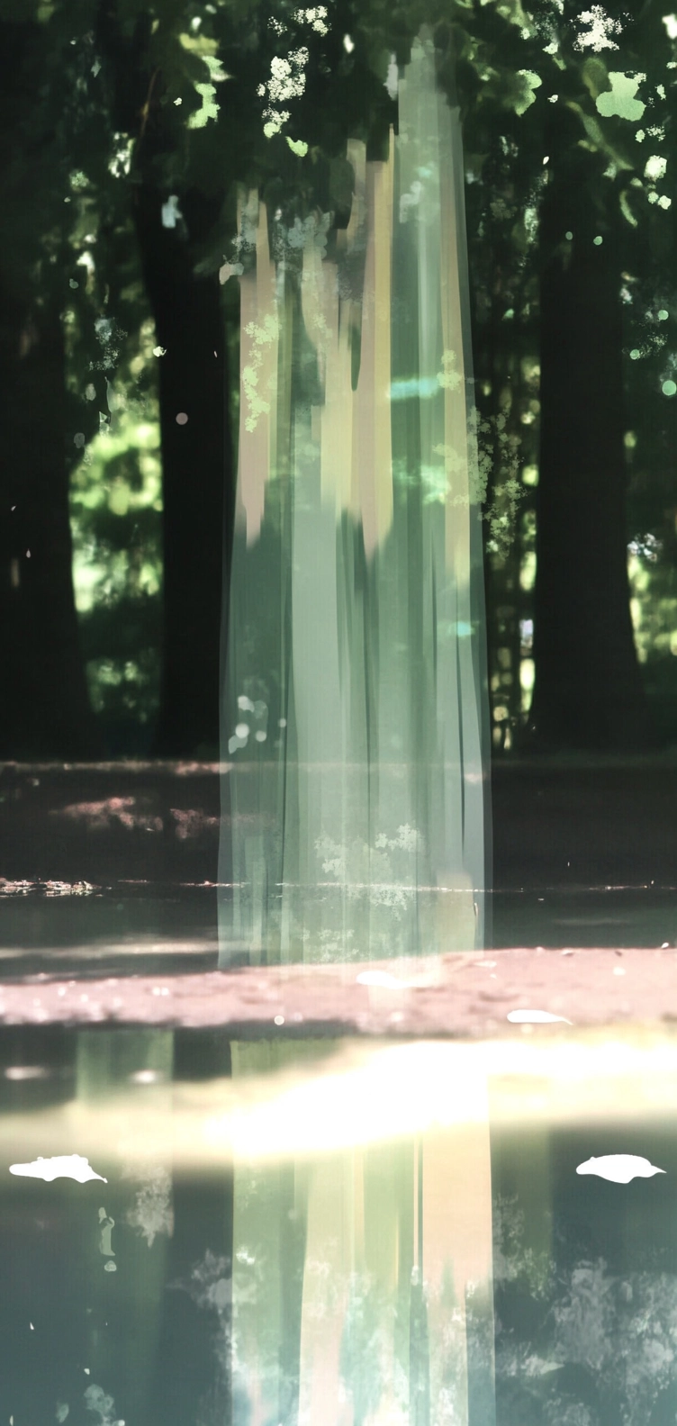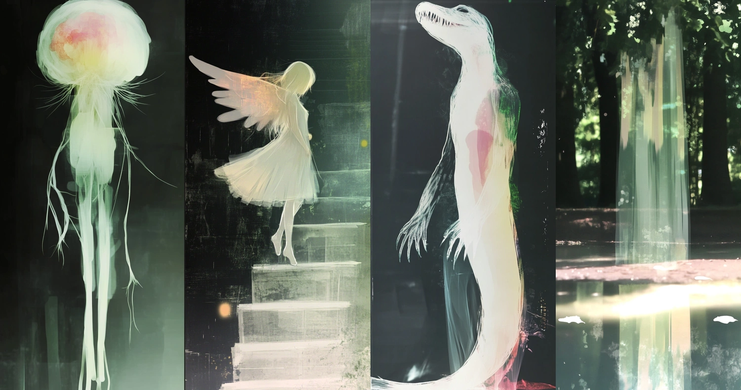 Soft lighting creates a glow effect against dark backgrounds, enhancing the translucence of figures. The use of blended colors with defined vertical forms creates a sense of dynamic movement and contrast.