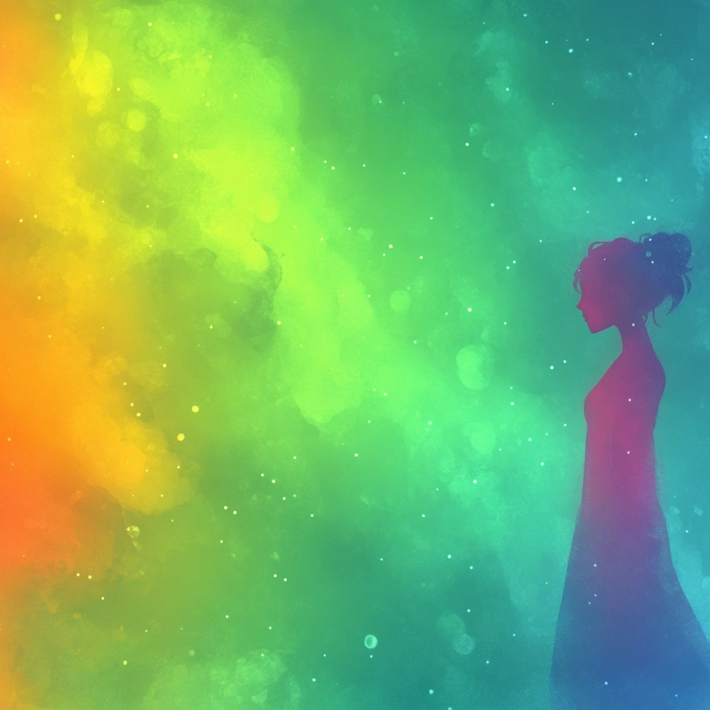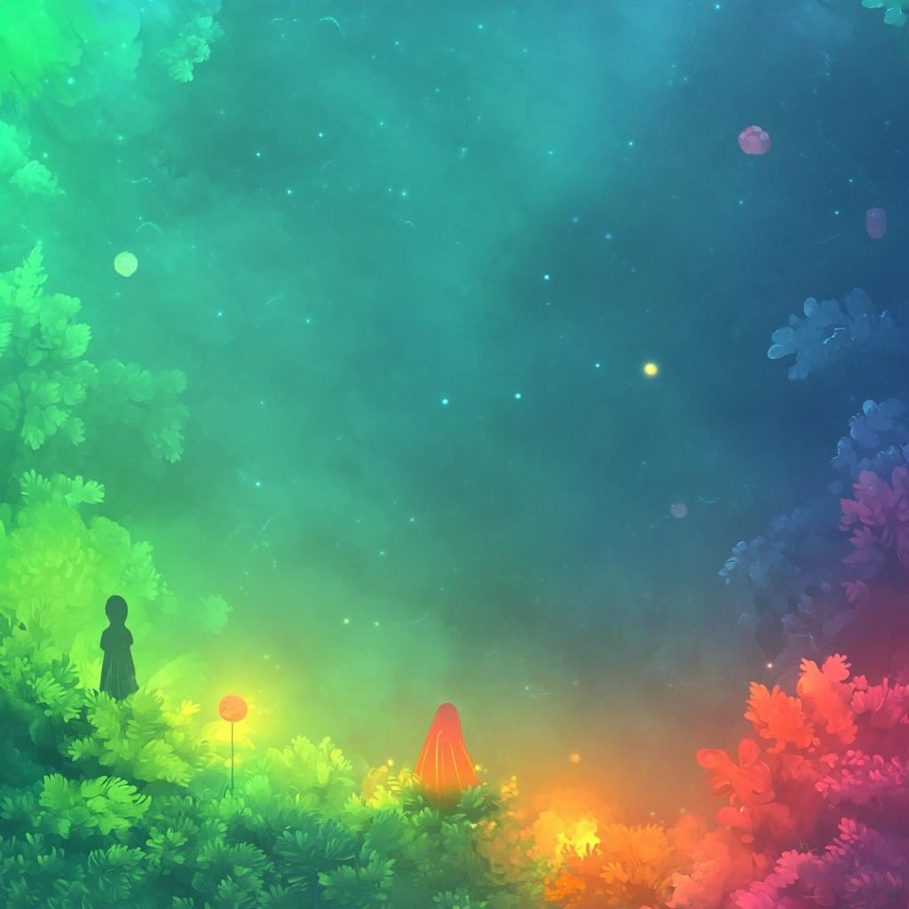 Uses vibrant lighting effects to highlight transitions between colors. Green, yellow, and blue hues blend seamlessly, producing gradient effects that enhance spatial depth. Texture is smooth, contributing to an ethereal glow across the image.