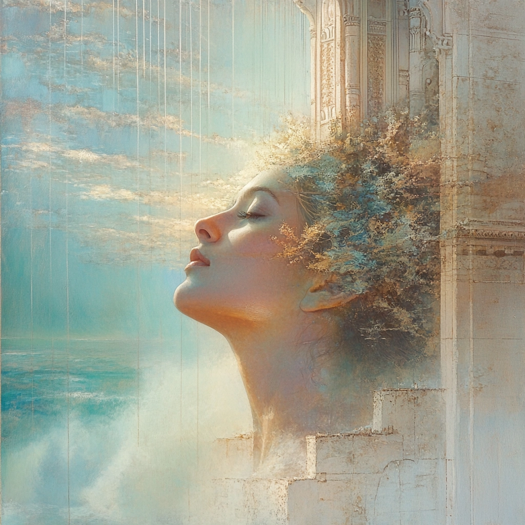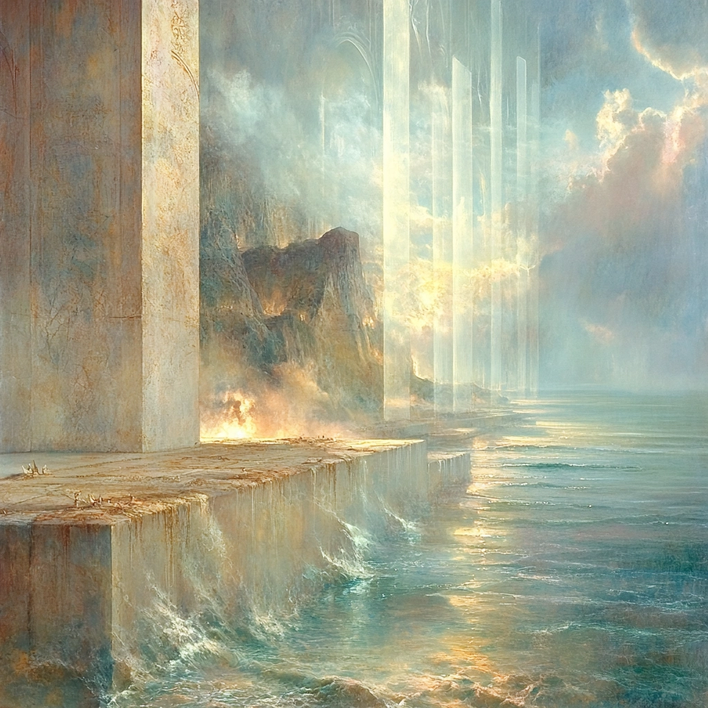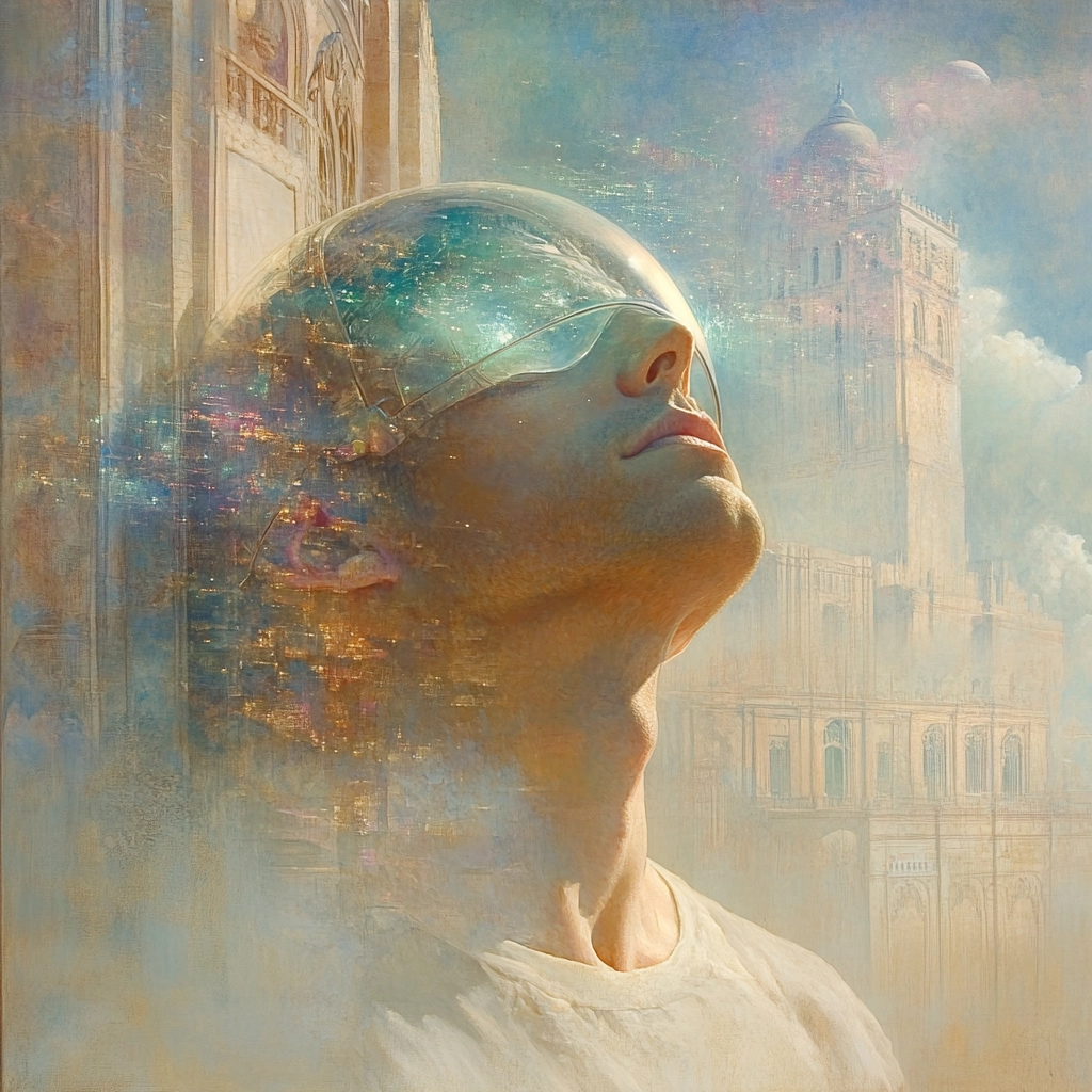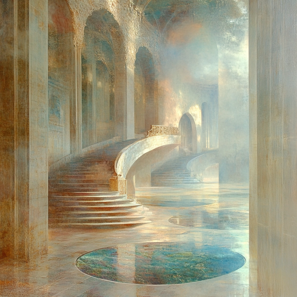 Soft, diffused lighting enhances architectural forms, enveloping them in a dreamlike haze with muted, harmonious color palettes.