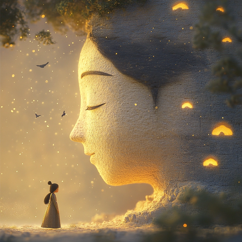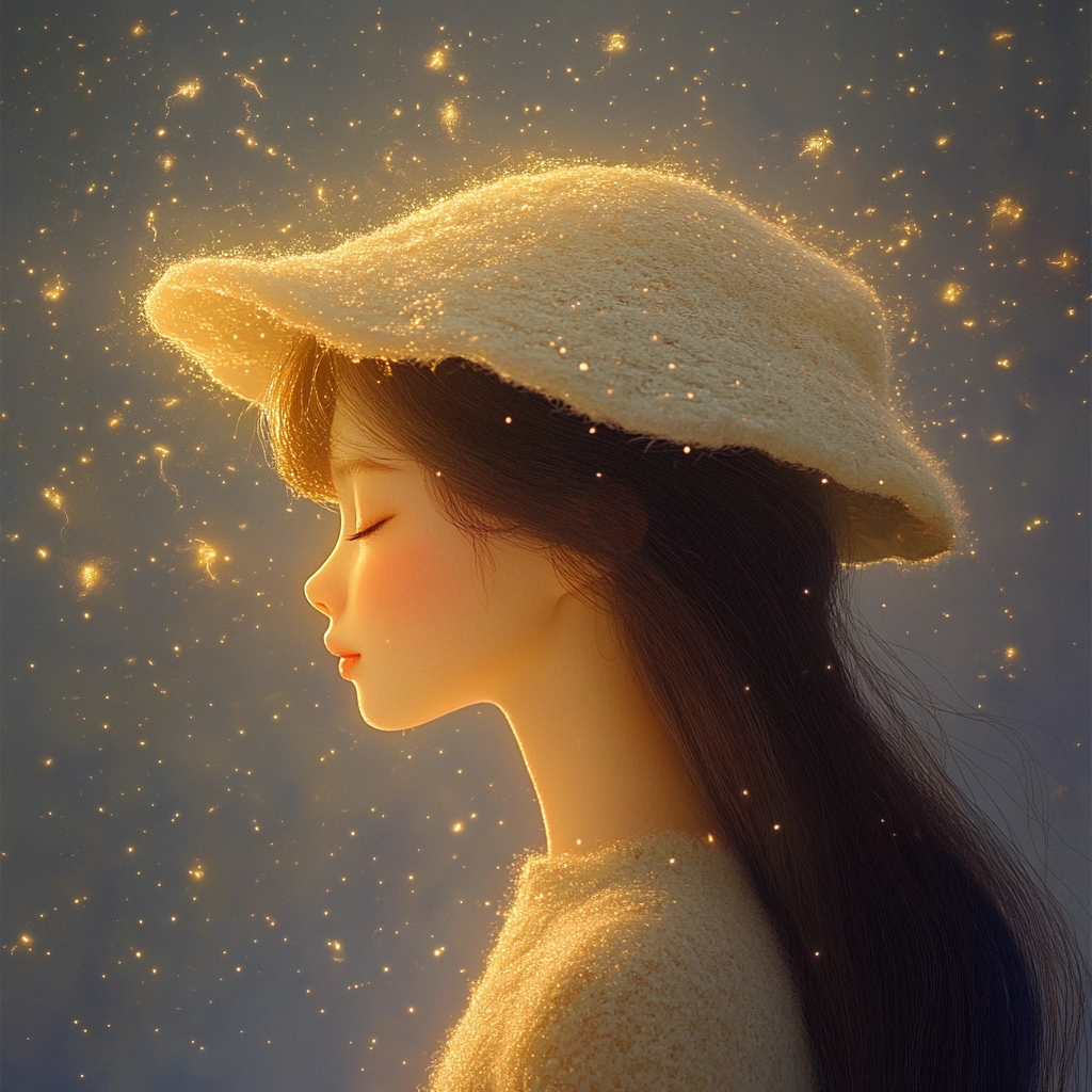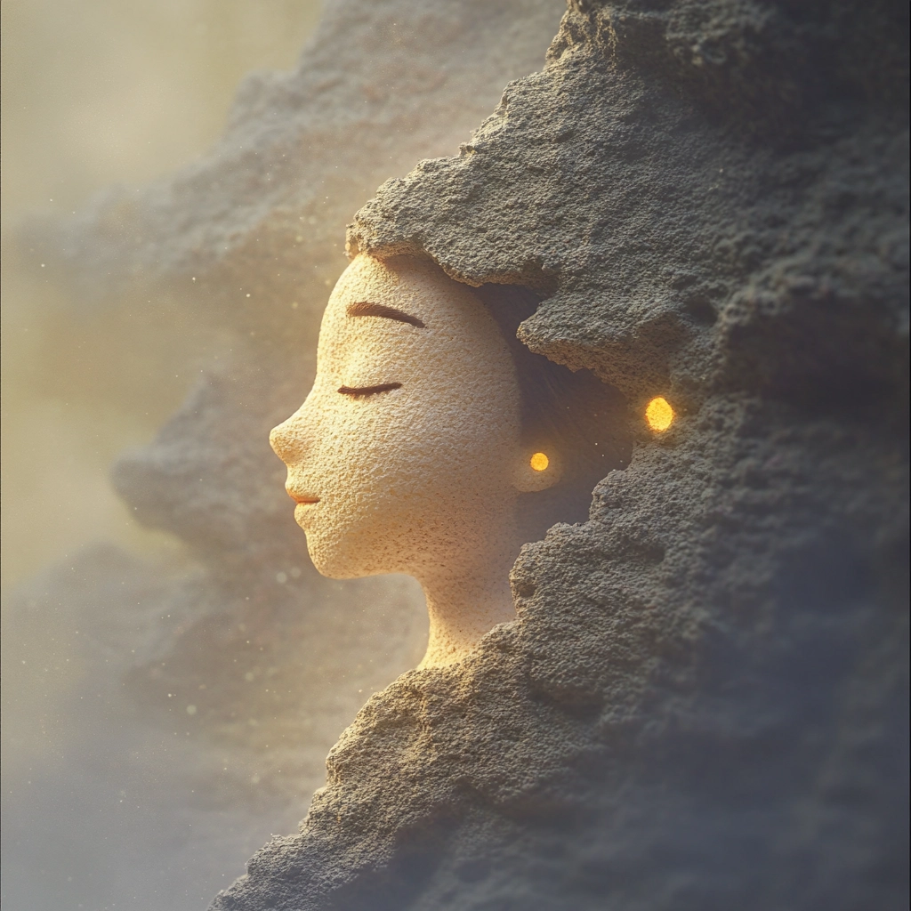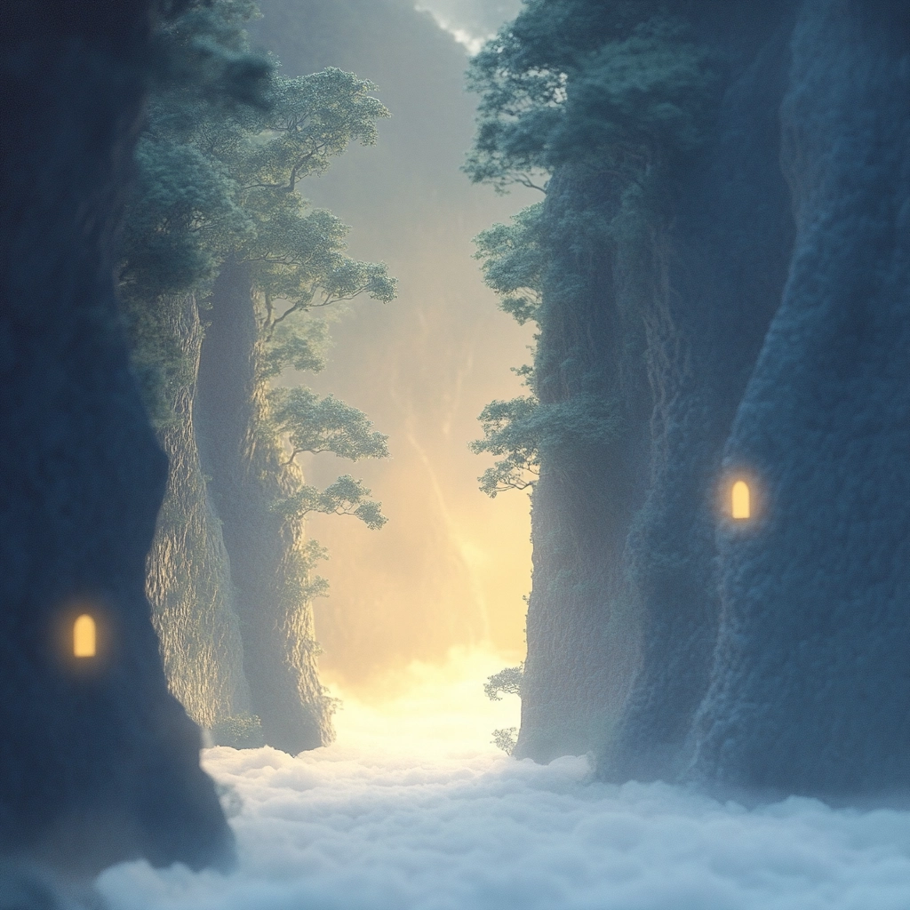 The lighting effects offer a glowing quality, contrasting with cool blues and golden hues. Space is expansive yet intimate, with textures that evoke a tangible sense of depth and warmth. The composition is balanced, inviting observation through its subtle details.