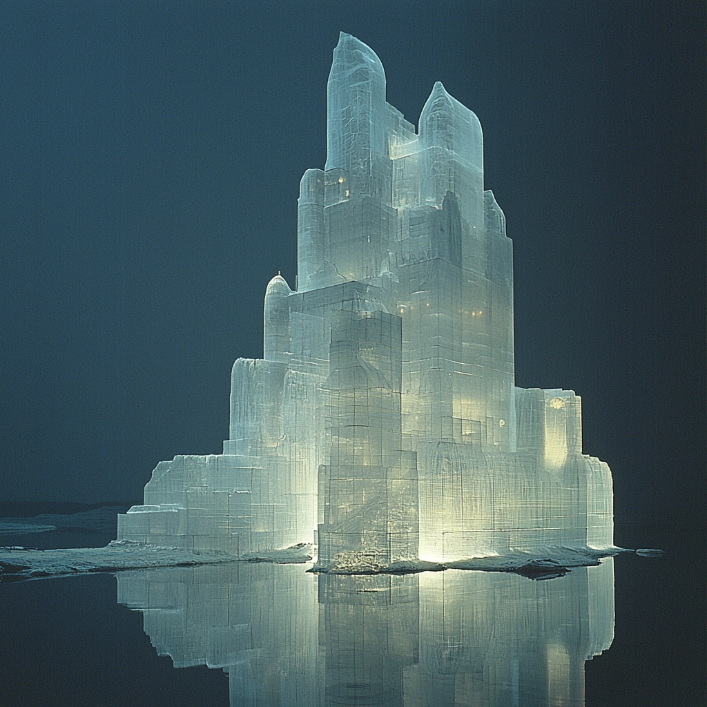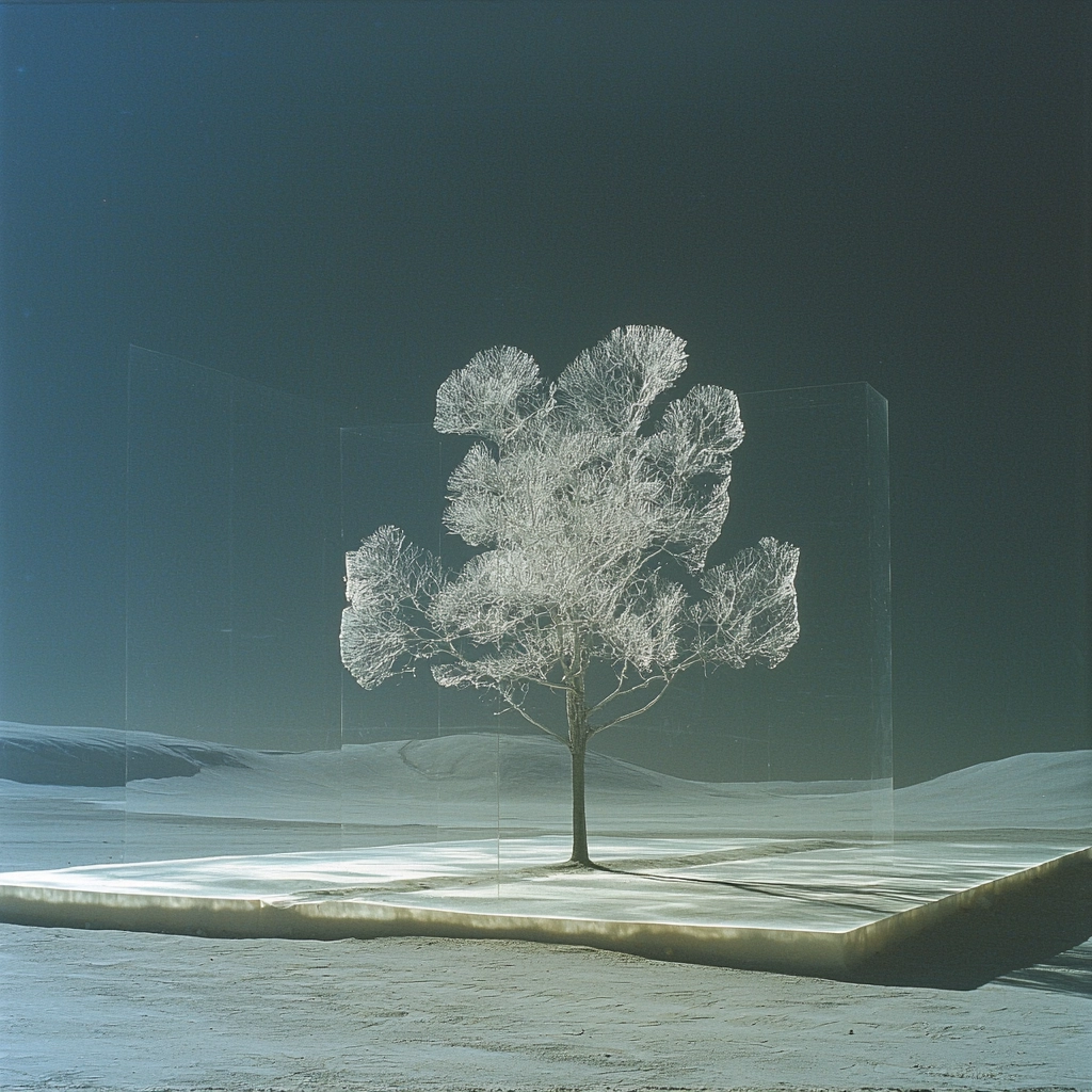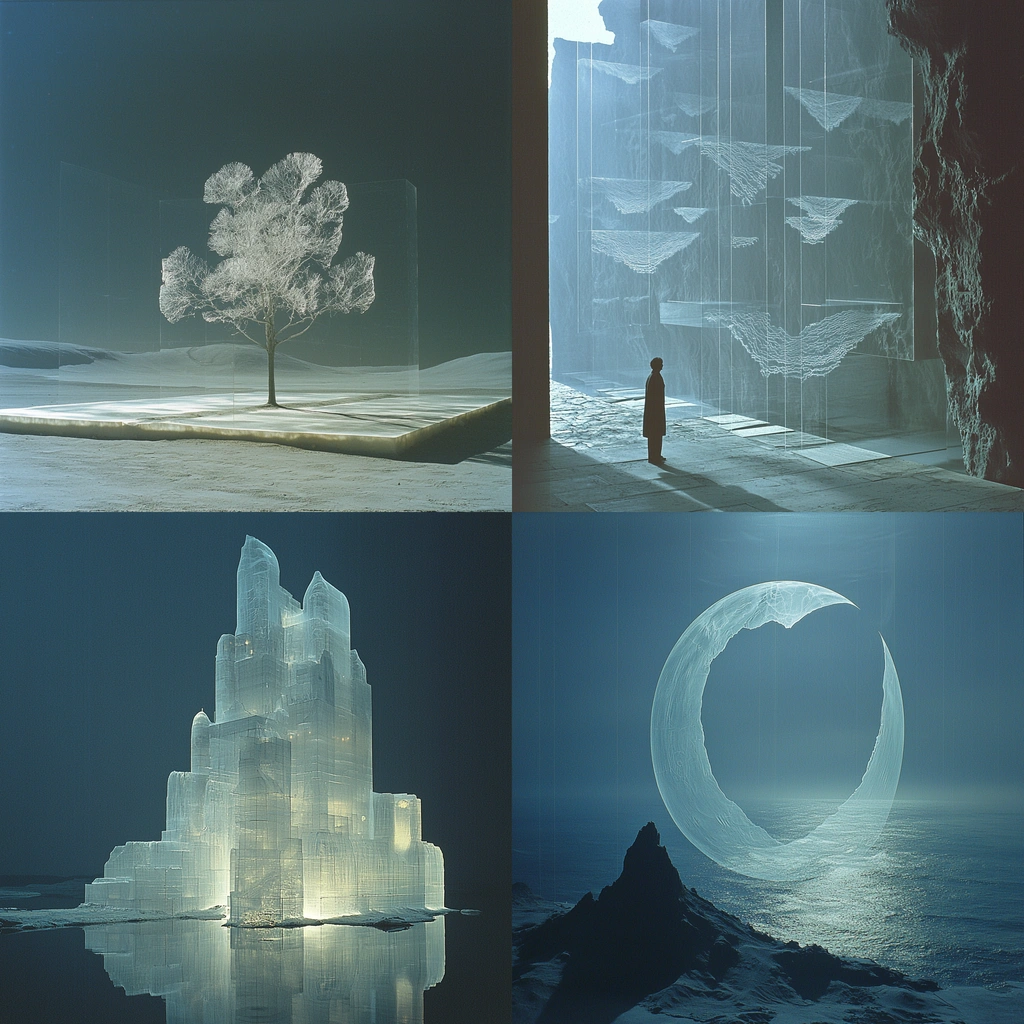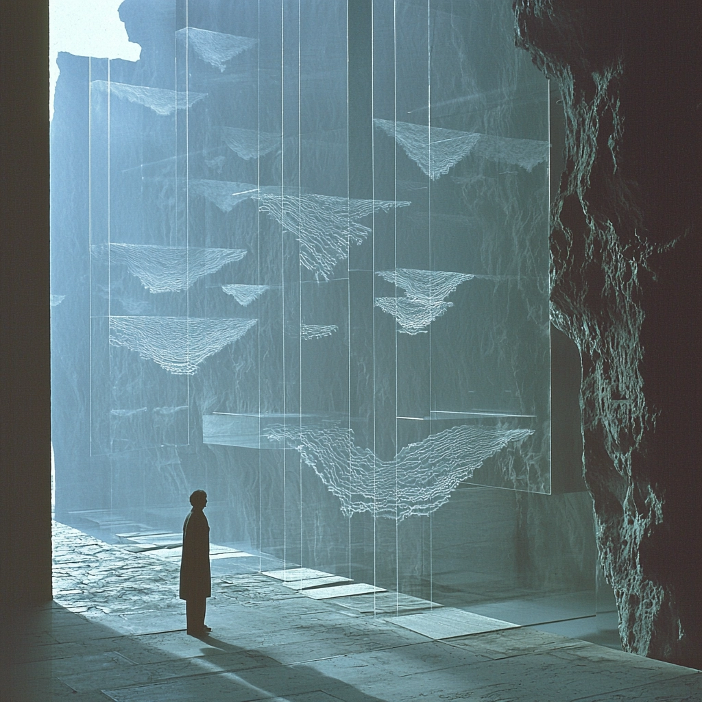 Accentuated by subtle light transitions within a cool-toned palette, the composition creates expansive and serene spaces.