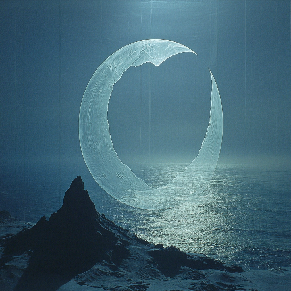 The work exhibits exceptional use of lighting effects, giving prominence to spatial dimensions and soft glow in white, blue, and gray. The textures emphasize fluidity and smooth surfaces, enhancing an ethereal visual experience.