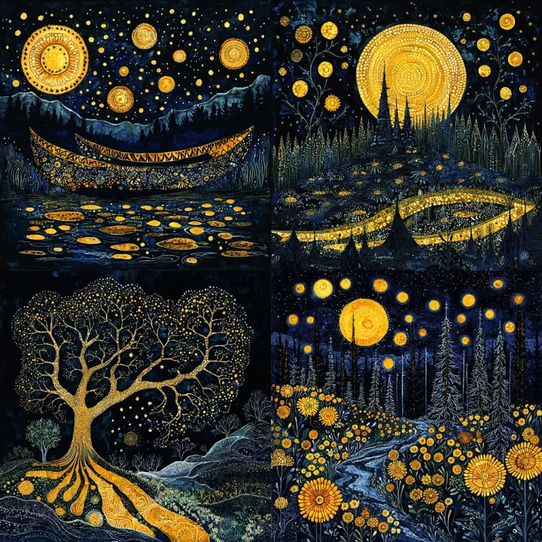 This work features dramatic lighting, with gold elements standing out vividly against deep blue and black backgrounds. The texture is rich, creating a sense of depth and space through careful use of shadow and highlight, enhancing the contrast between open sky and silhouetted forms.