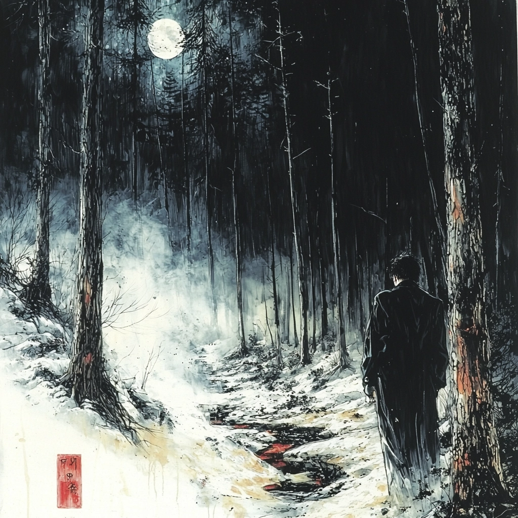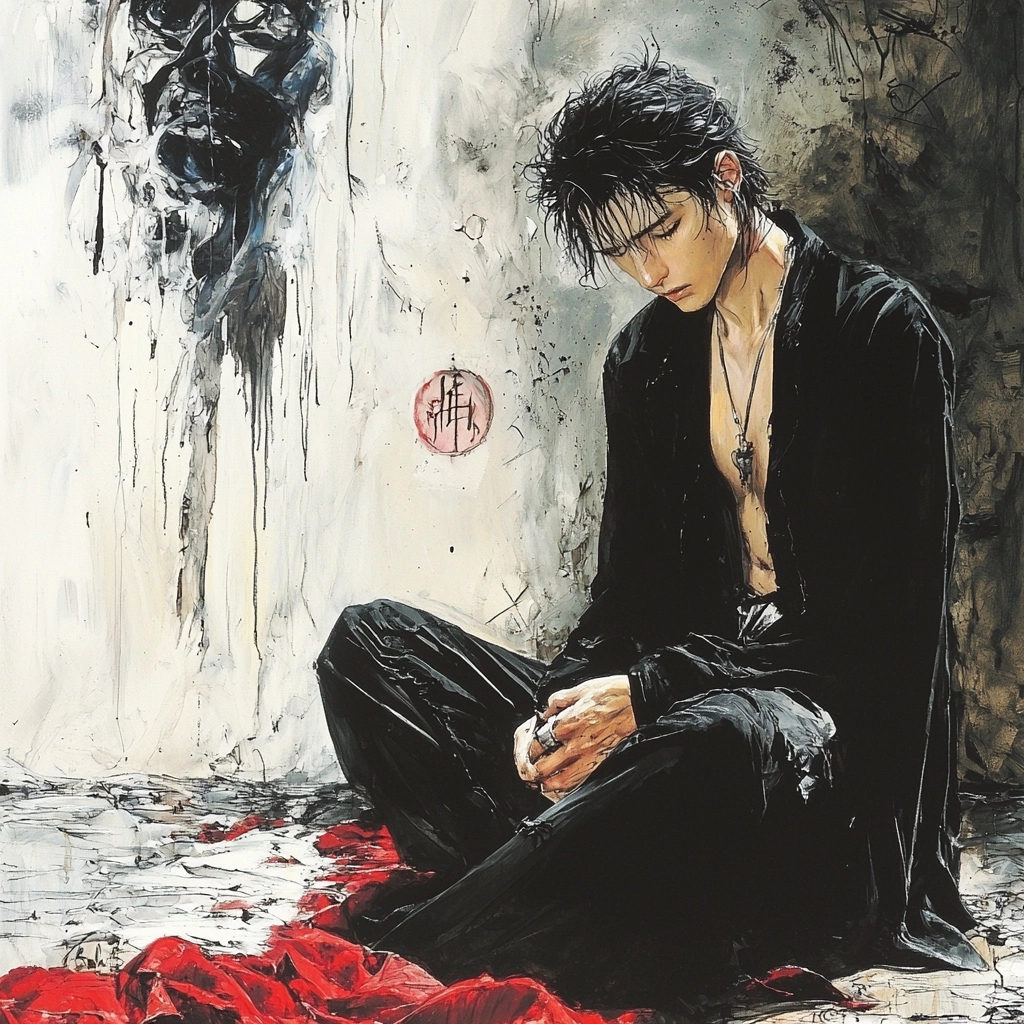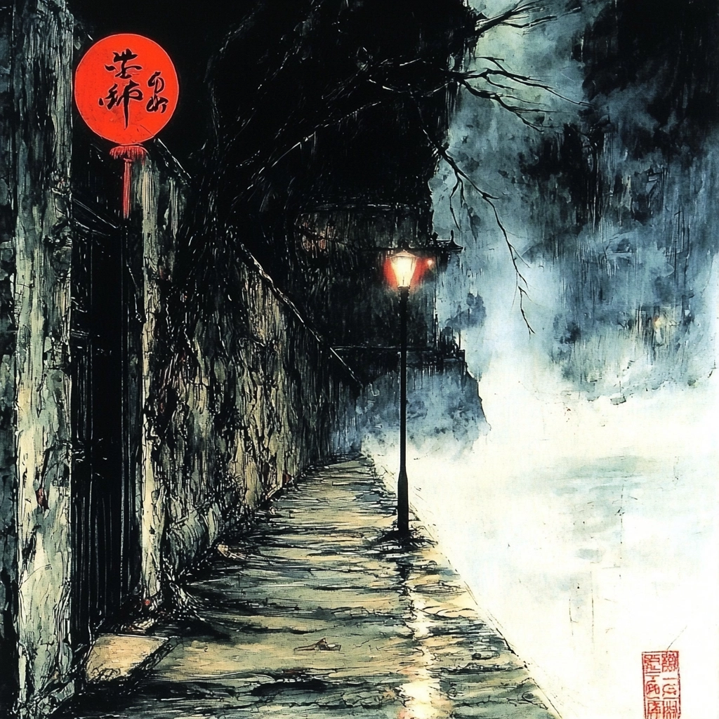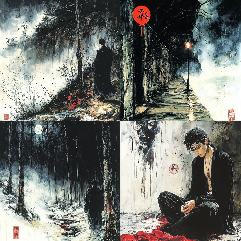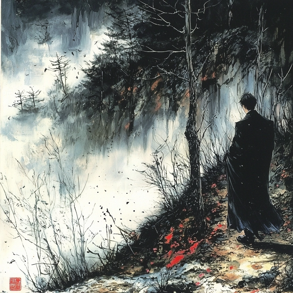 High contrast lighting reveals intricate textures and sharp shadows. Ink's fluidity enhances depth and creates rich, dynamic spatial composition. Subtle use of red adds a striking element and emotional depth.