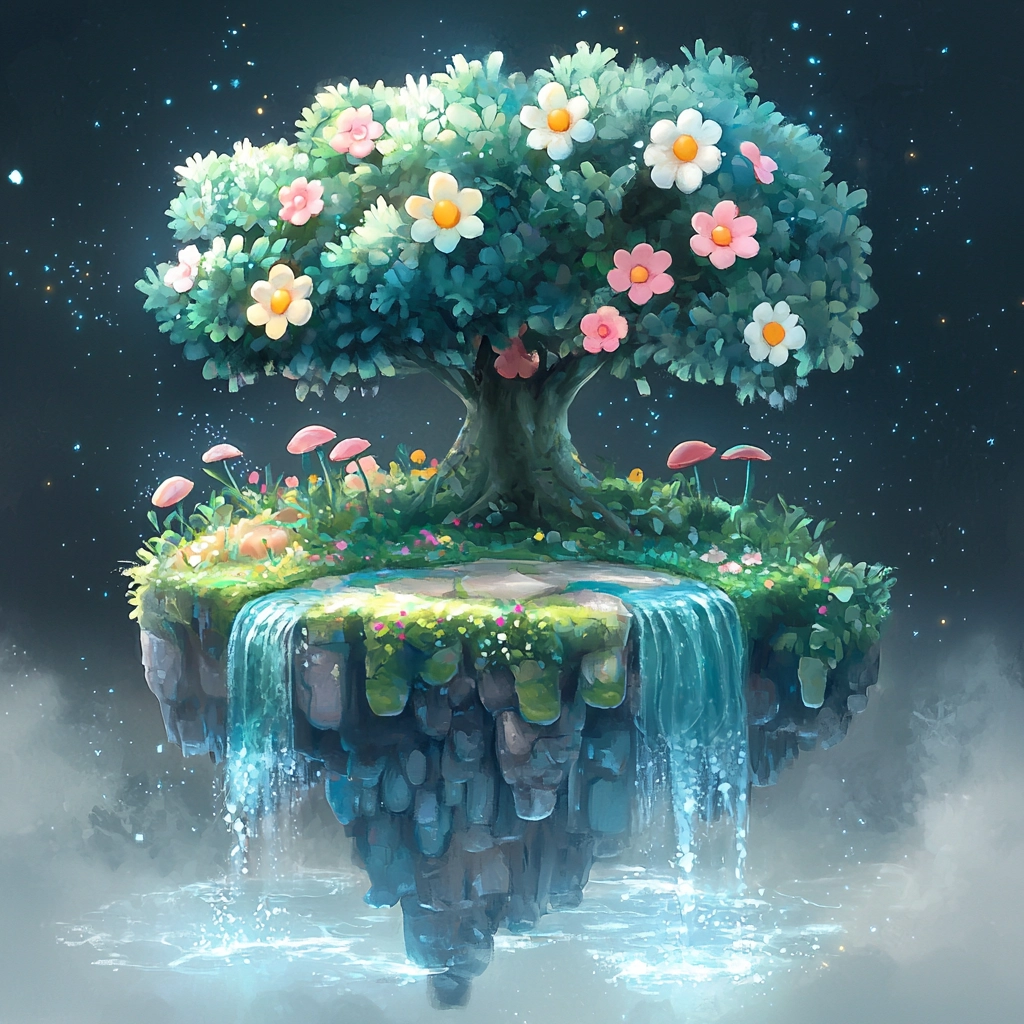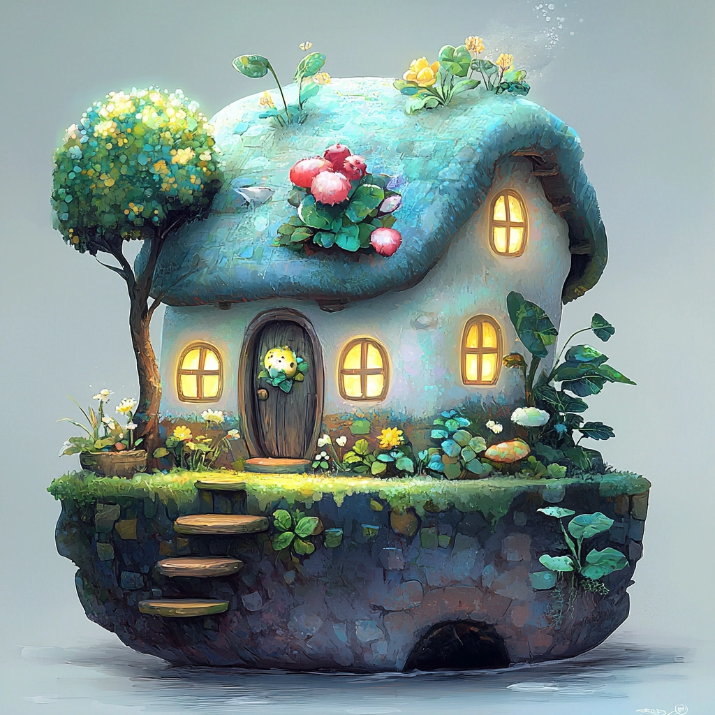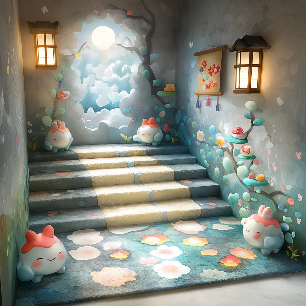 Soft diffused lighting creates a gentle and inviting atmosphere. Pastel colors enhance the charm, with whimsical spatial settings. Smooth textures suggest a polished yet delicate finish.