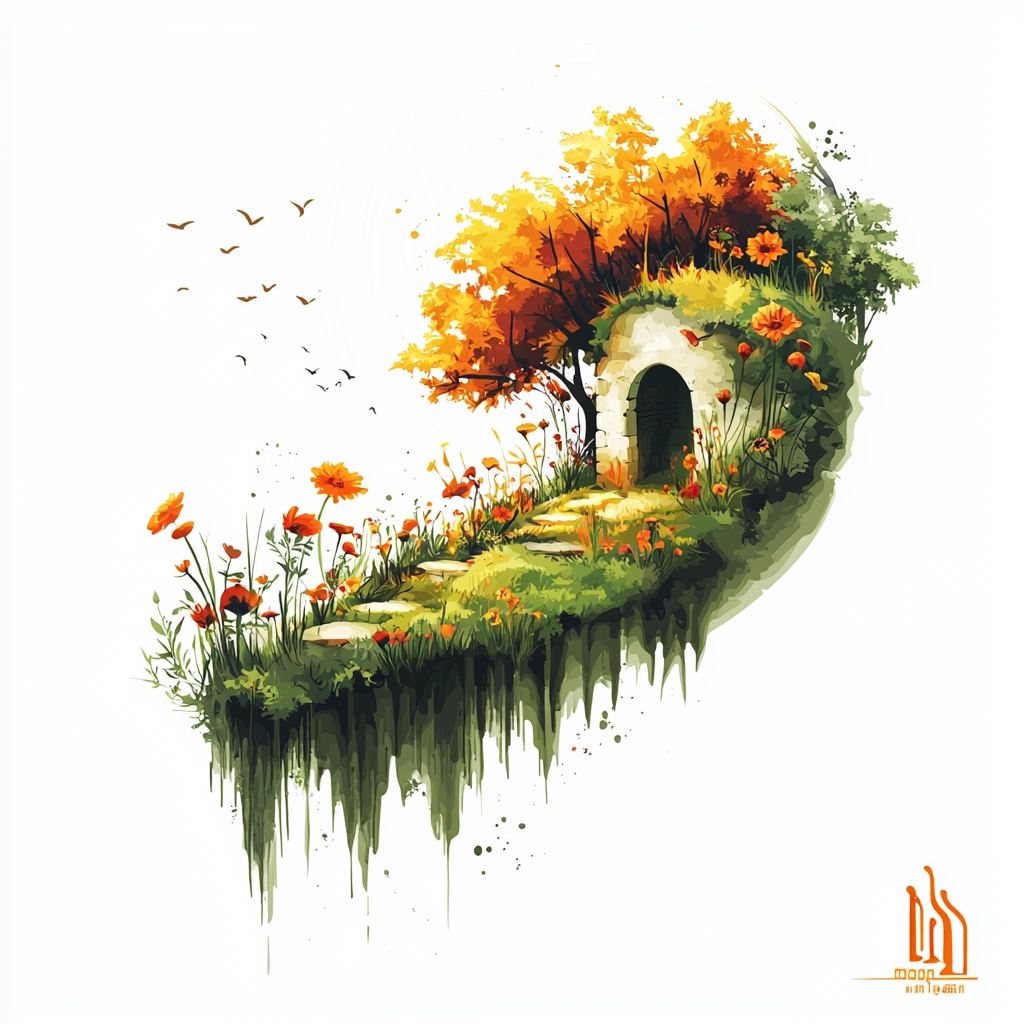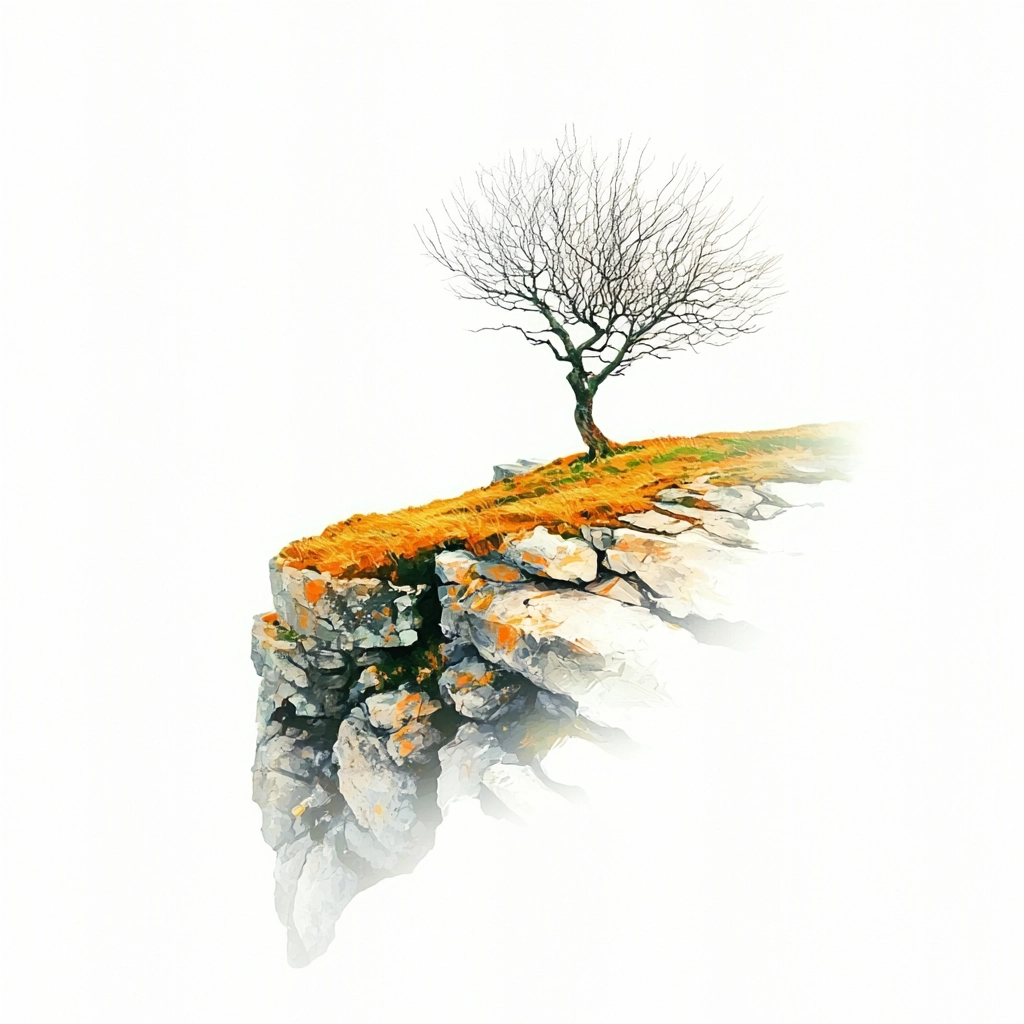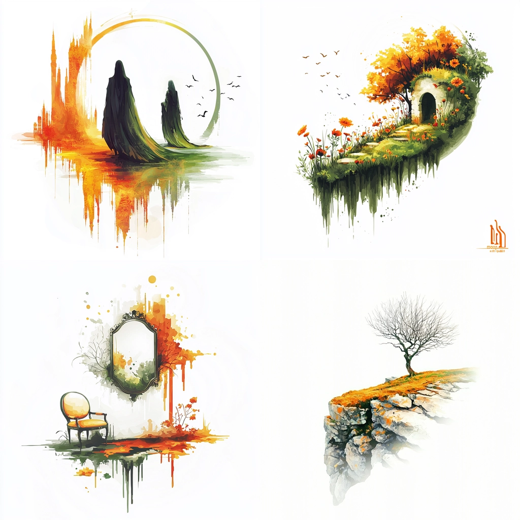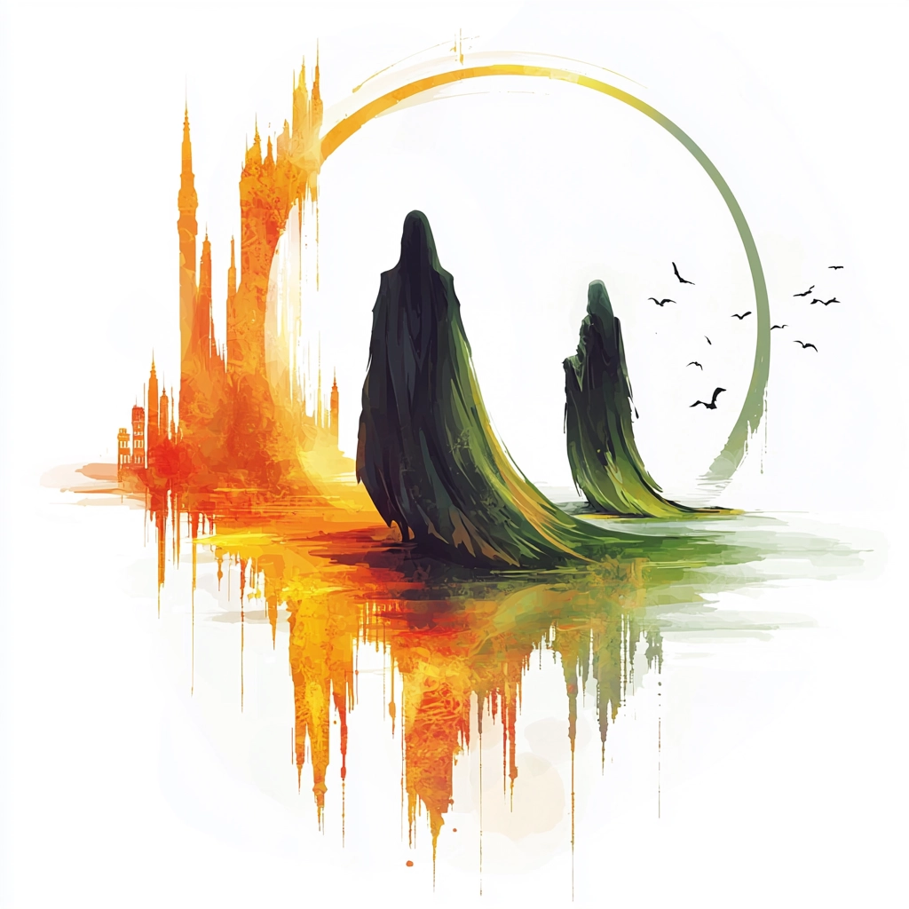 Dynamic interplay of vibrant orange and green hues with delicate ink line work, creating an impactful composition on a white background.